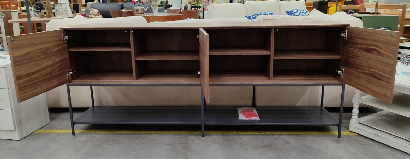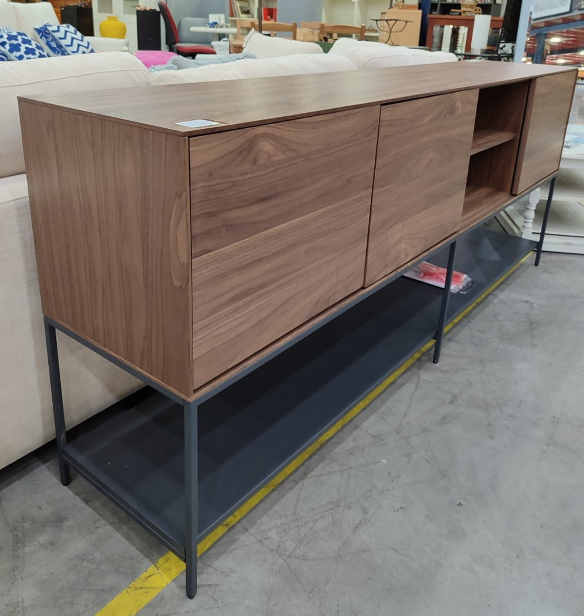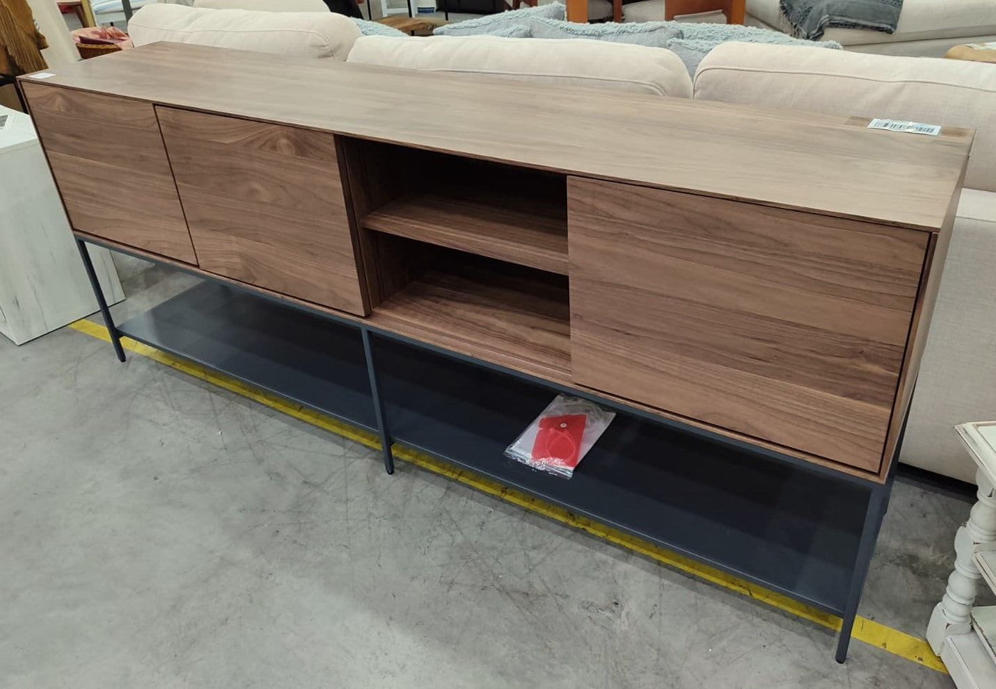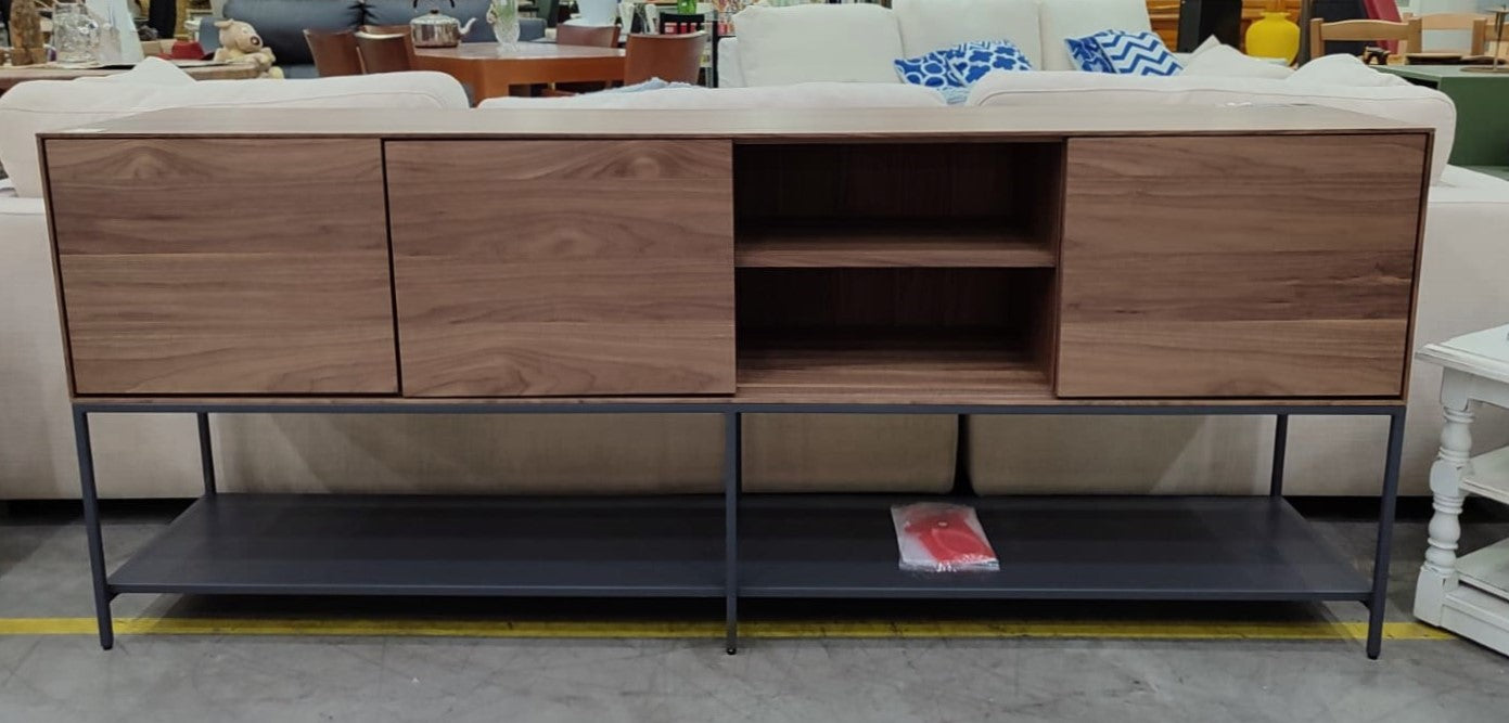 Descripción Aparador hecho de chapa de nogal. 3 puertas con apertura a presión y bisagras de cierre suave. Patas de acero regulables con acabado pintado en color antracita mate. Bandeja multiusos en la parte inferior. Defectos: Uno de los laterales se montó al revés, pero no está mal, únicamente que la chapita de la marca queda al revés. Tiene un pequeño rasguño en el interior de una de las puertas.