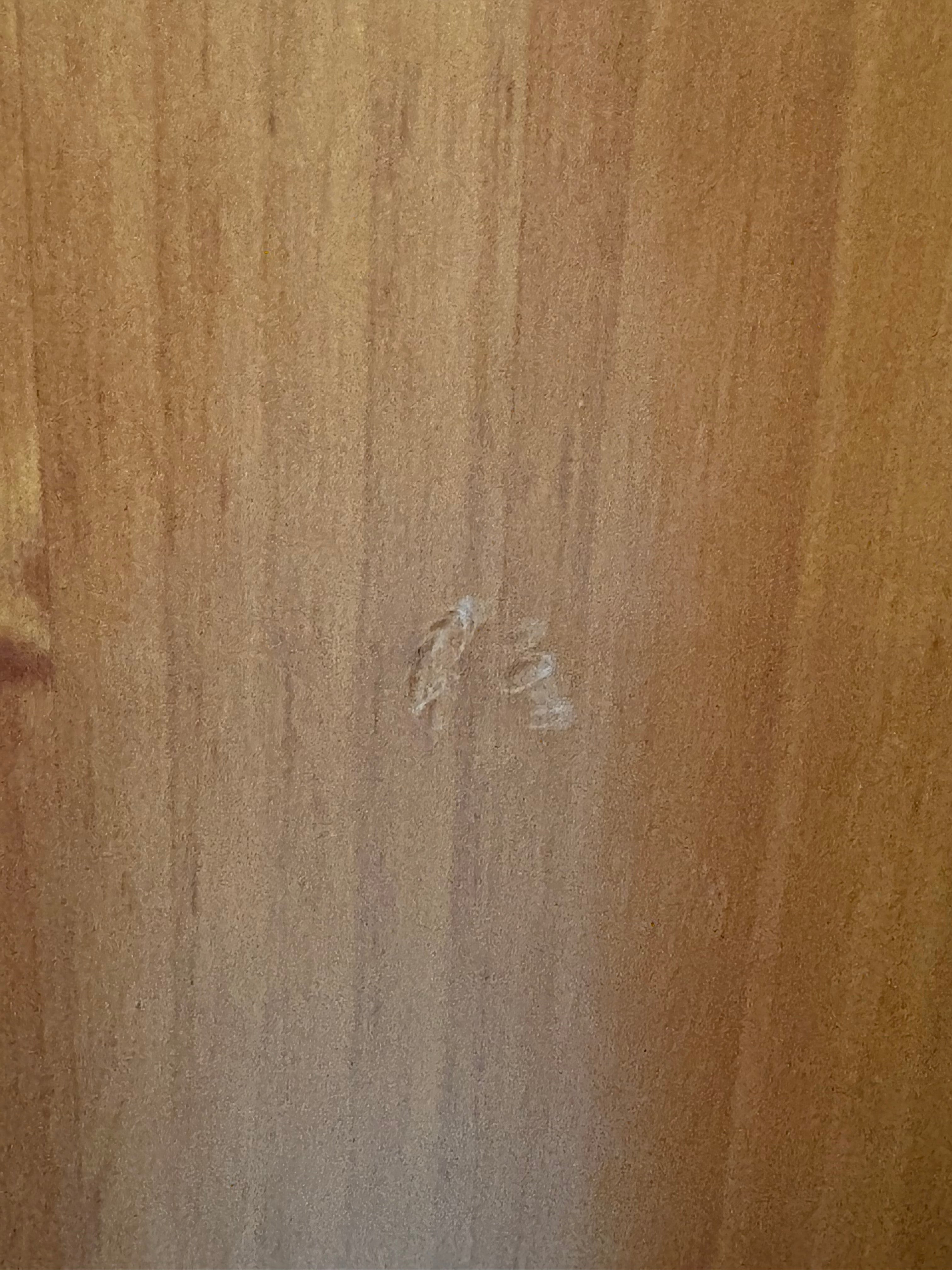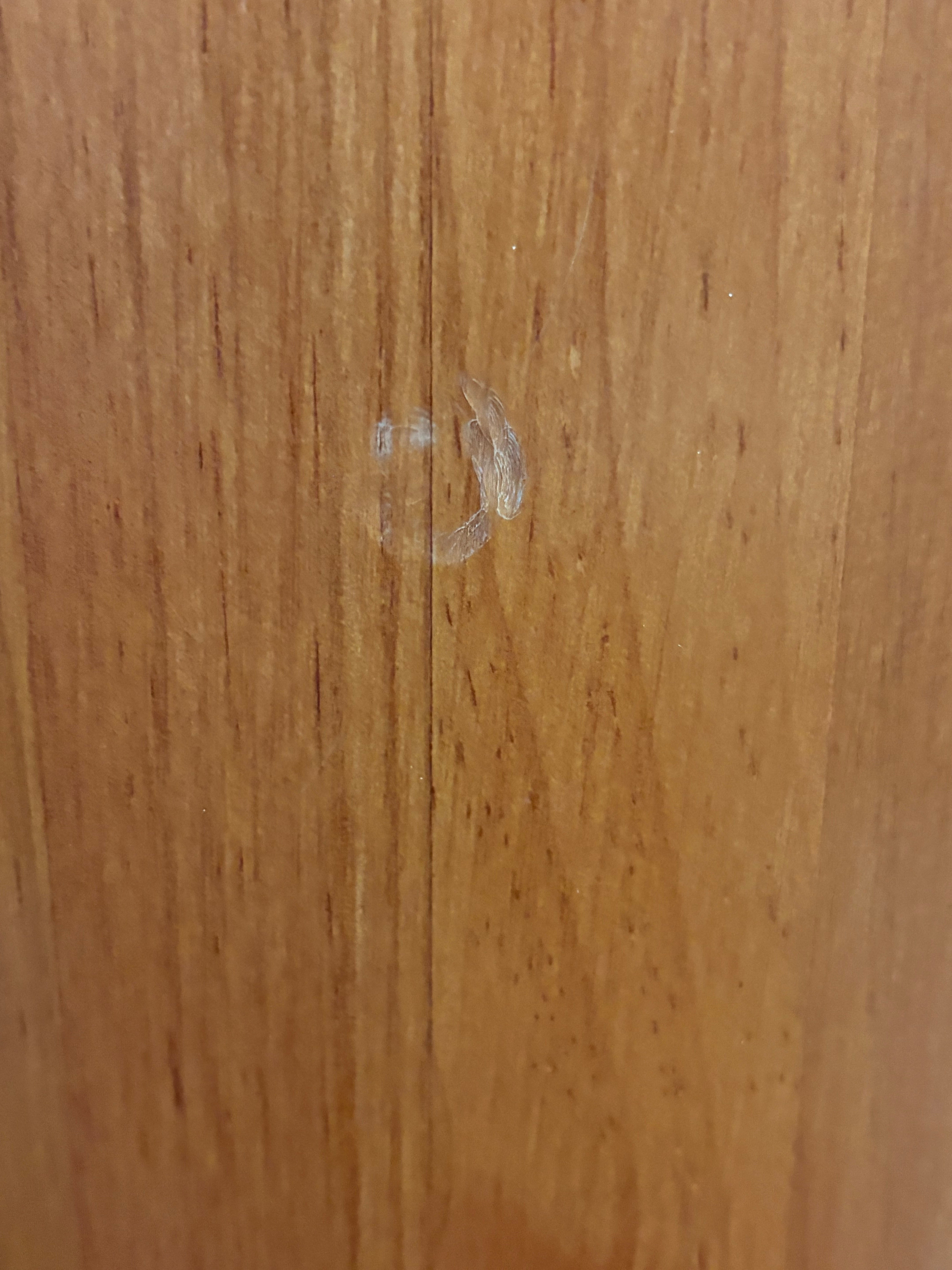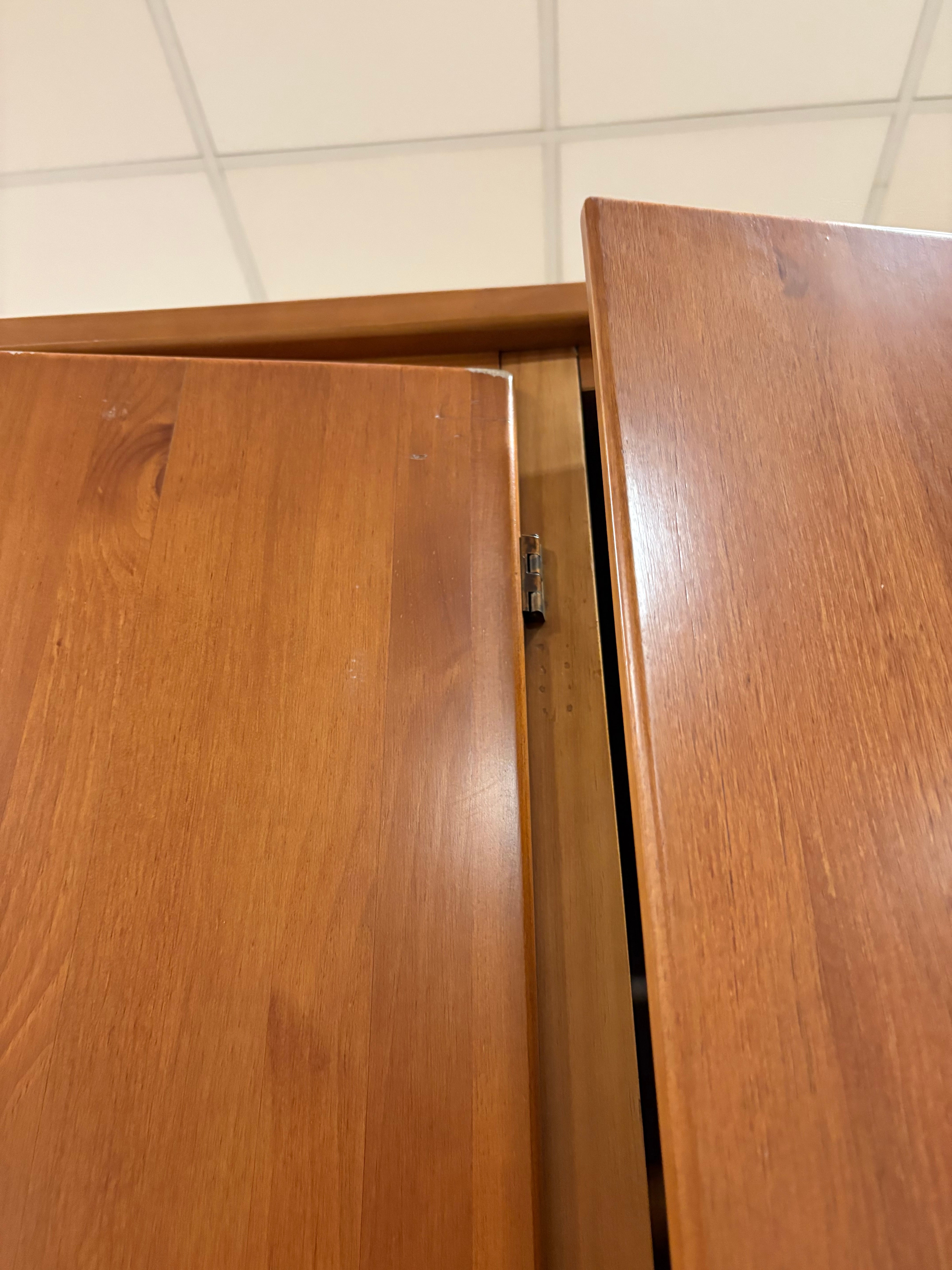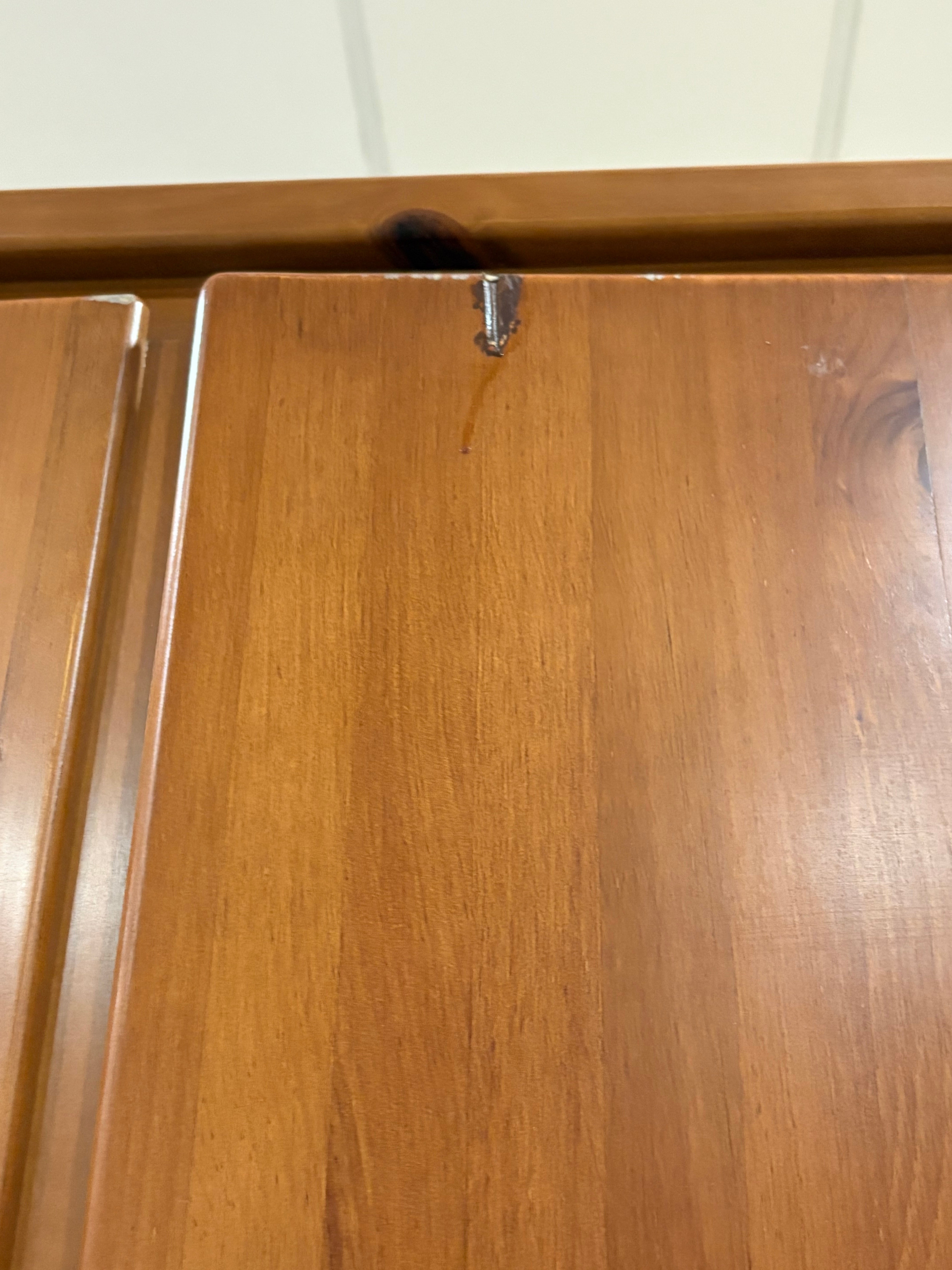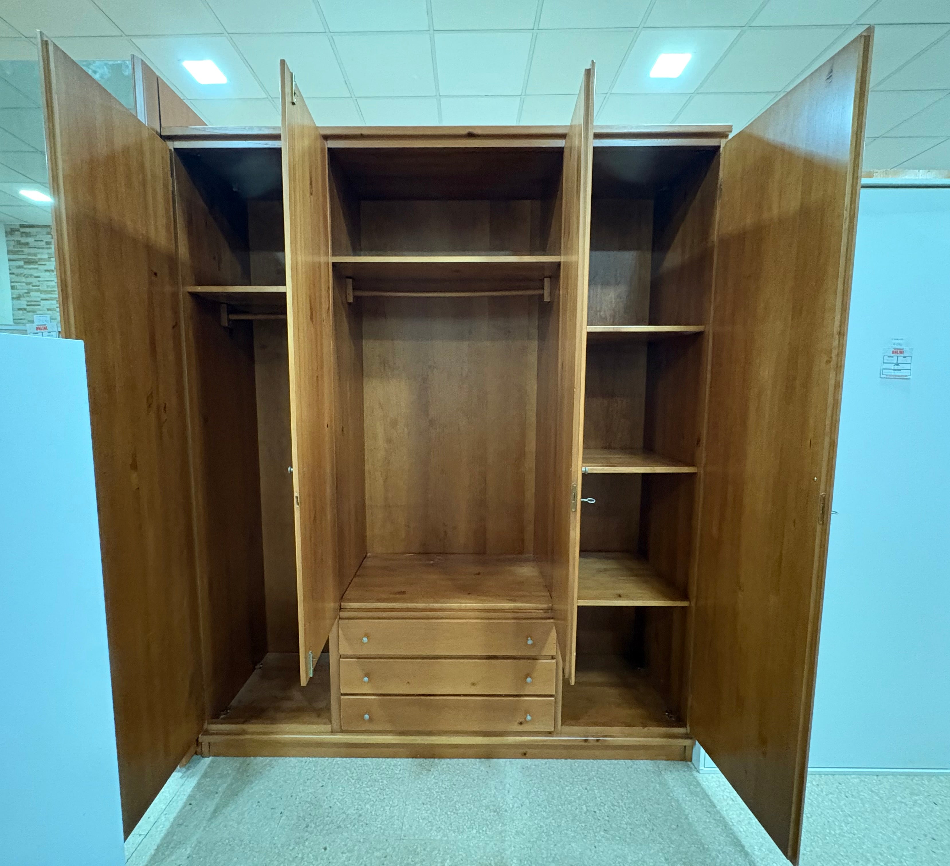 Descripción Armario de madera con cuatro puertas y espacio de almacenamiento. Amplio interior con barra para colgar. Cajones inferiores para organización. Estantes interiores para doblar ropa. Presenta defectos visibles en fotografías.