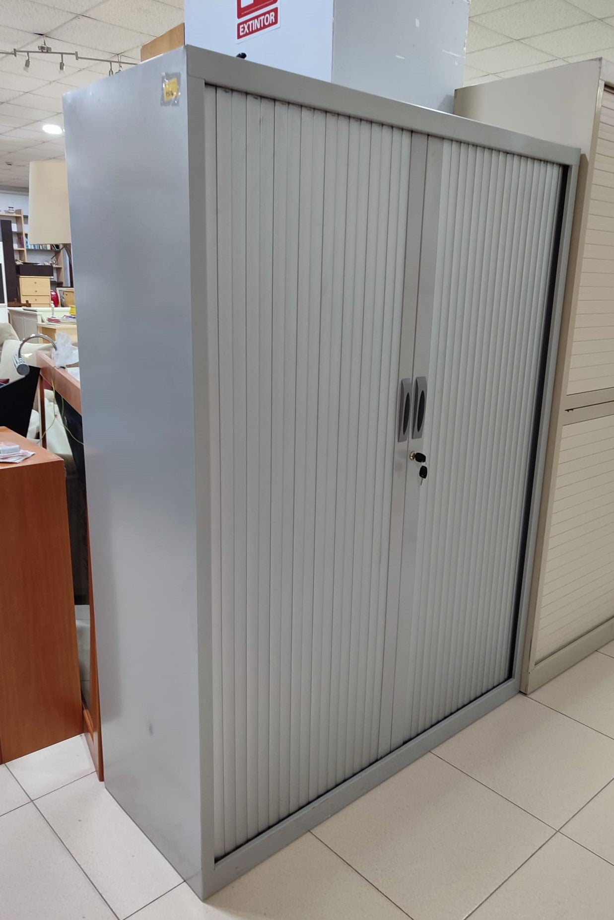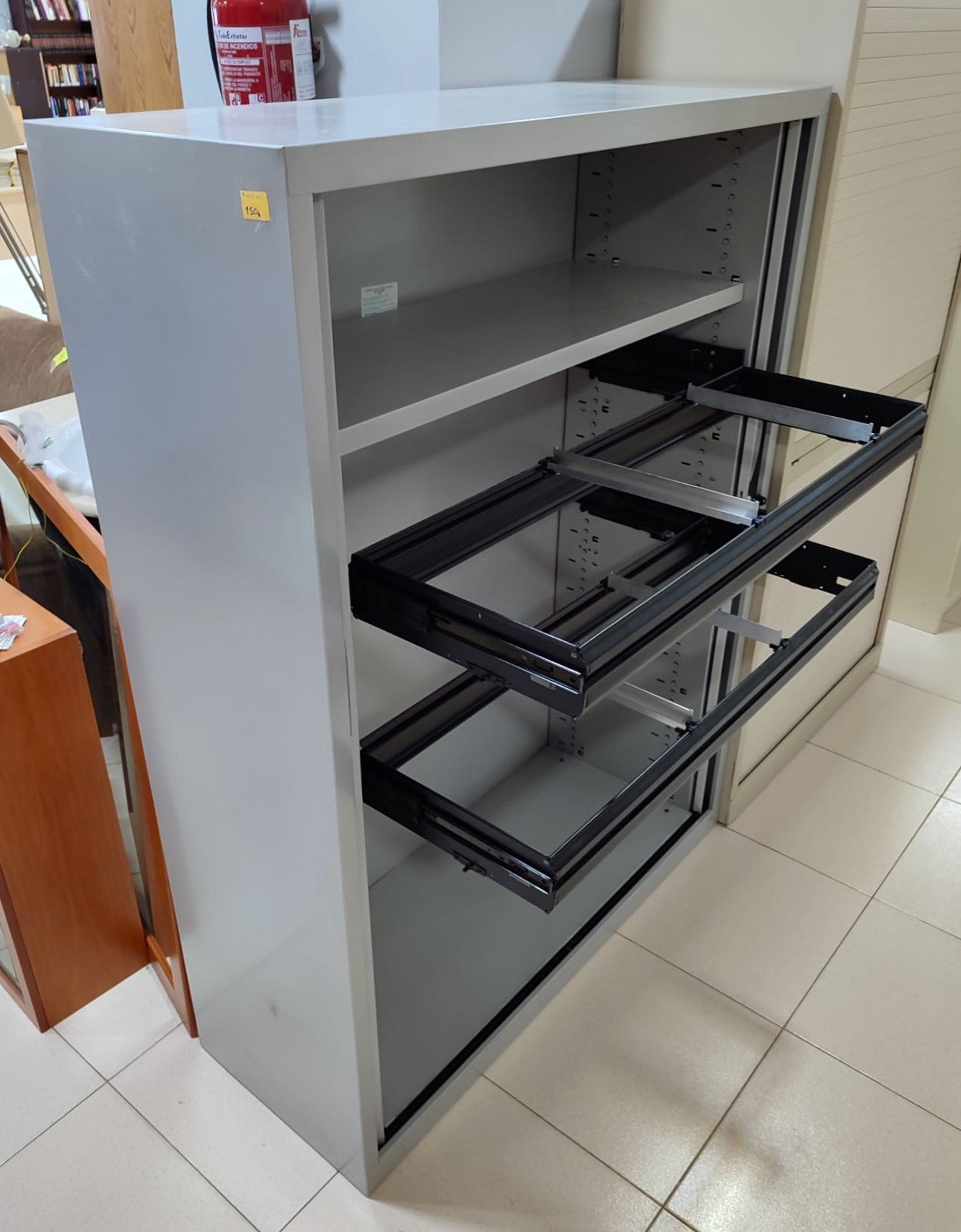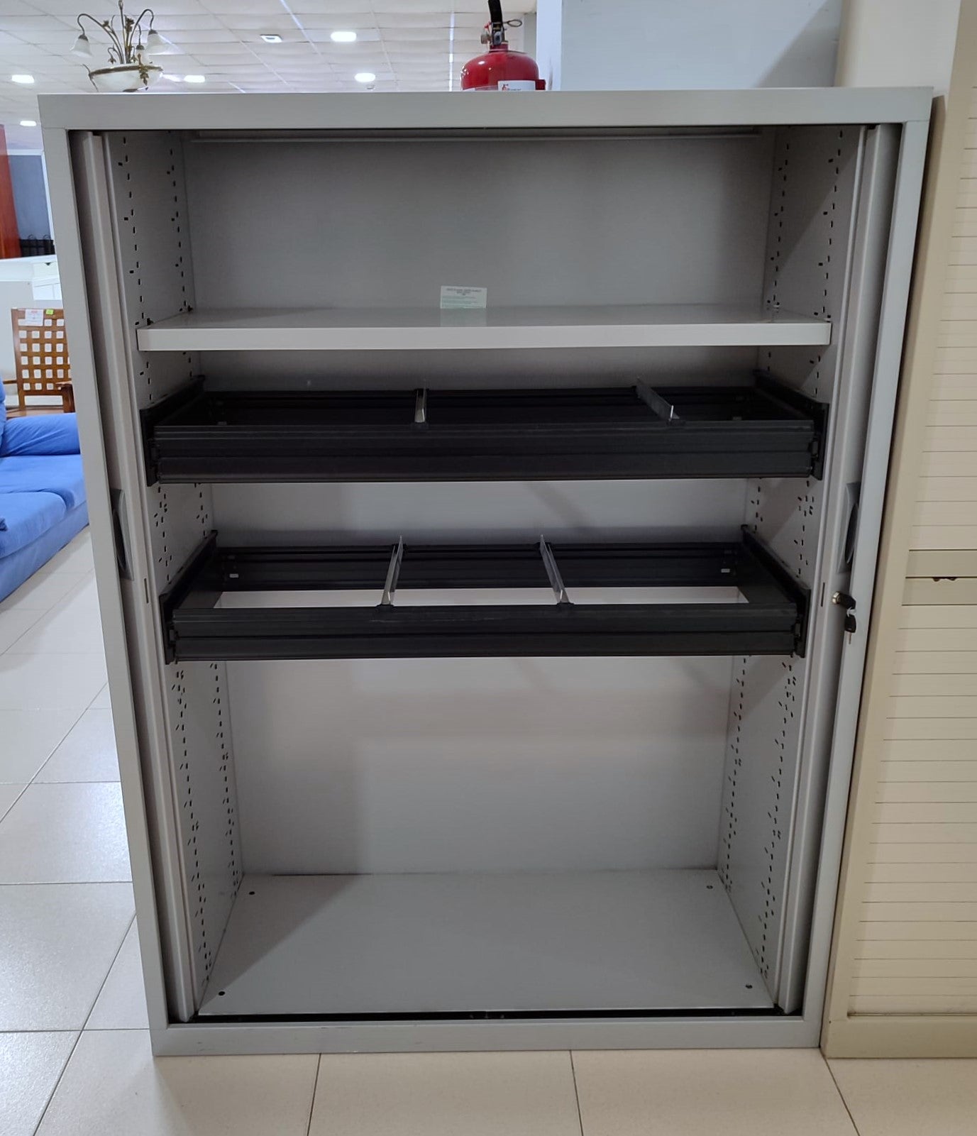 Descripción Armario archivador con estructura de chapa de acero resistente Puertas tipo persiana con cerradura y juego de llaves incluido. Cuenta con cajones con guías metálicas extraíbles, ideales para guardar carpetas colgantes A4 o folio. Balda interior de altura ajustable. Defecto: El interior está un poco rayado.