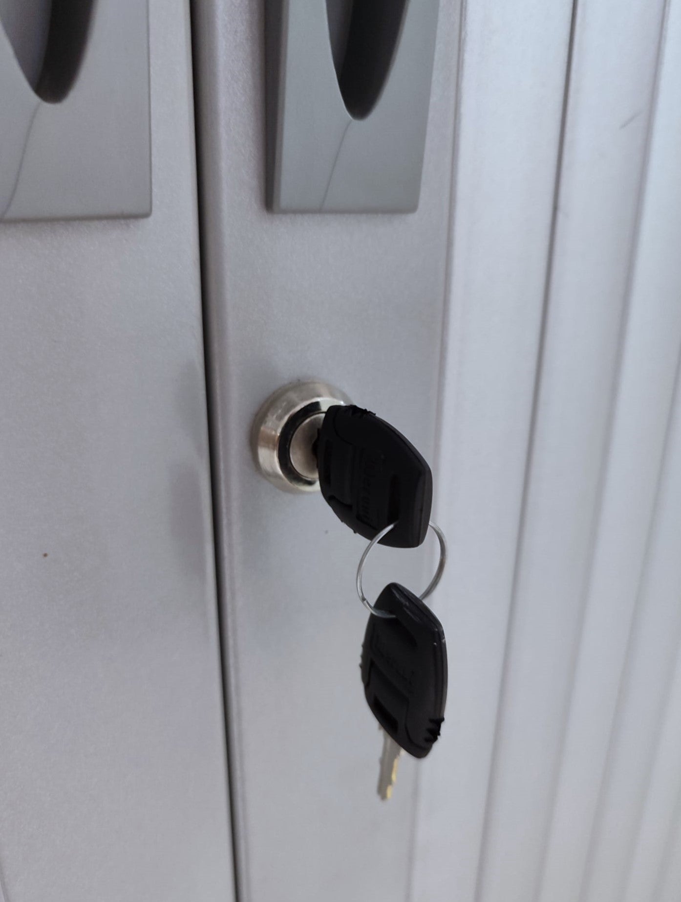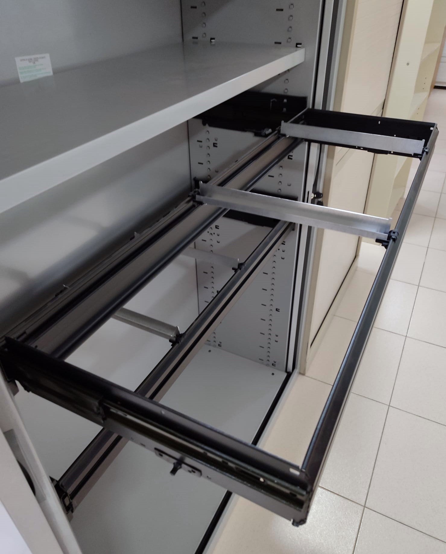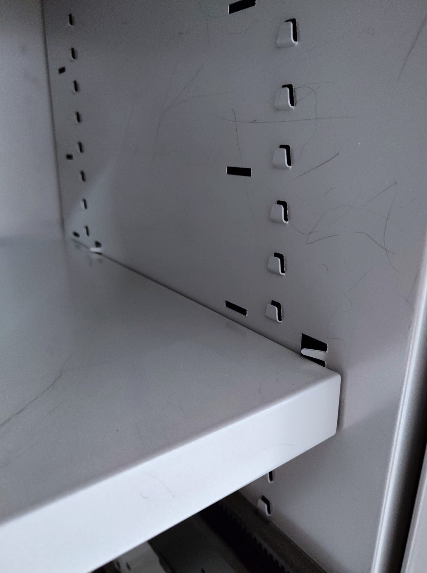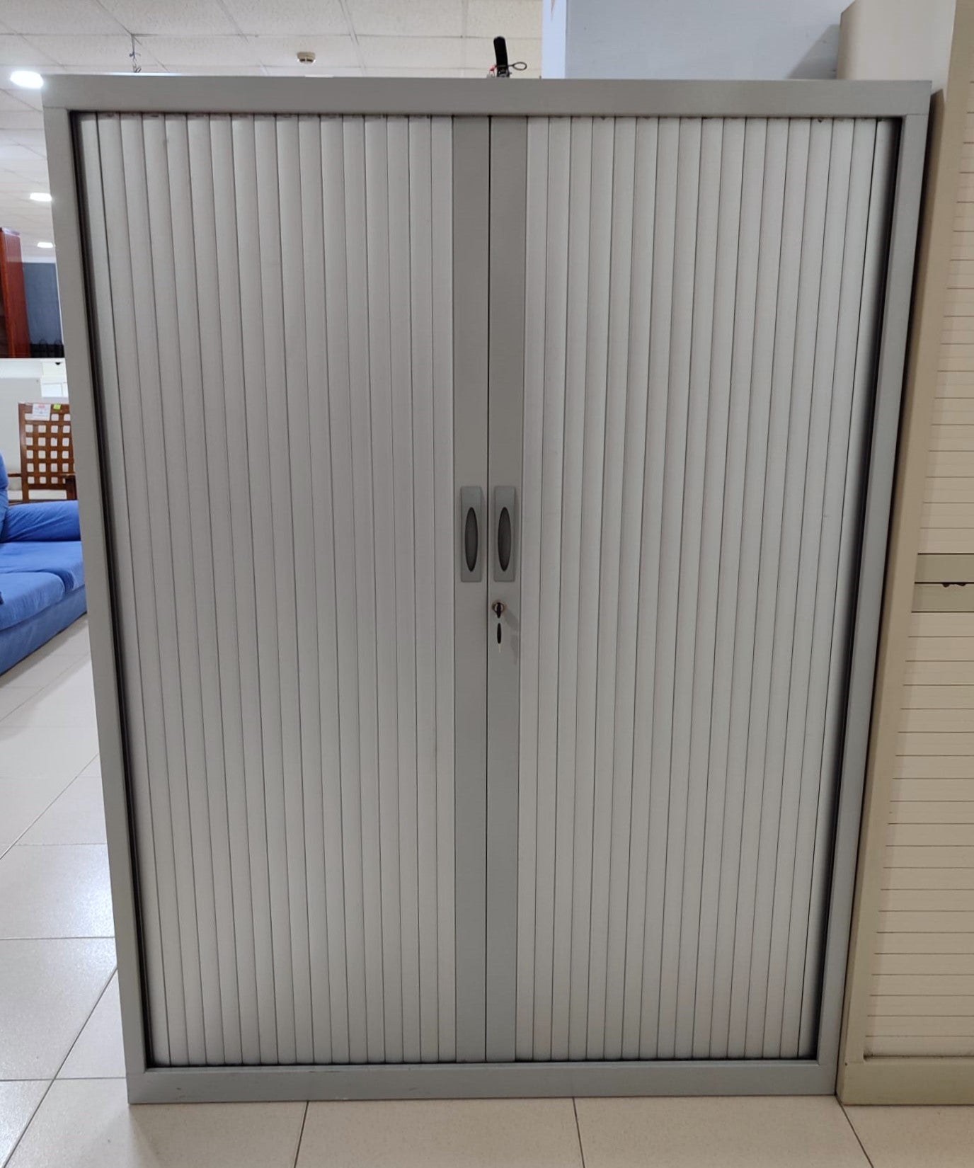Descripción Armario archivador con estructura de chapa de acero resistente Puertas tipo persiana con cerradura y juego de llaves incluido. Cuenta con cajones con guías metálicas extraíbles, ideales para guardar carpetas colgantes A4 o folio. Balda interior de altura ajustable. Defecto: El interior está un poco rayado.