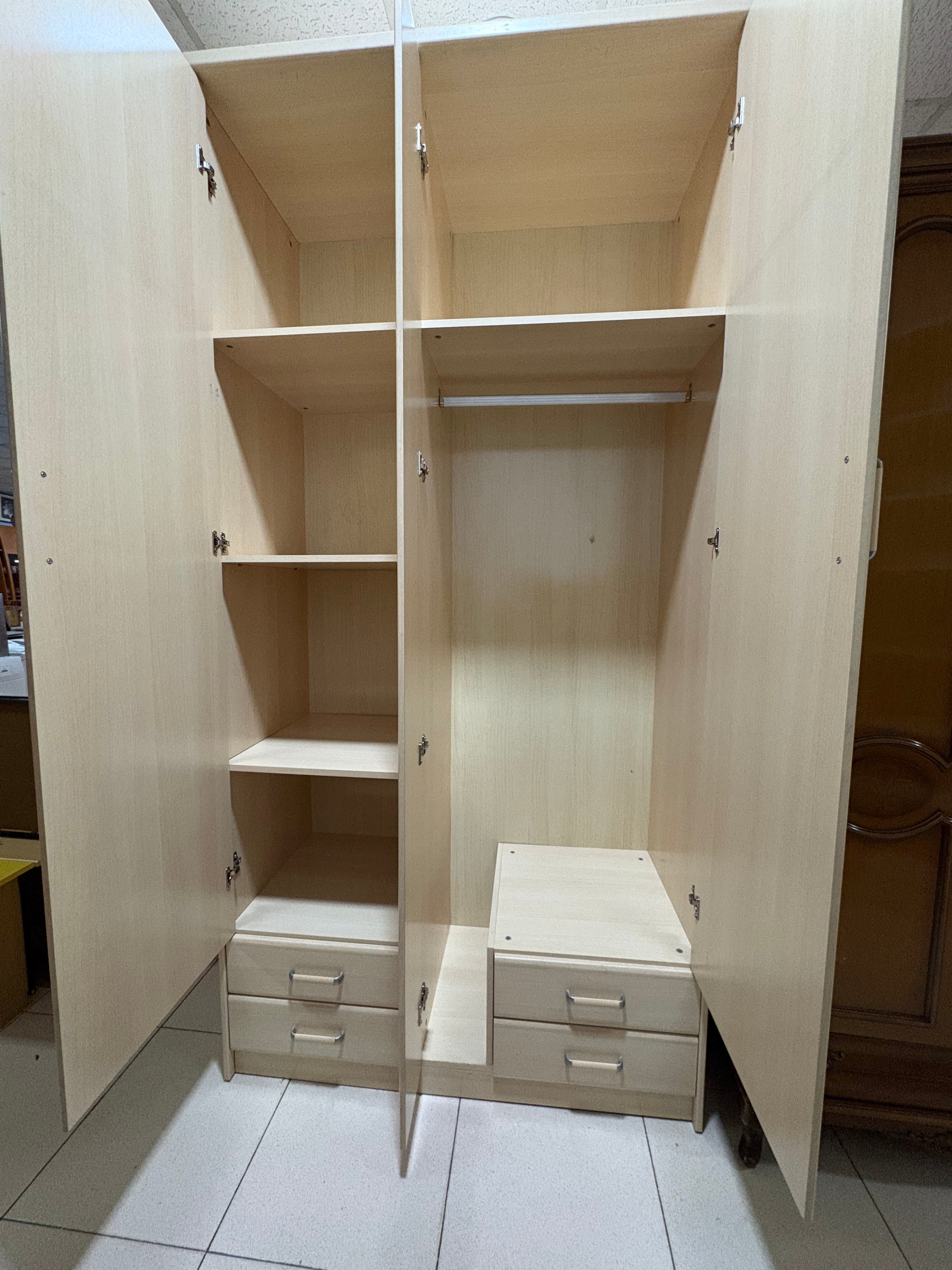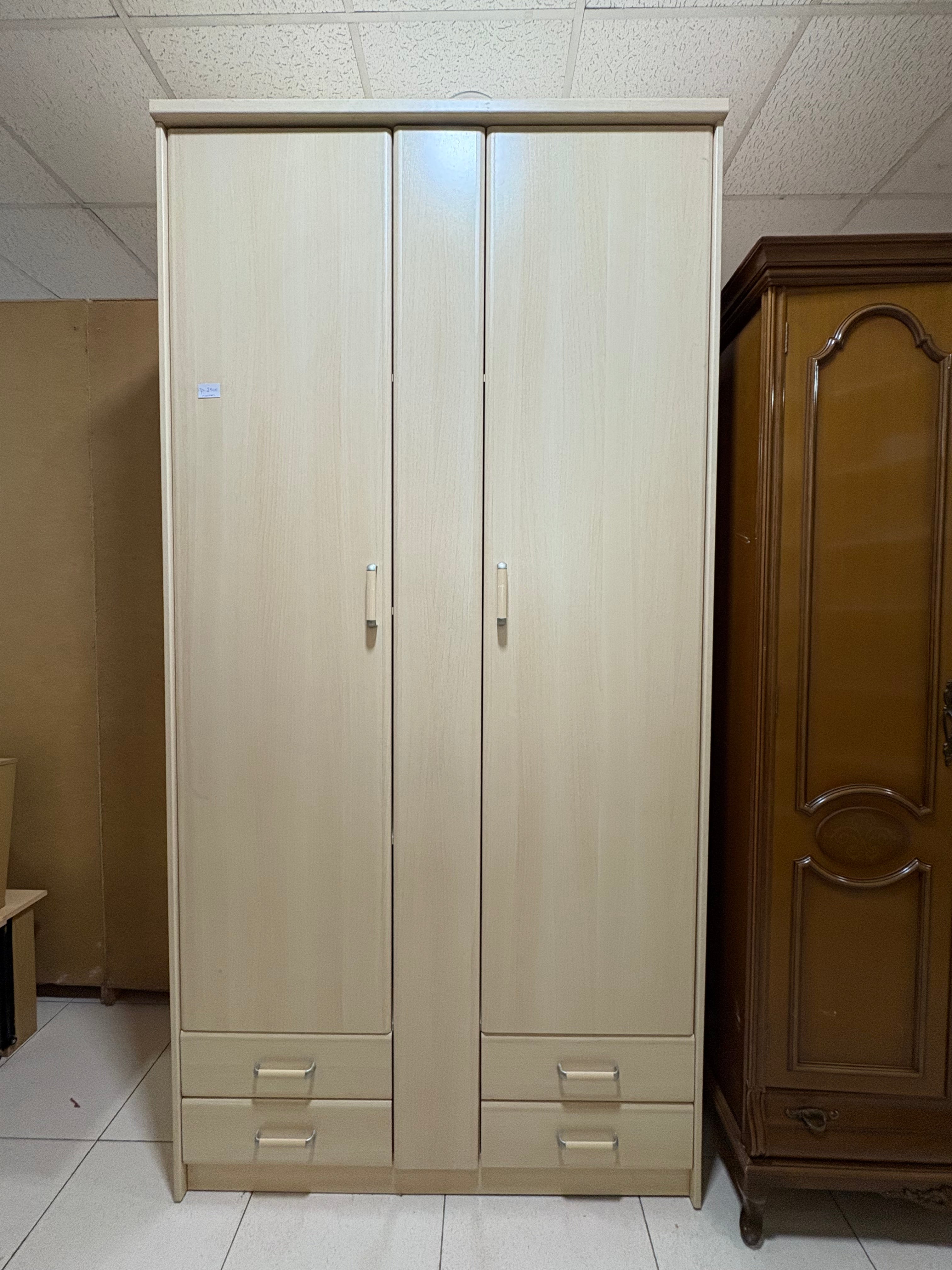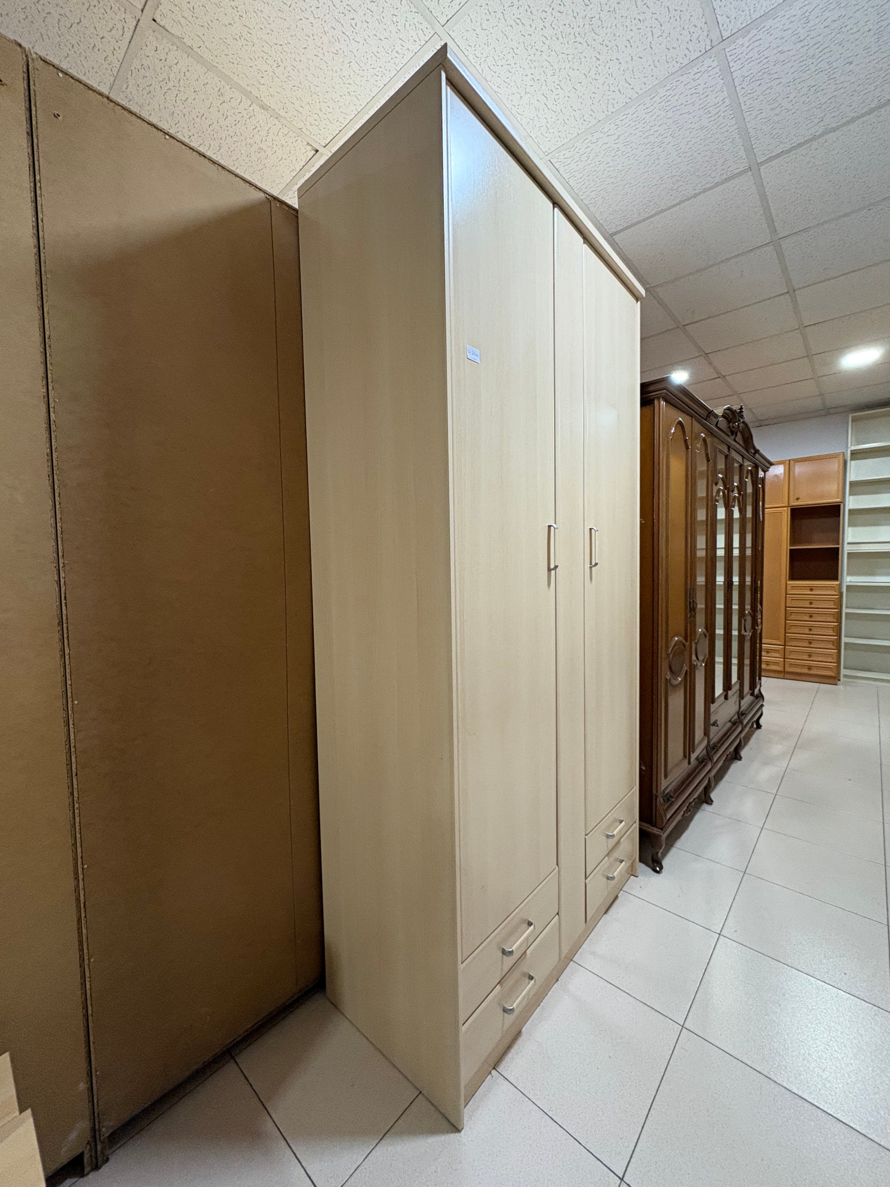 Armario de tres puertas y cuatro cajones en la parte inferior. Su diseño es sencillo y funcional.