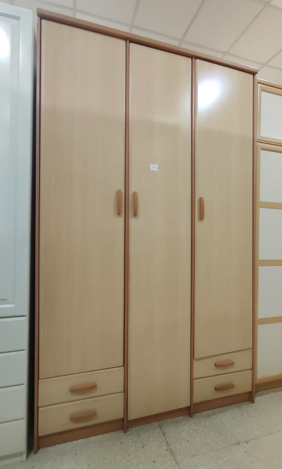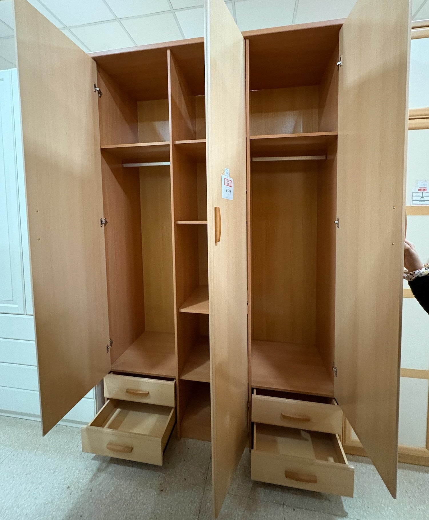 - Secciones laterales gemelas con altillo, barra para ropa y dos cajones bajos cada una.