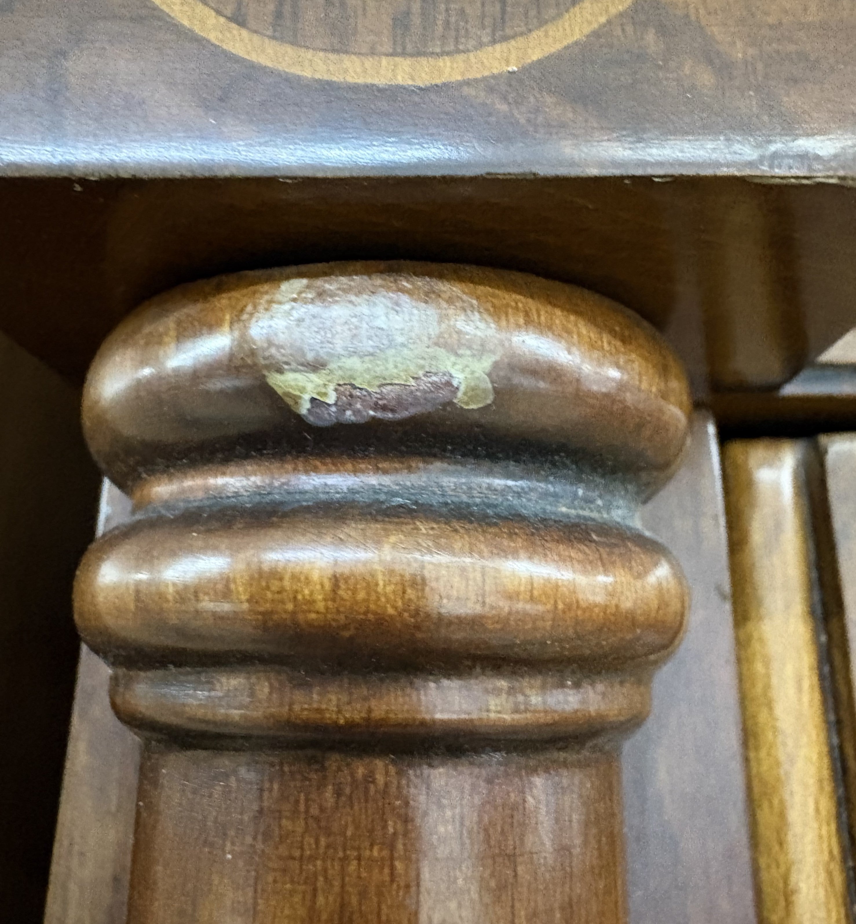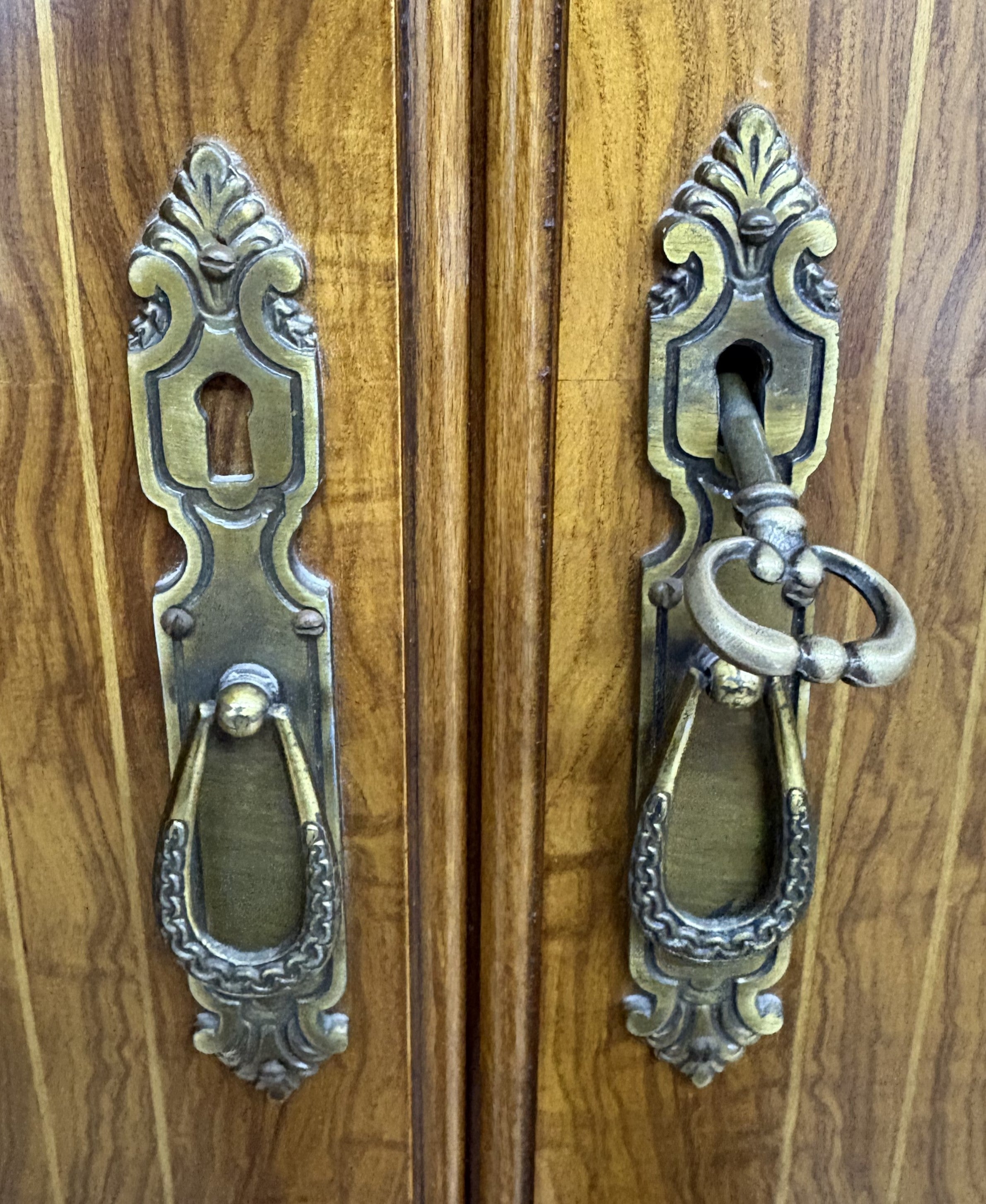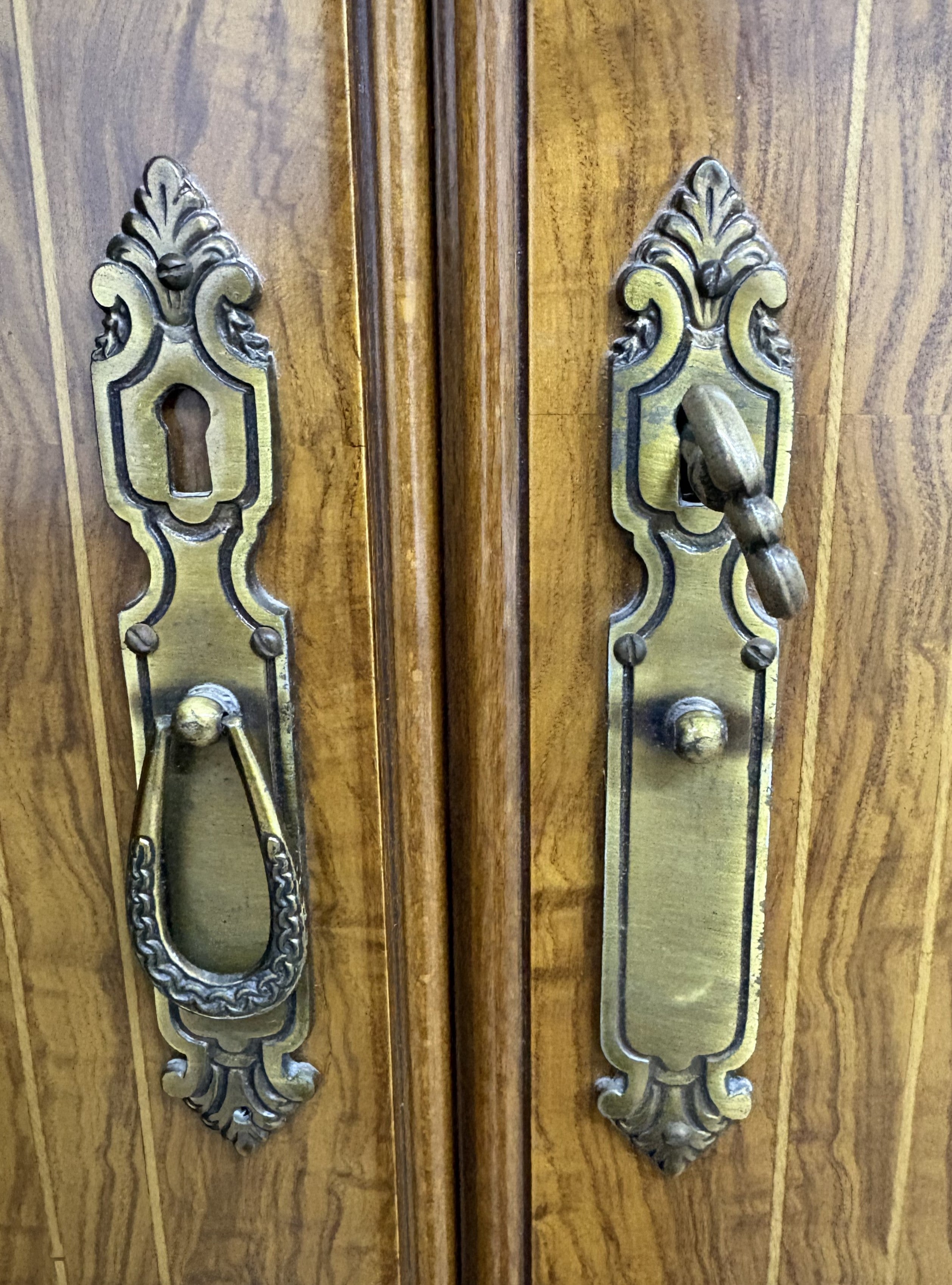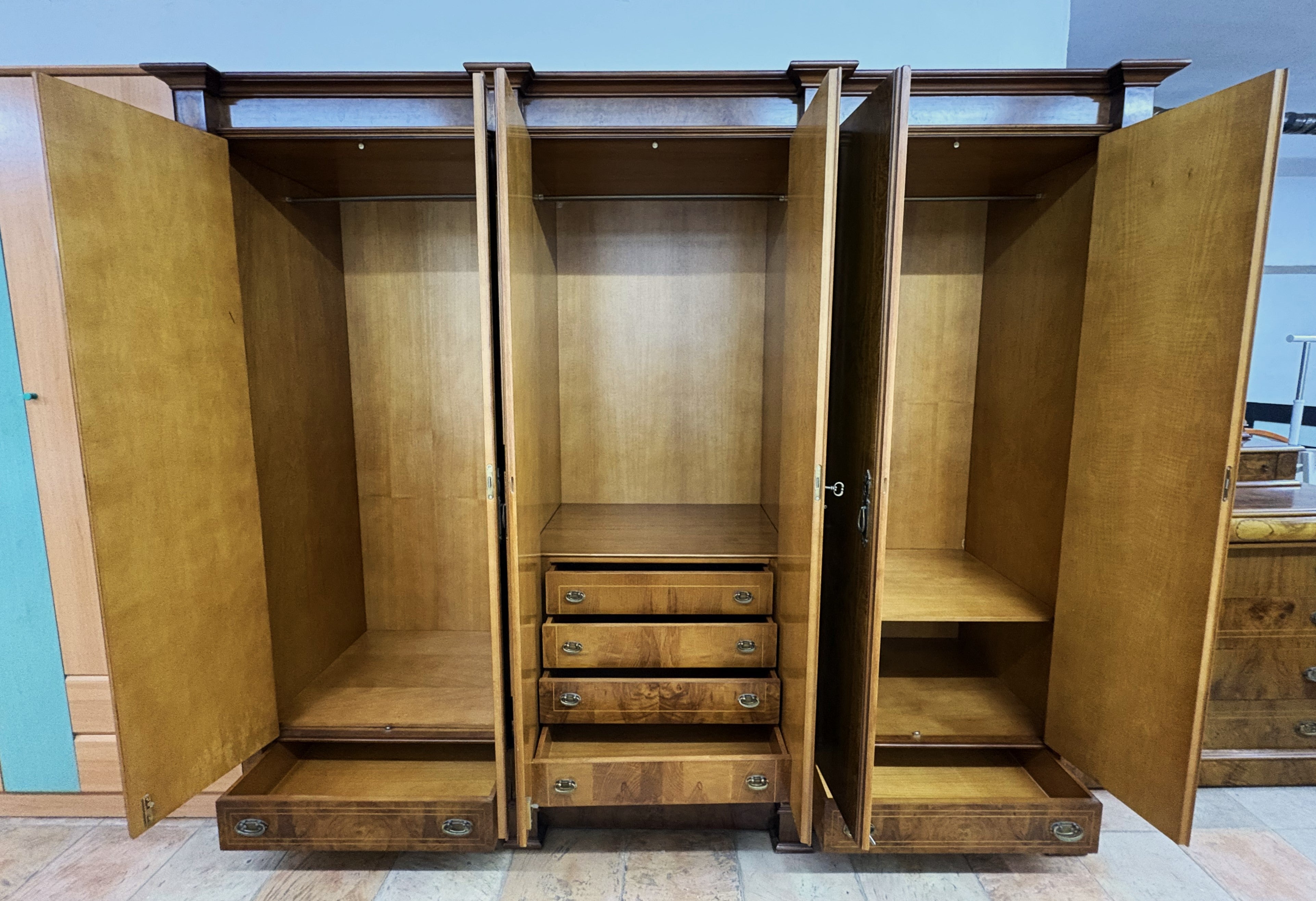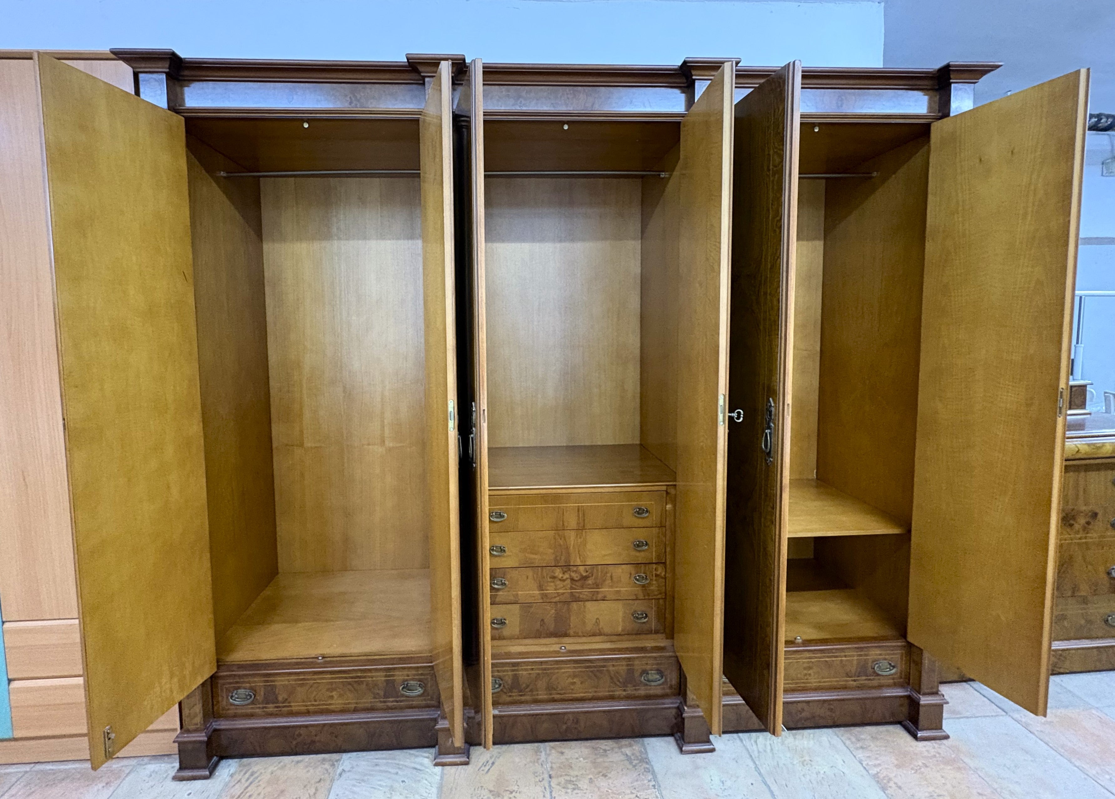 Descripción Armario de tres secciones hecho de madera chapada en nogal. Macizo y de estilo clásico. Ornamentos y marquetería fina y elegante, típicos de muebles vintage. Seis puertas abatibles con cerradura y llave incluida. Sección izquierda con ropero amplio y un cajón ancho. Sección central con barra para ropa y cinco cajones multiusos. Sección derecha con barra para ropa, un compartimento y un pequeño cajón auxiliar. Defecto: La capa de melamina interna está un poco rota en una de las secciones, ver foto. A una de las puertas le falta la argolla del tirador y otra tiene un gancho metálico para mantenerla cerrada.
