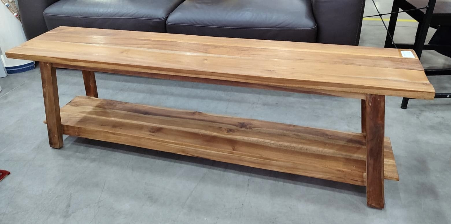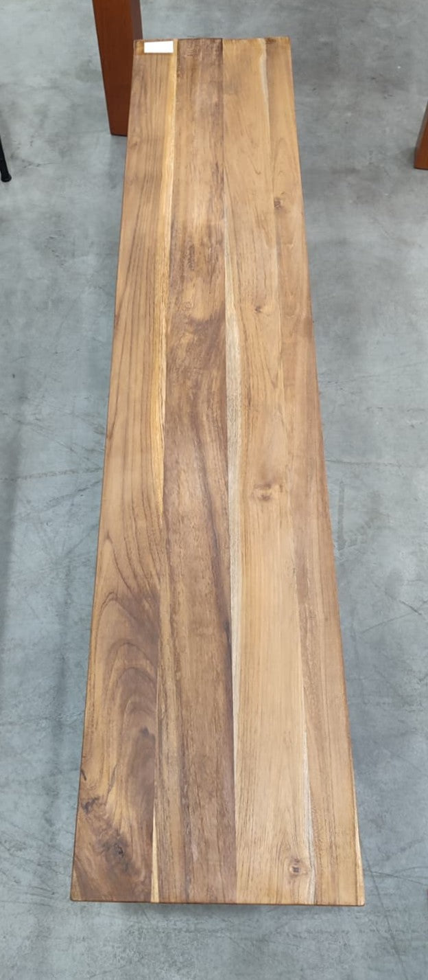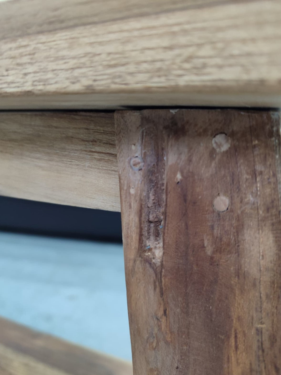 Descripción Banco de madera maciza de teca. Hecho con materiales naturales. Superficie reposapiés bajo el asiento. Apto para interiores y exteriores cubiertos. Defecto: Al ser hecho de materiales naturales, una de las patas tiene una imperfección estética no visible ni perjudicial para la estructura ni el uso del mueble. ver foto.