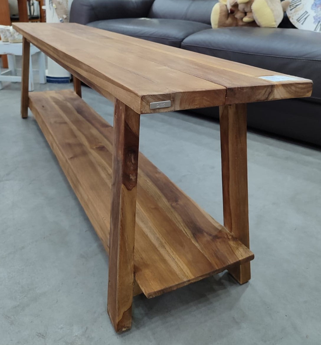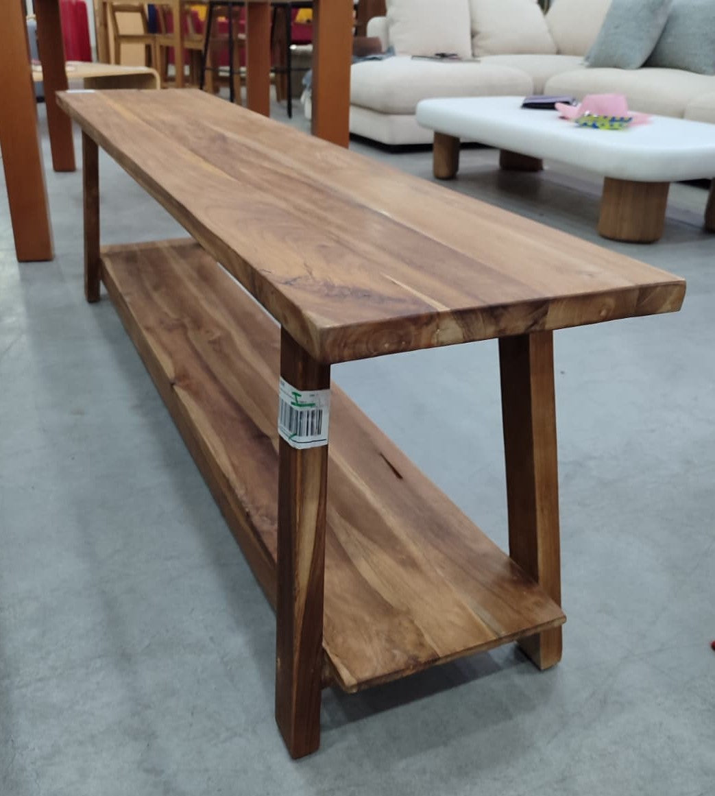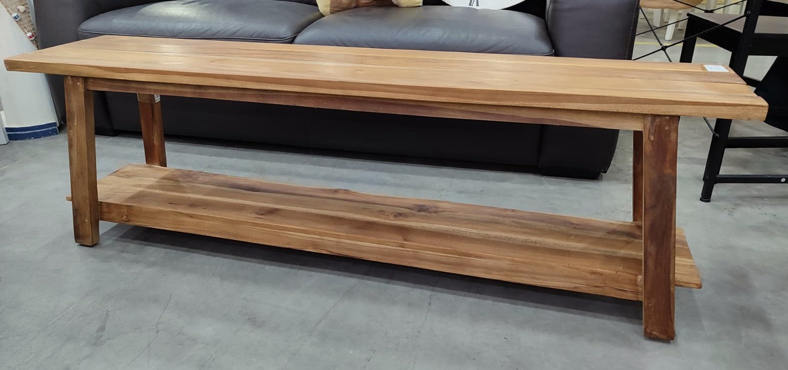 Descripción Banco de madera maciza de teca. Hecho con materiales naturales. Superficie reposapiés bajo el asiento. Apto para interiores y exteriores cubiertos. Defecto: Al ser hecho de materiales naturales, una de las patas tiene una imperfección estética no visible ni perjudicial para la estructura ni el uso del mueble. ver foto.