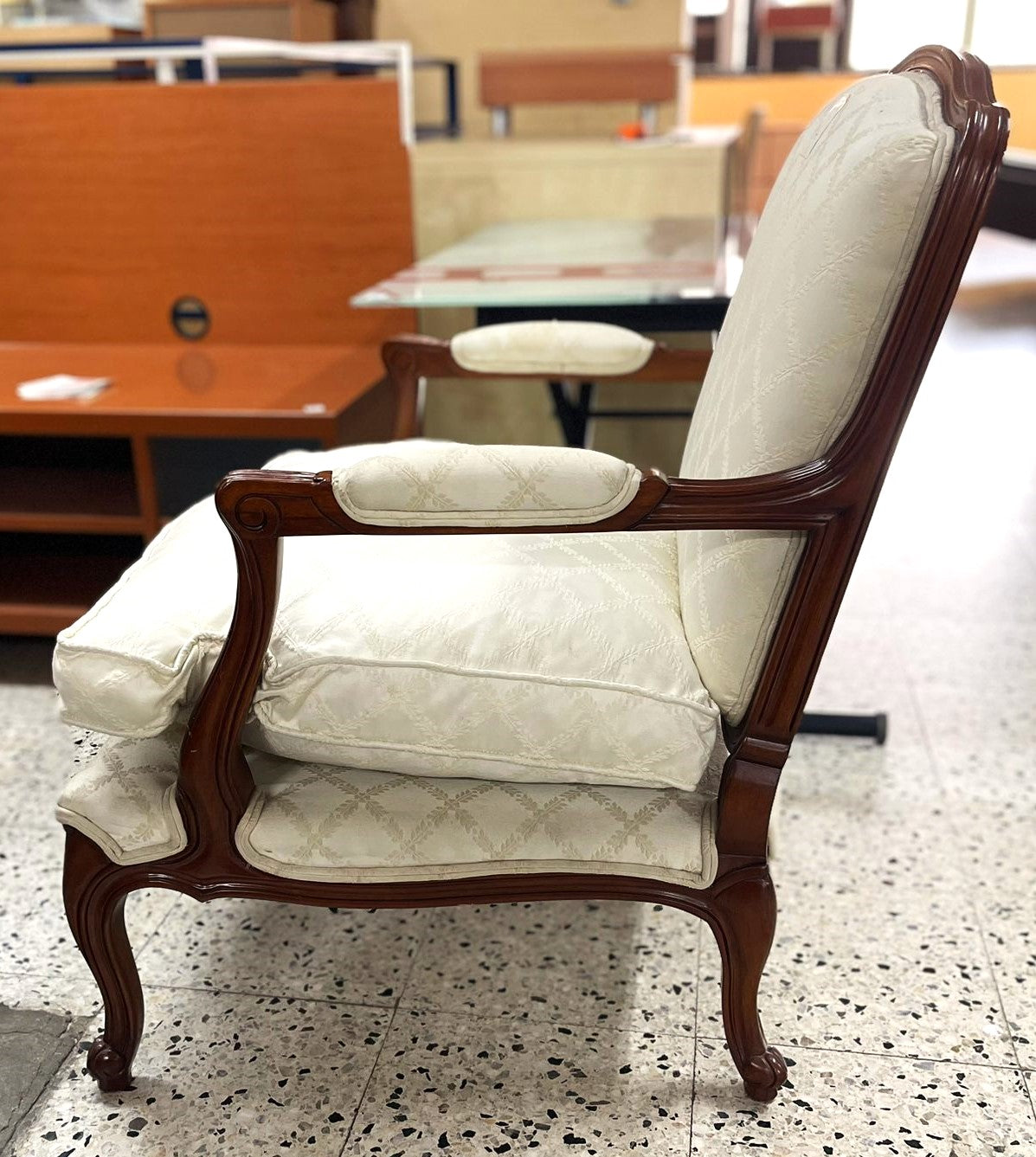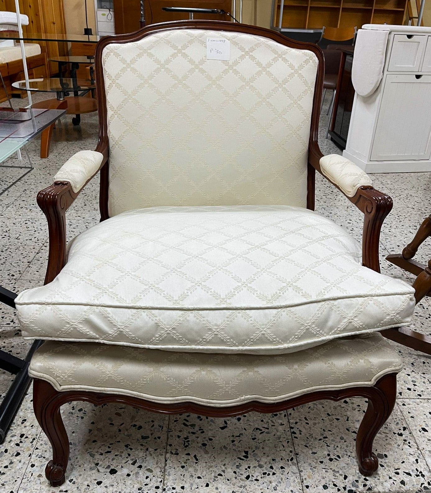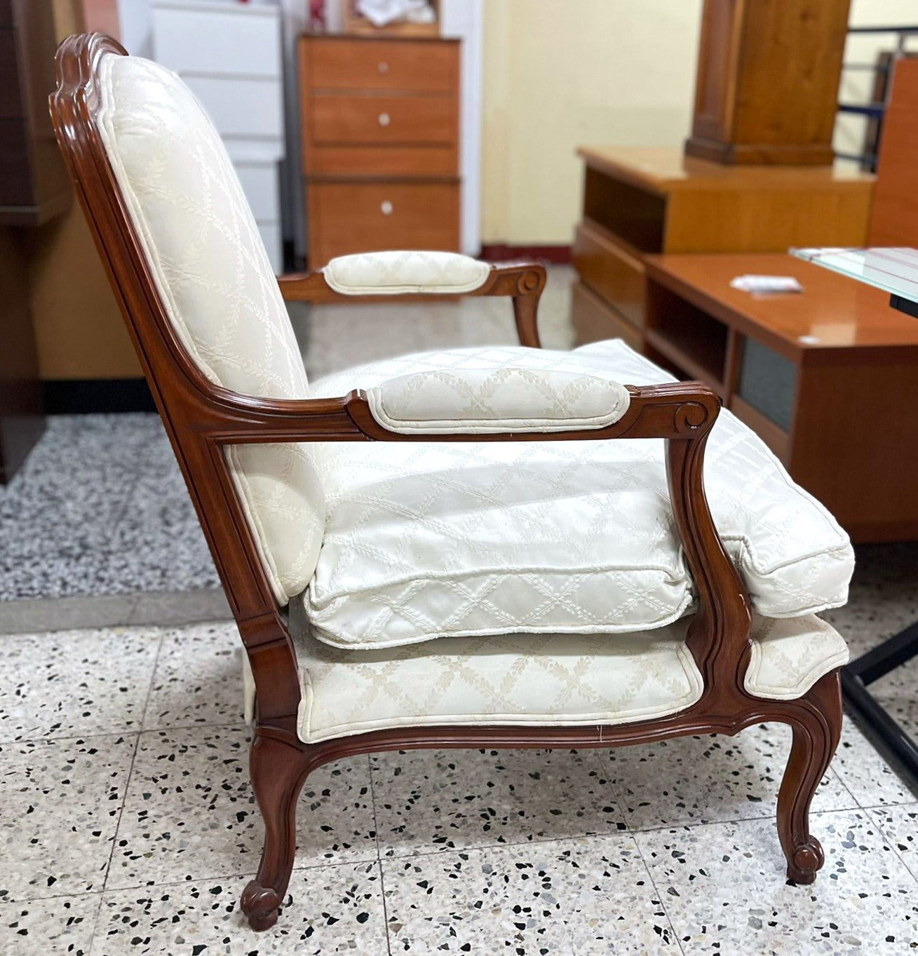 Descripción Butaca de estilo clásico. Respaldo alto con reposabrazos. Asiento de cojín acolchado. Estructura de madera maciza. Tapizado de lino. Defecto: Tiene una mancha en el reposabrazos.