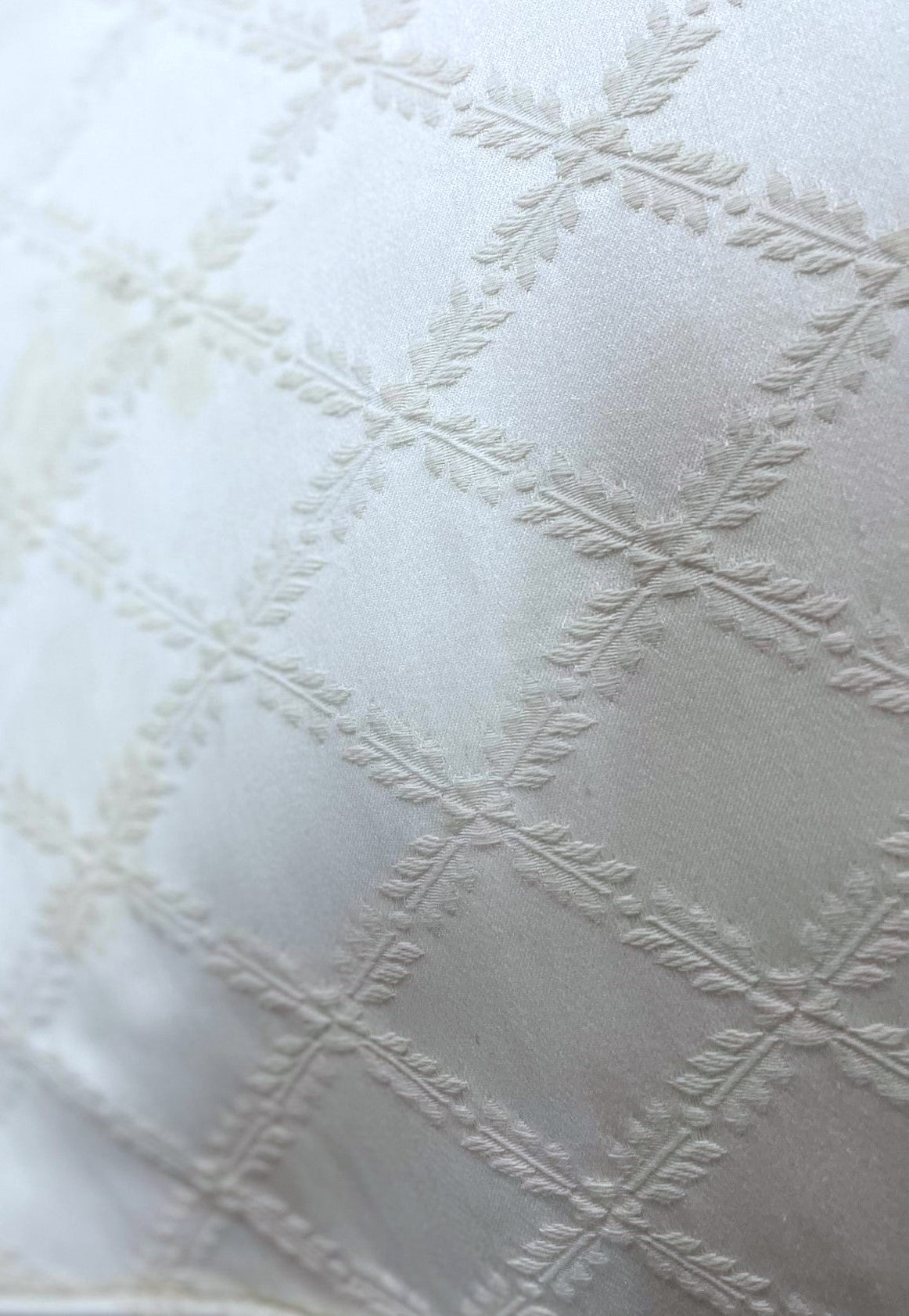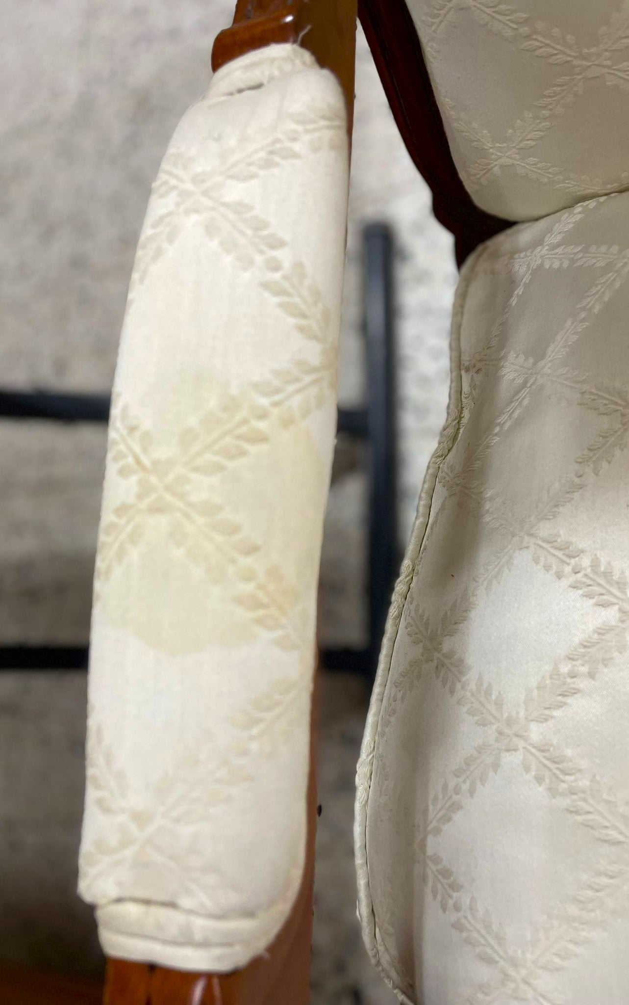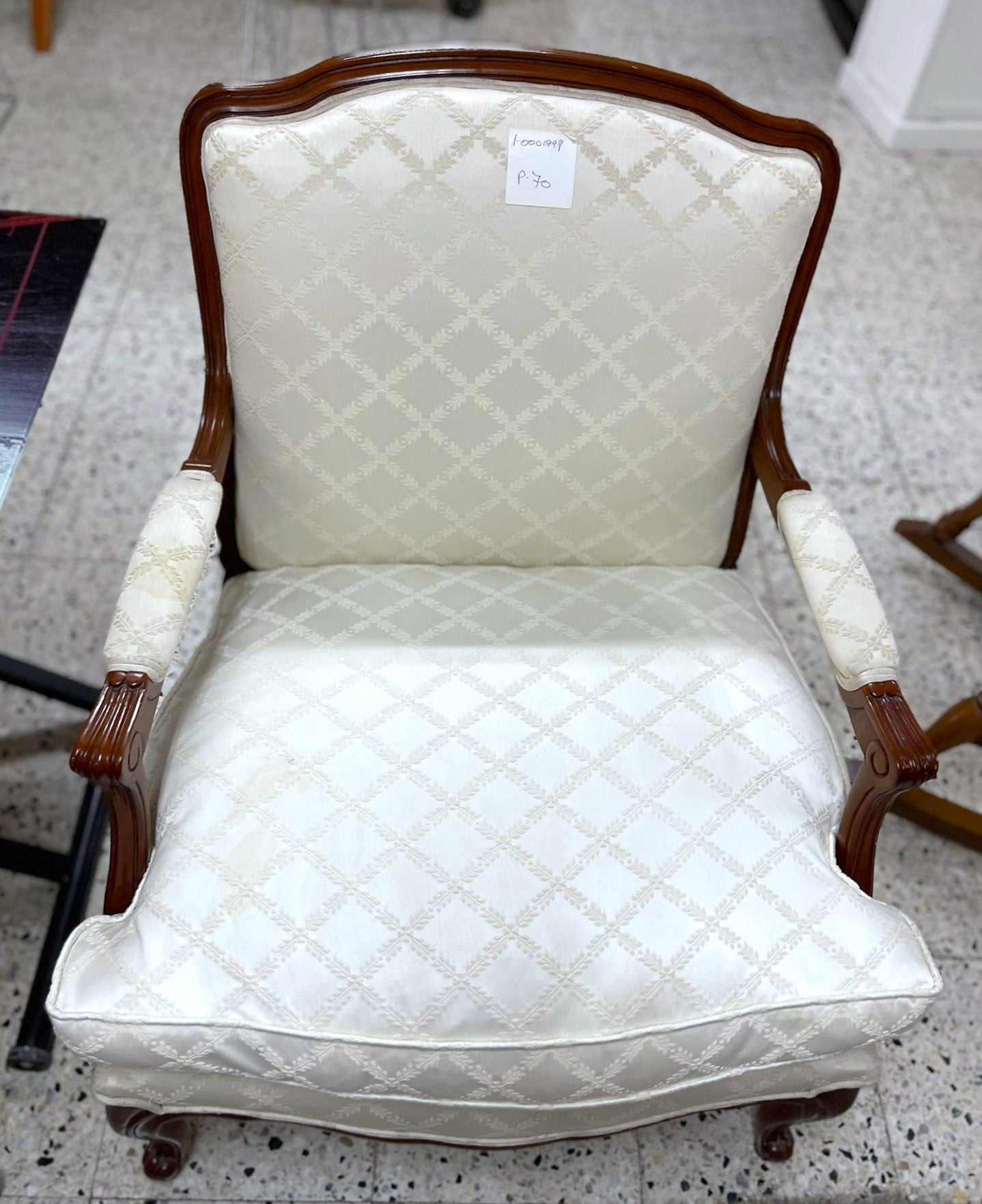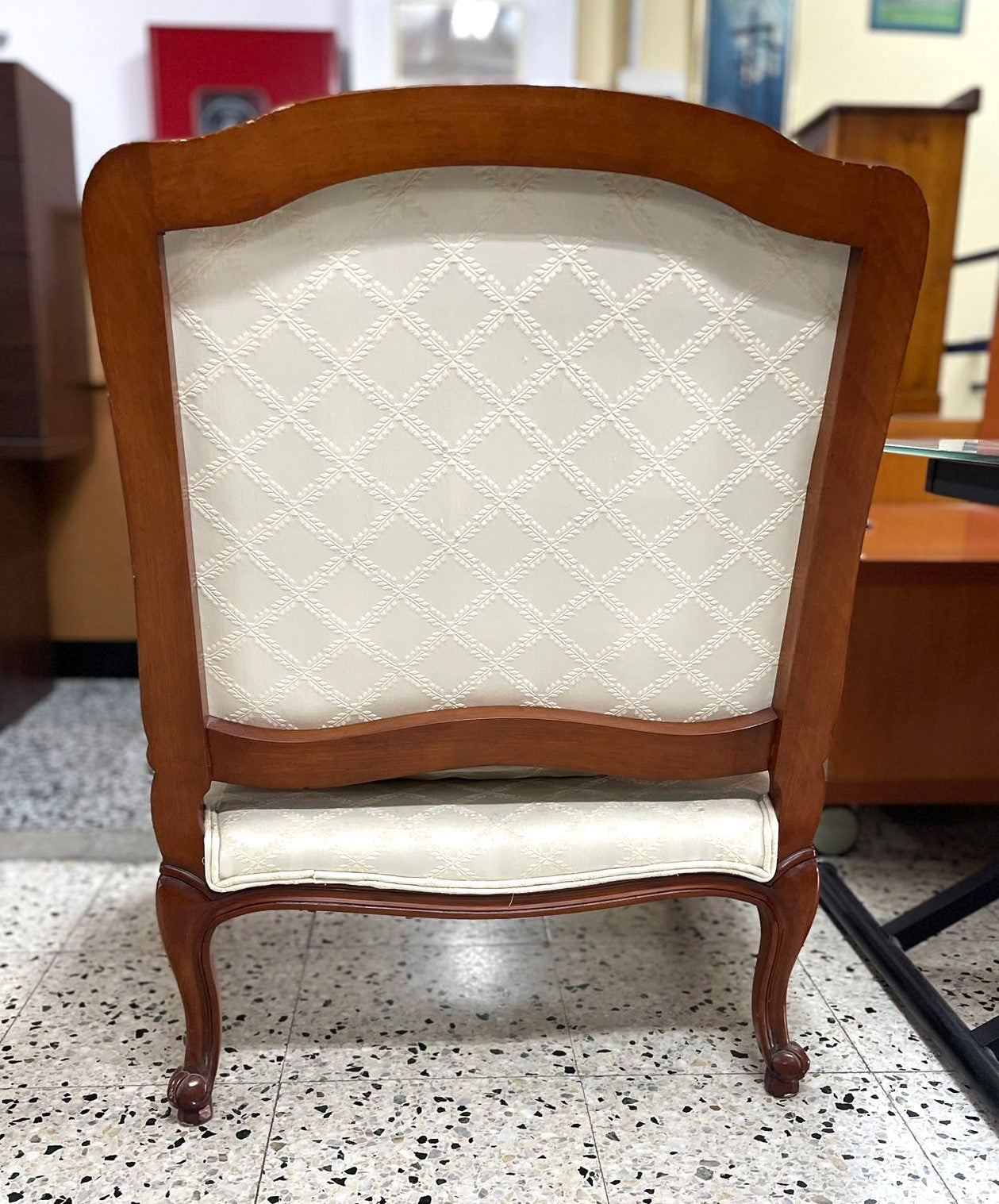 Descripción Butaca de estilo clásico. Respaldo alto con reposabrazos. Asiento de cojín acolchado. Estructura de madera maciza. Tapizado de lino. Defecto: Tiene una mancha en el reposabrazos.