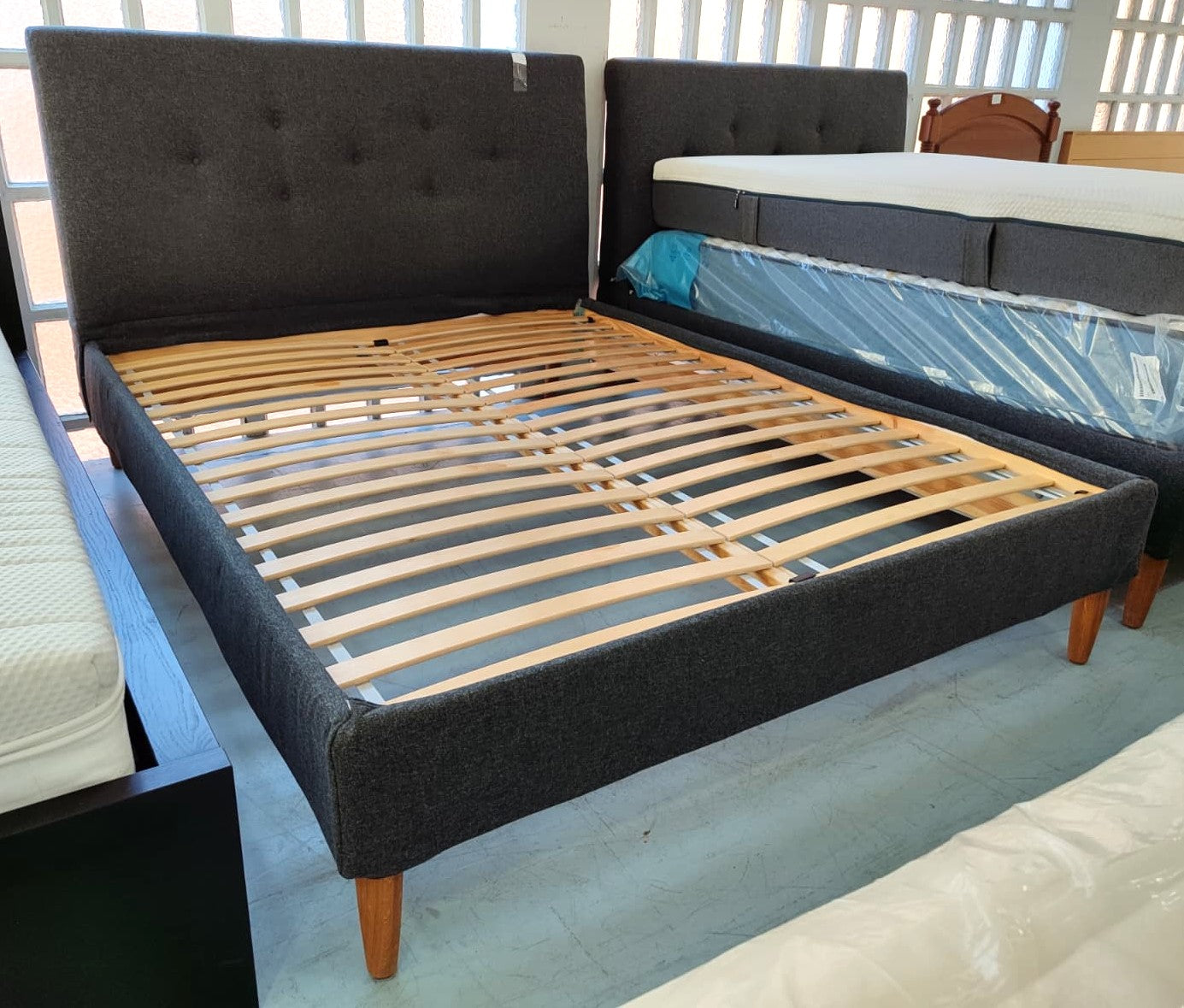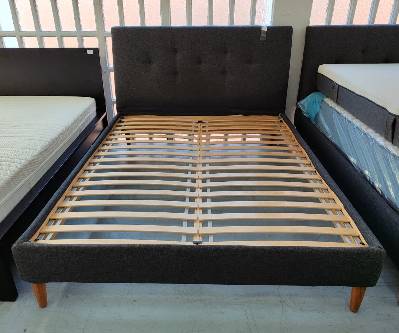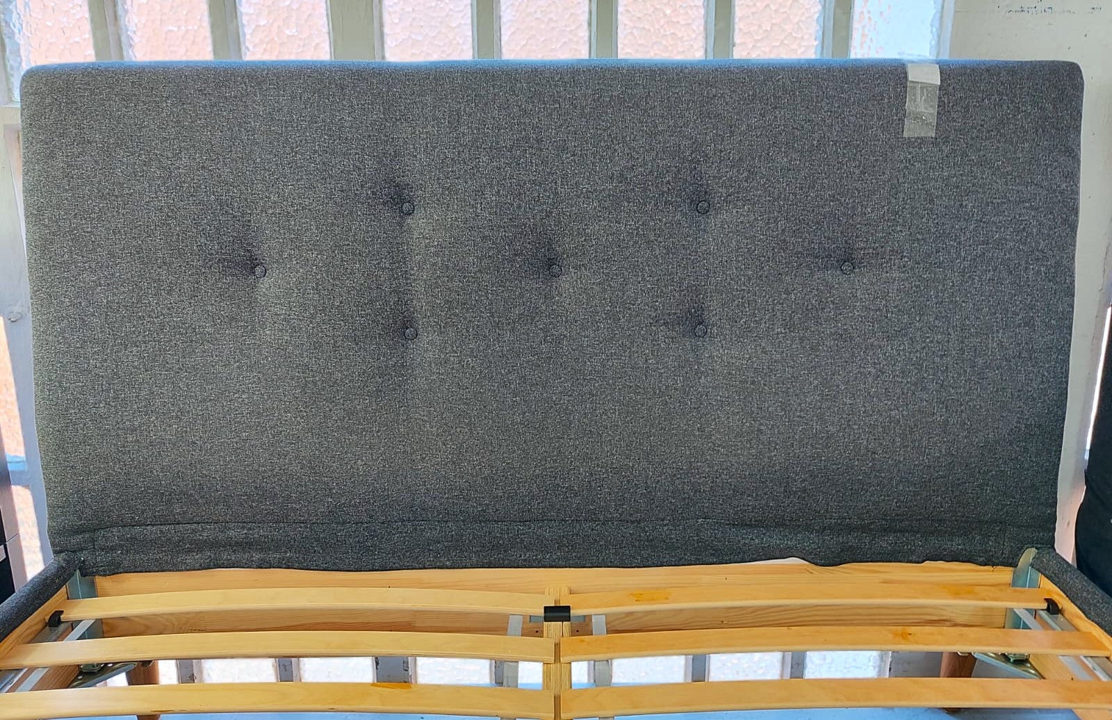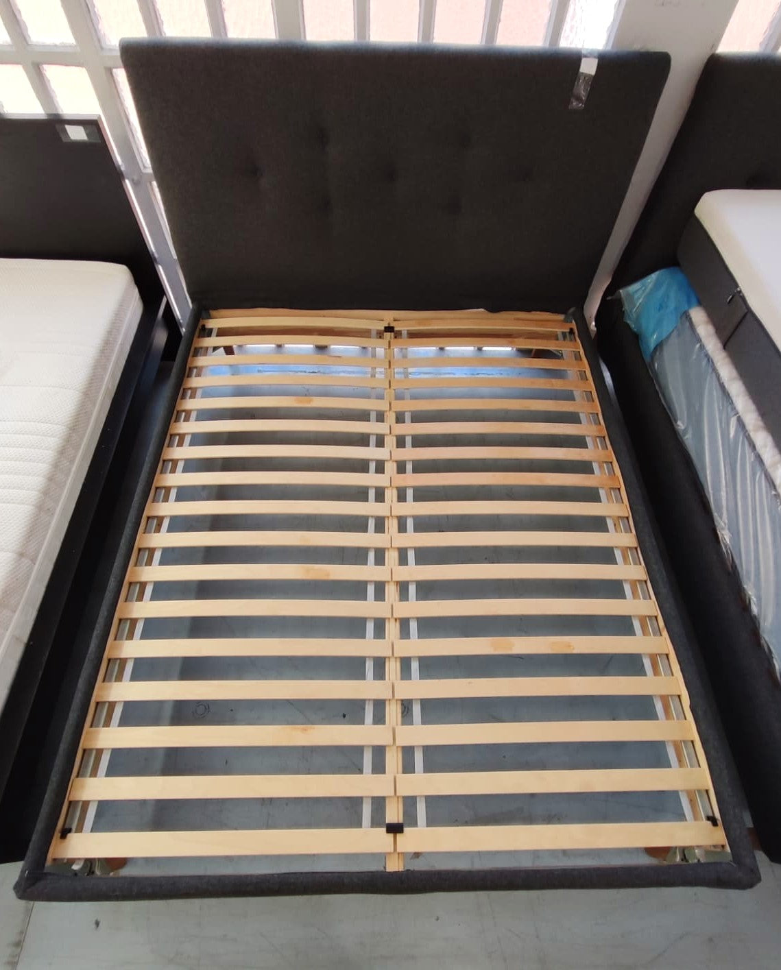 Descripción Cama matrimonial con cabecero. Somieres independientes de láminas de madera semiflexible. Cabecero acolchado y tapizado con tela suave al tacto y elegante acabado capitoné. Usa colchón de 160x200.