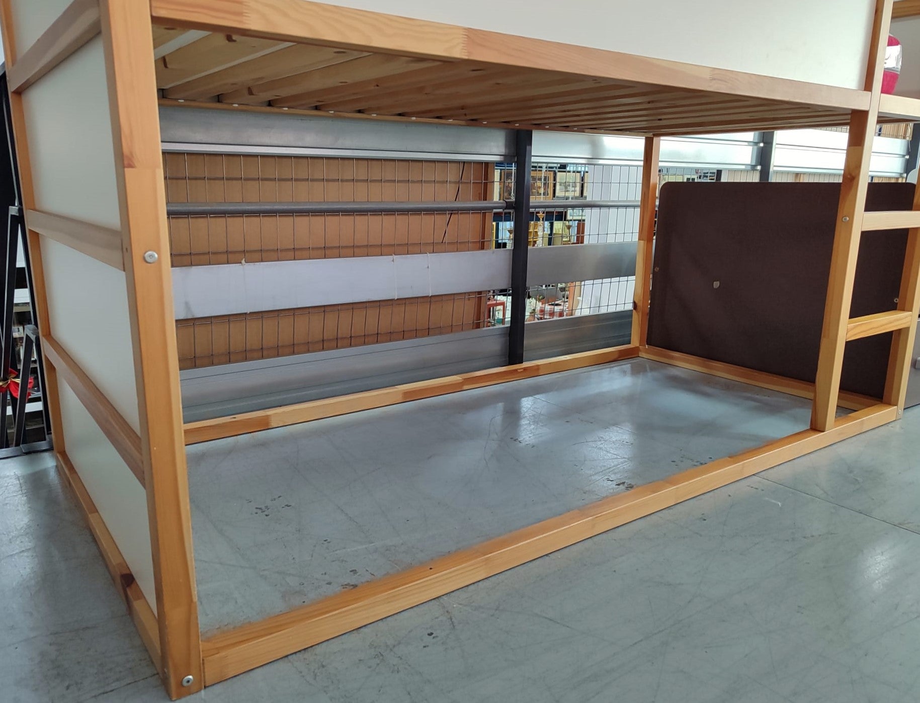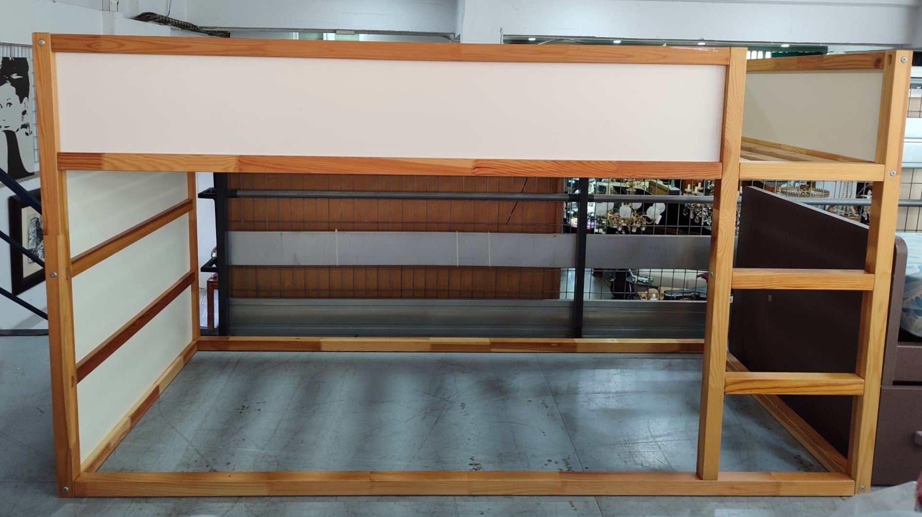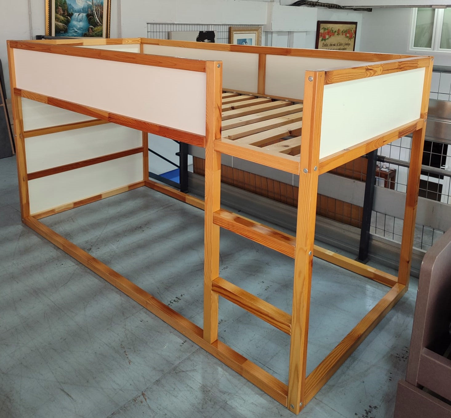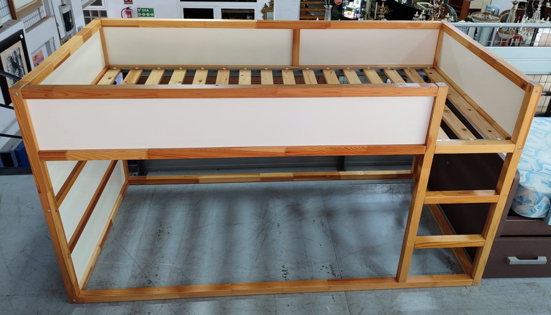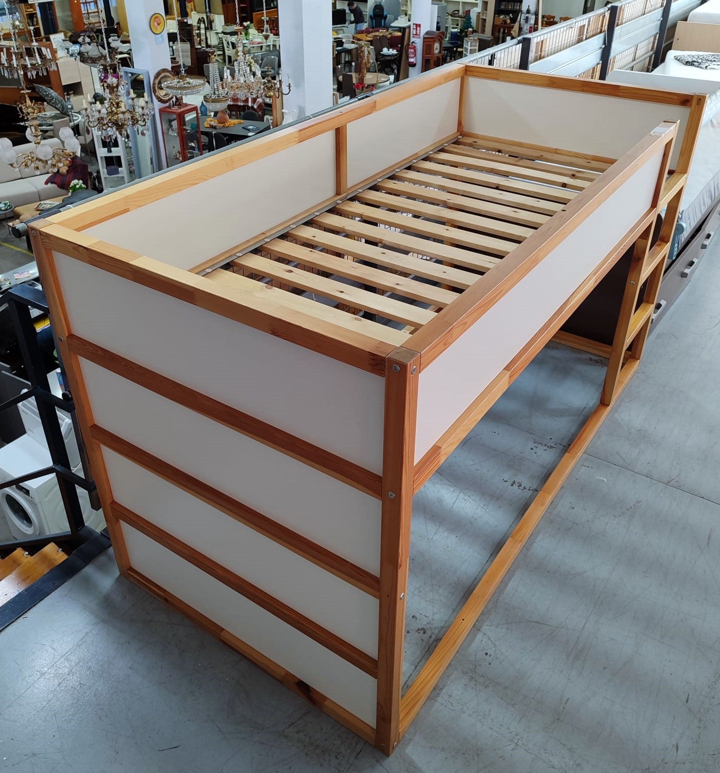 Descripción Cama alta infantil, hecha de madera de pino y tablero de fibras. Somier de láminas de madera de pino. Usa colchón de 90x200cm. La zona inferior a la cama alta mide 83 cm de altura. Puedes darle la vuelta y tendrás una cama con dosel. Peso límite de carga: 100kg.