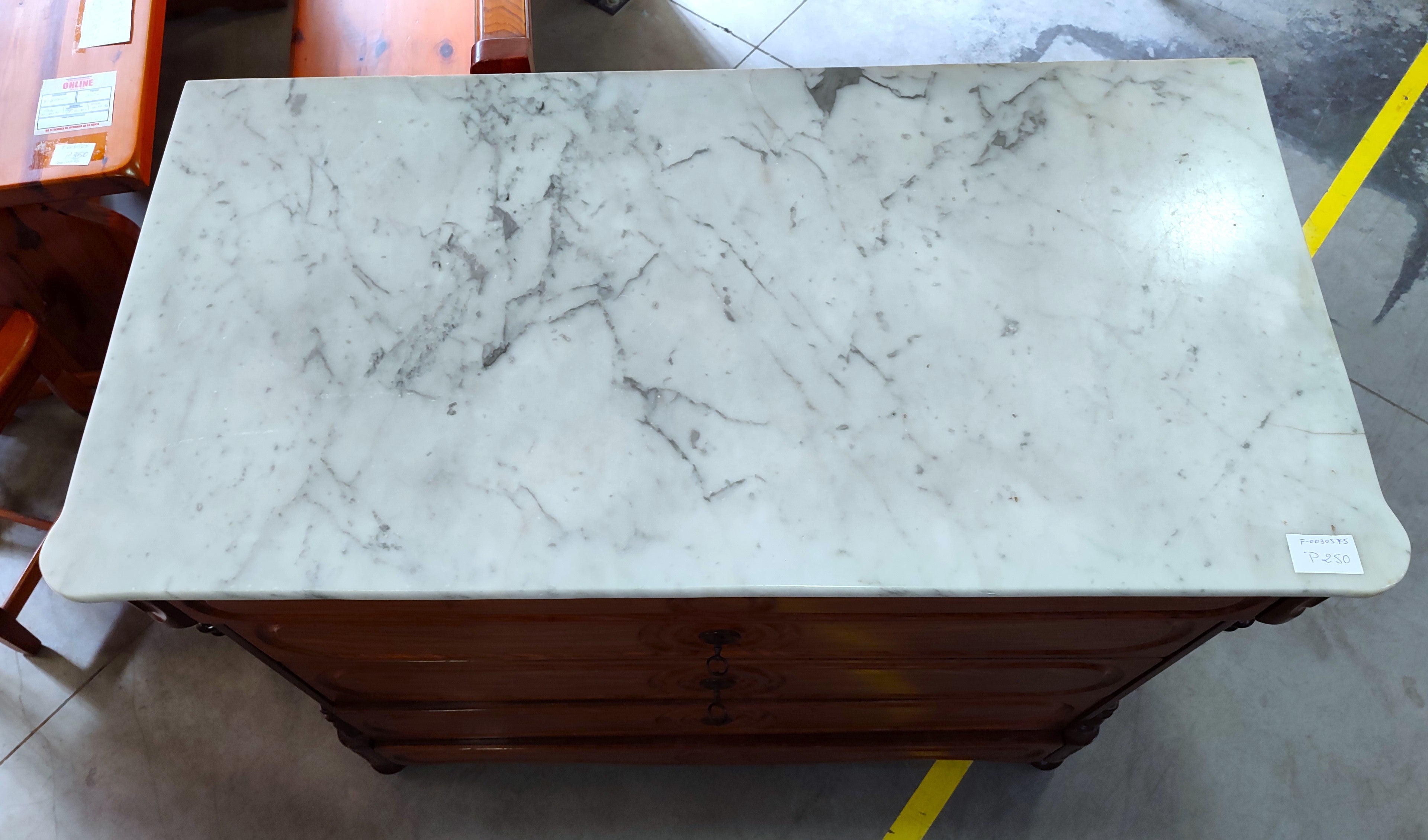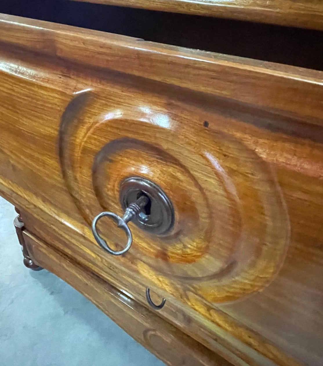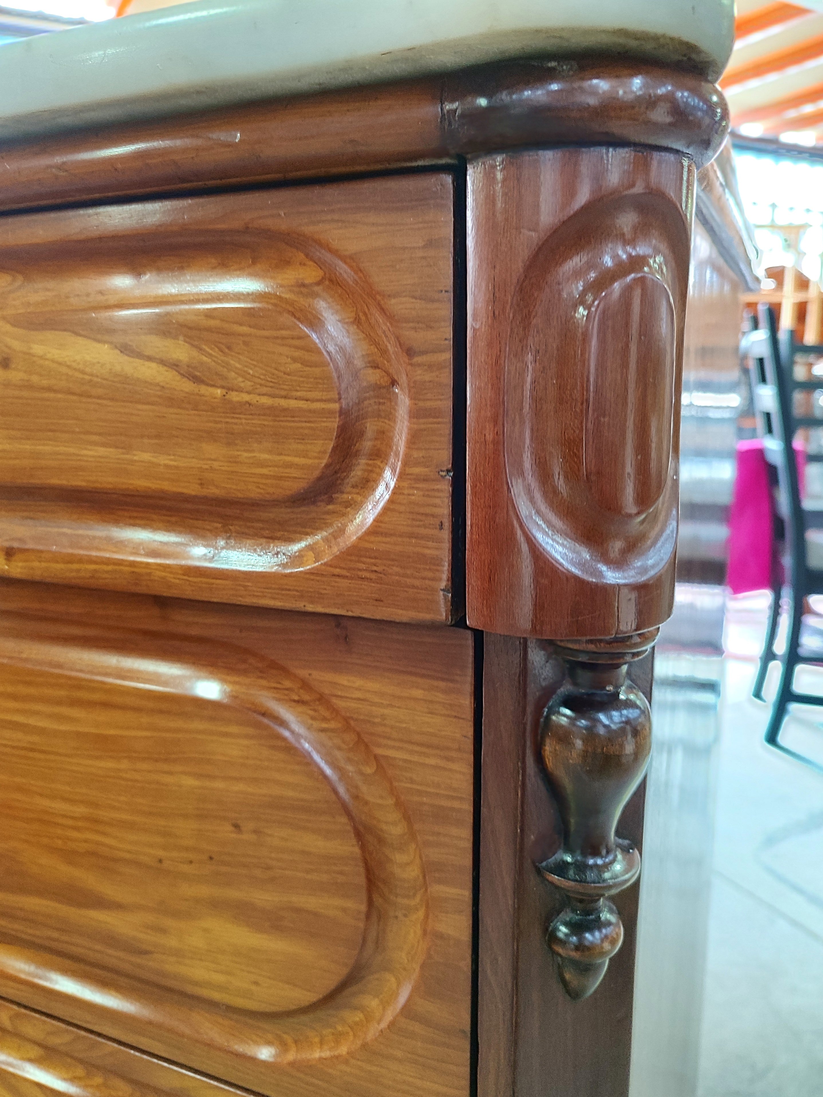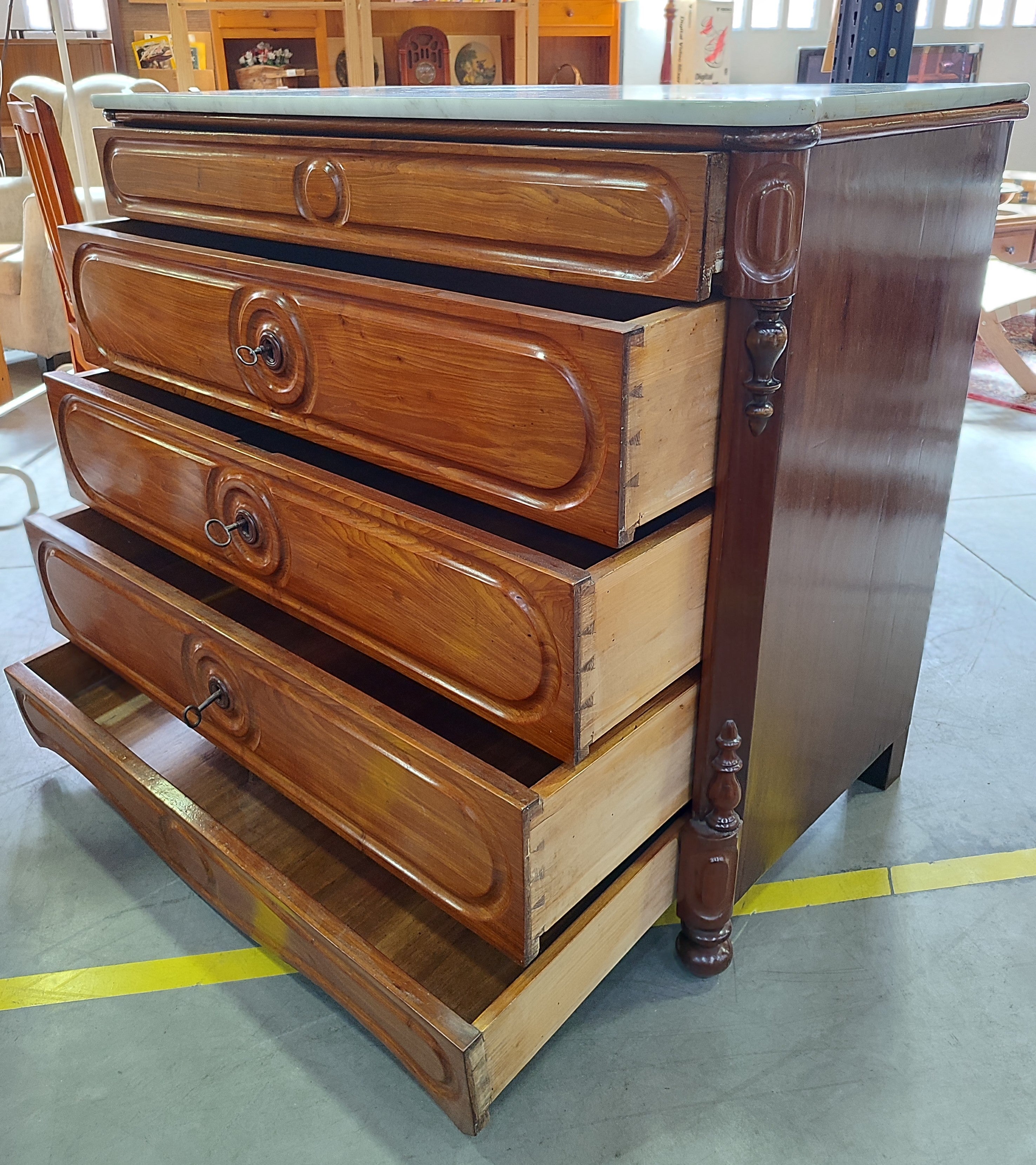 Descripción Cómoda de estilo clásico, hecha de madera maciza. Estructura con formas talladas. Encimera con pieza de mármol. Barnizado color miel. 5 cajones amplios, tres de ellos con cerradura y llave incluida. Defectos: El mármol tiene alguna pequeña grieta pero no está roto. Tiene cicatrices de carcoma.