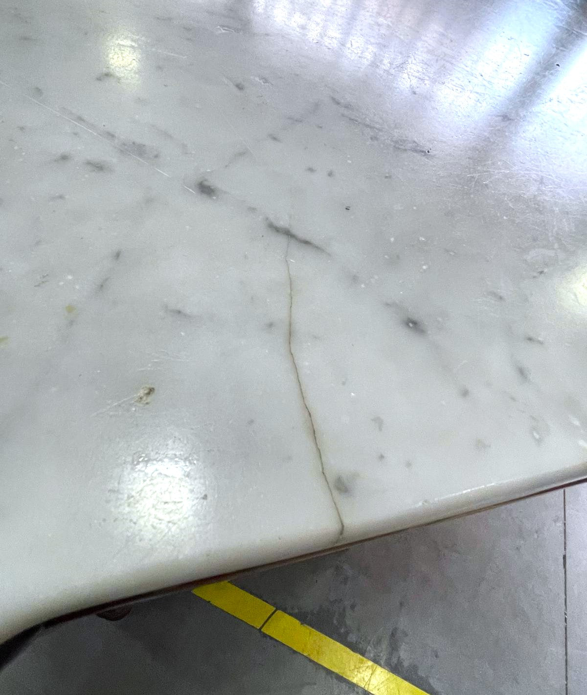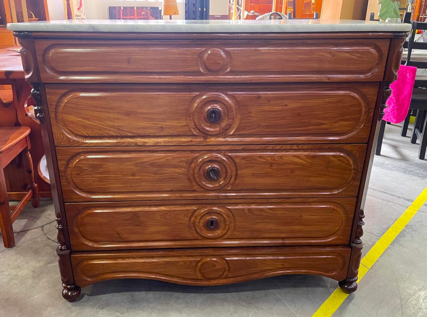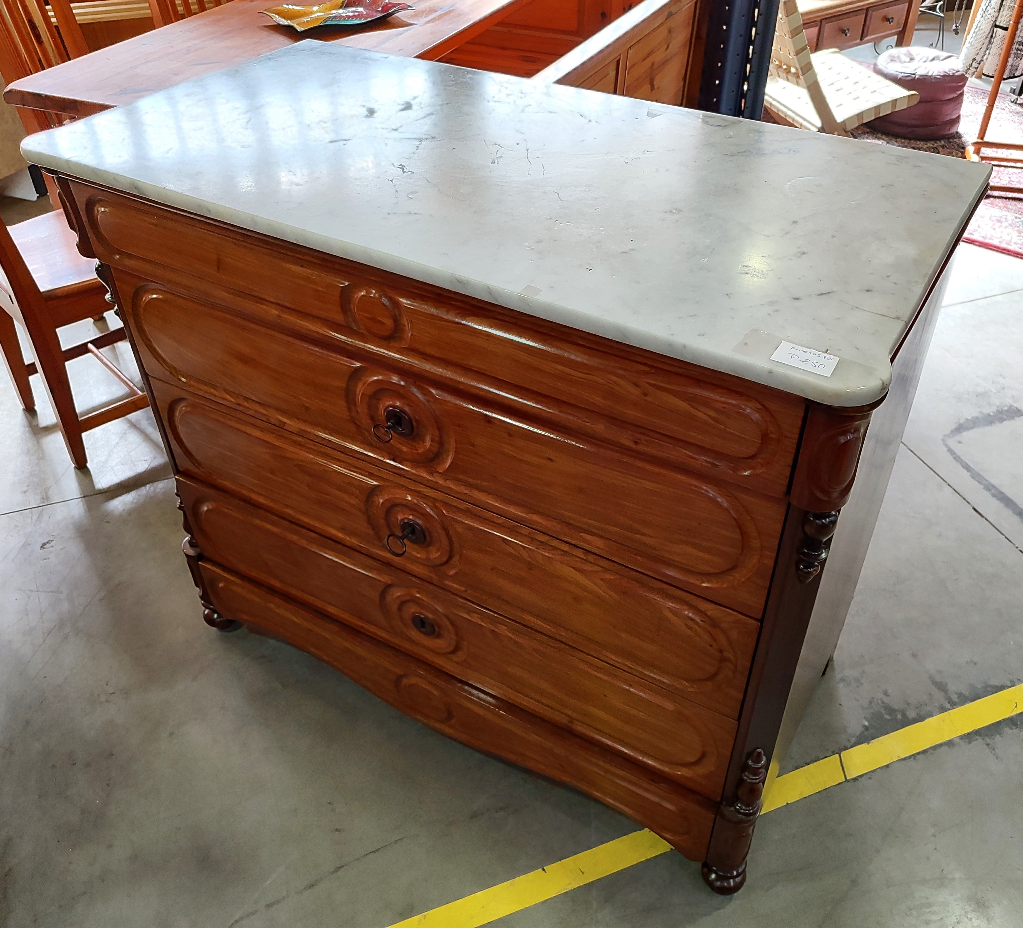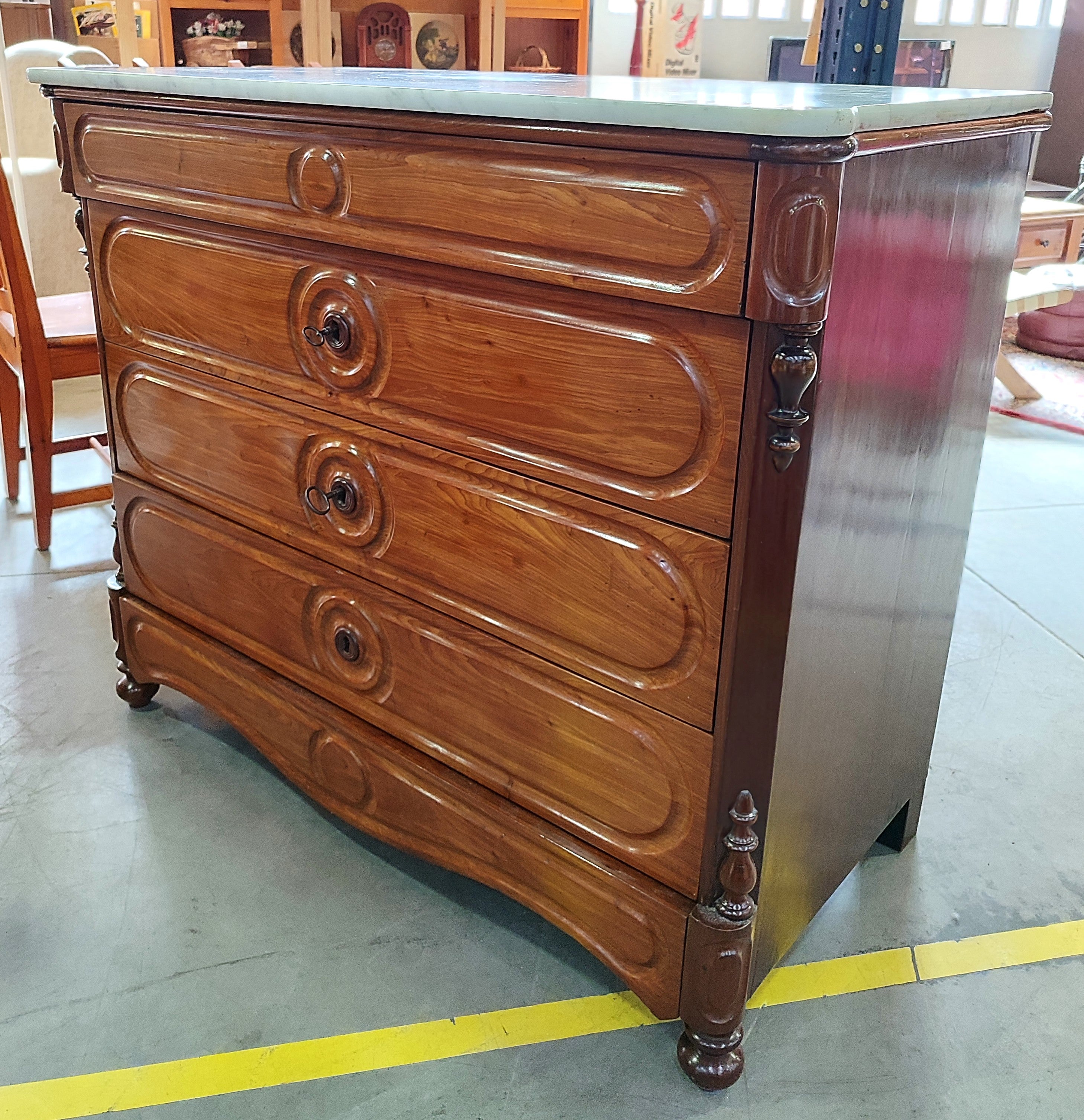 Descripción Cómoda de estilo clásico, hecha de madera maciza. Estructura con formas talladas. Encimera con pieza de mármol. Barnizado color miel. 5 cajones amplios, tres de ellos con cerradura y llave incluida. Defectos: El mármol tiene alguna pequeña grieta pero no está roto. Tiene cicatrices de carcoma.