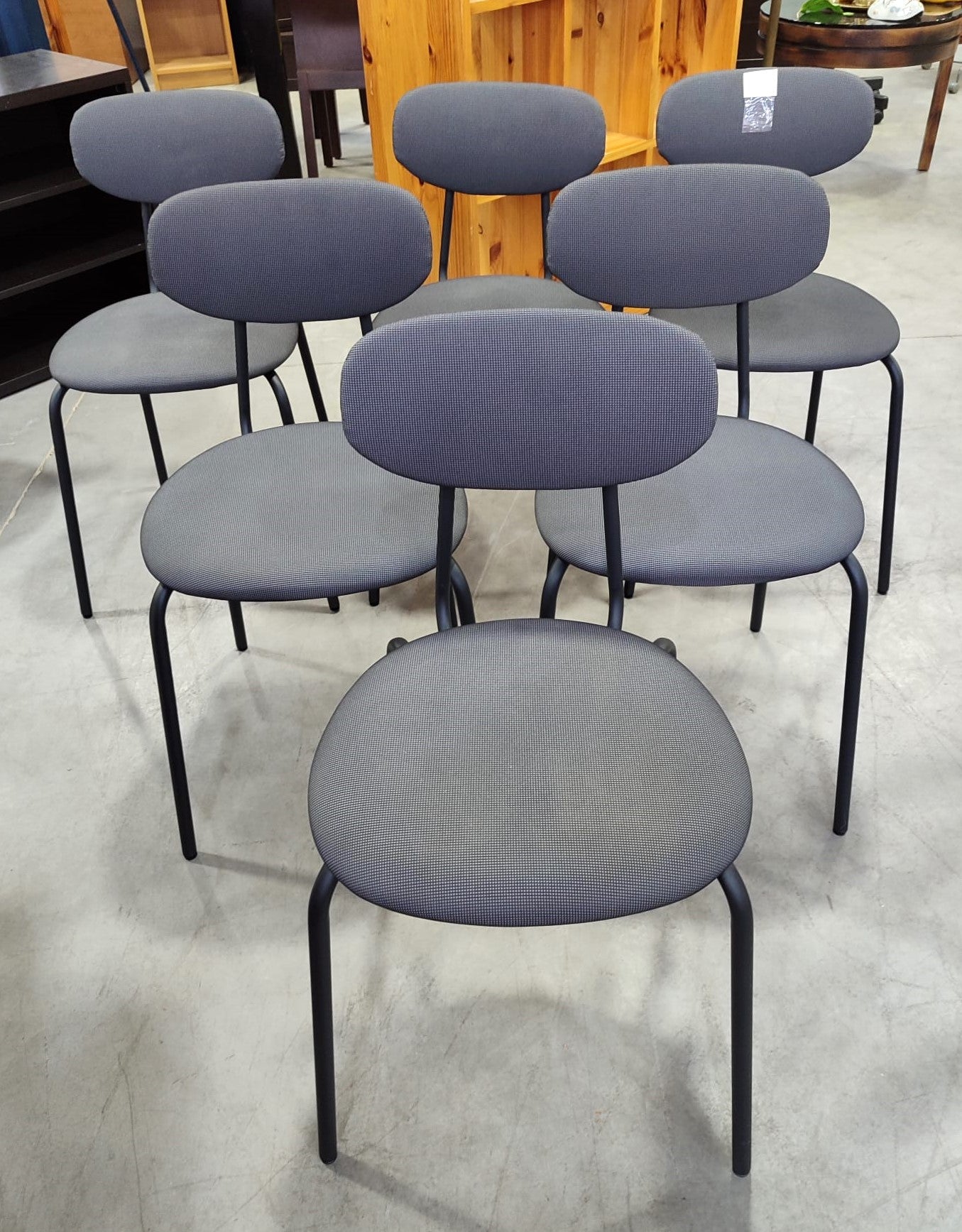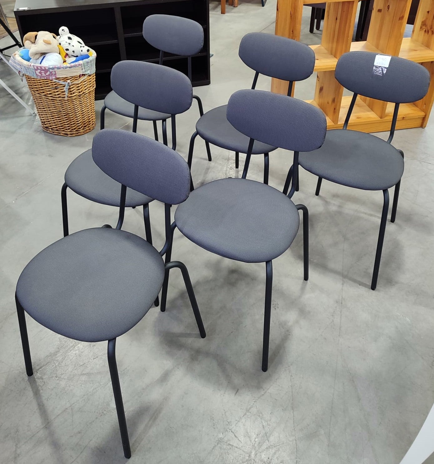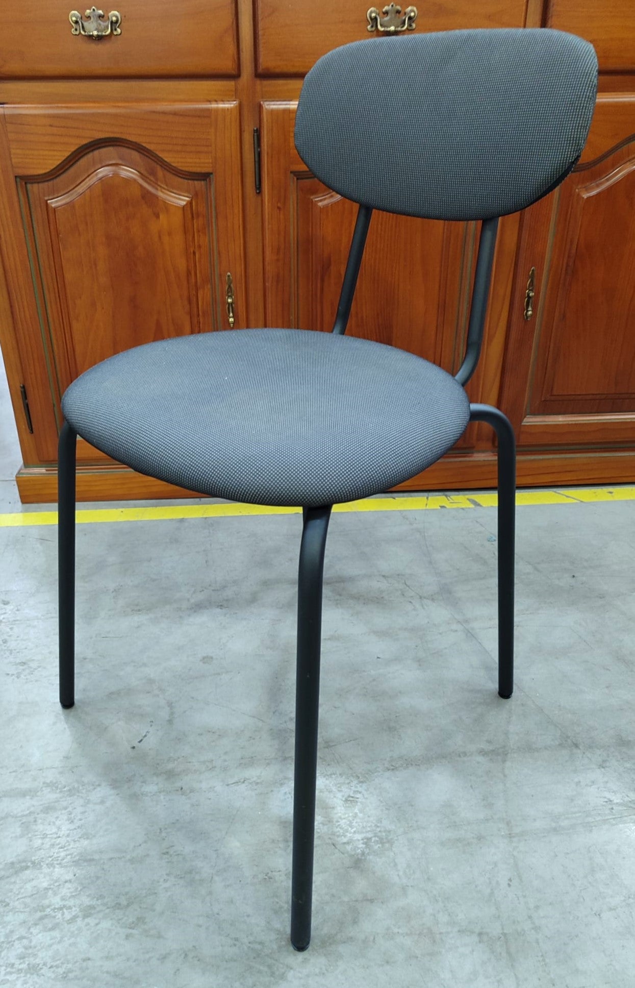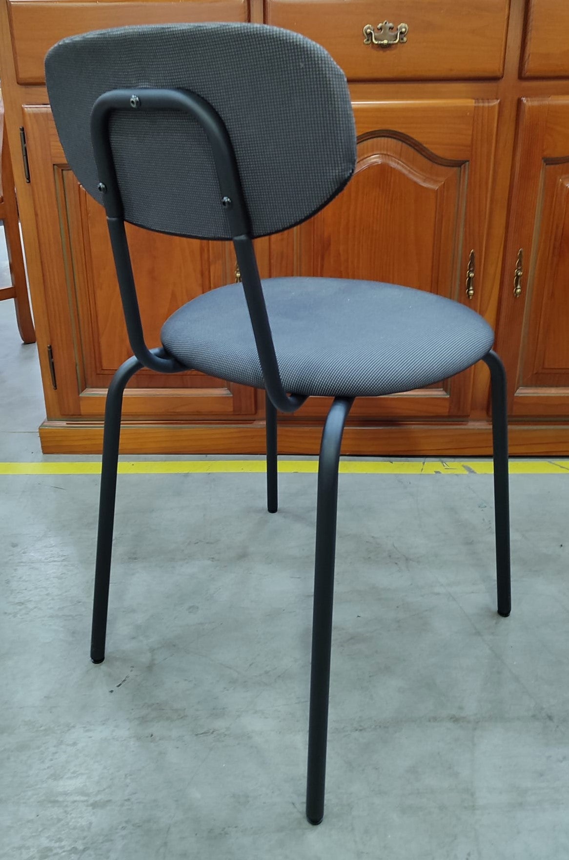 Descripción Sillas de comedor de diseño simple. Estructura metálica. Asiento y respaldo acolchado. Tapizado texturizado, color gris. Defecto: Una de las sillas tiene una mancha en el asiento.