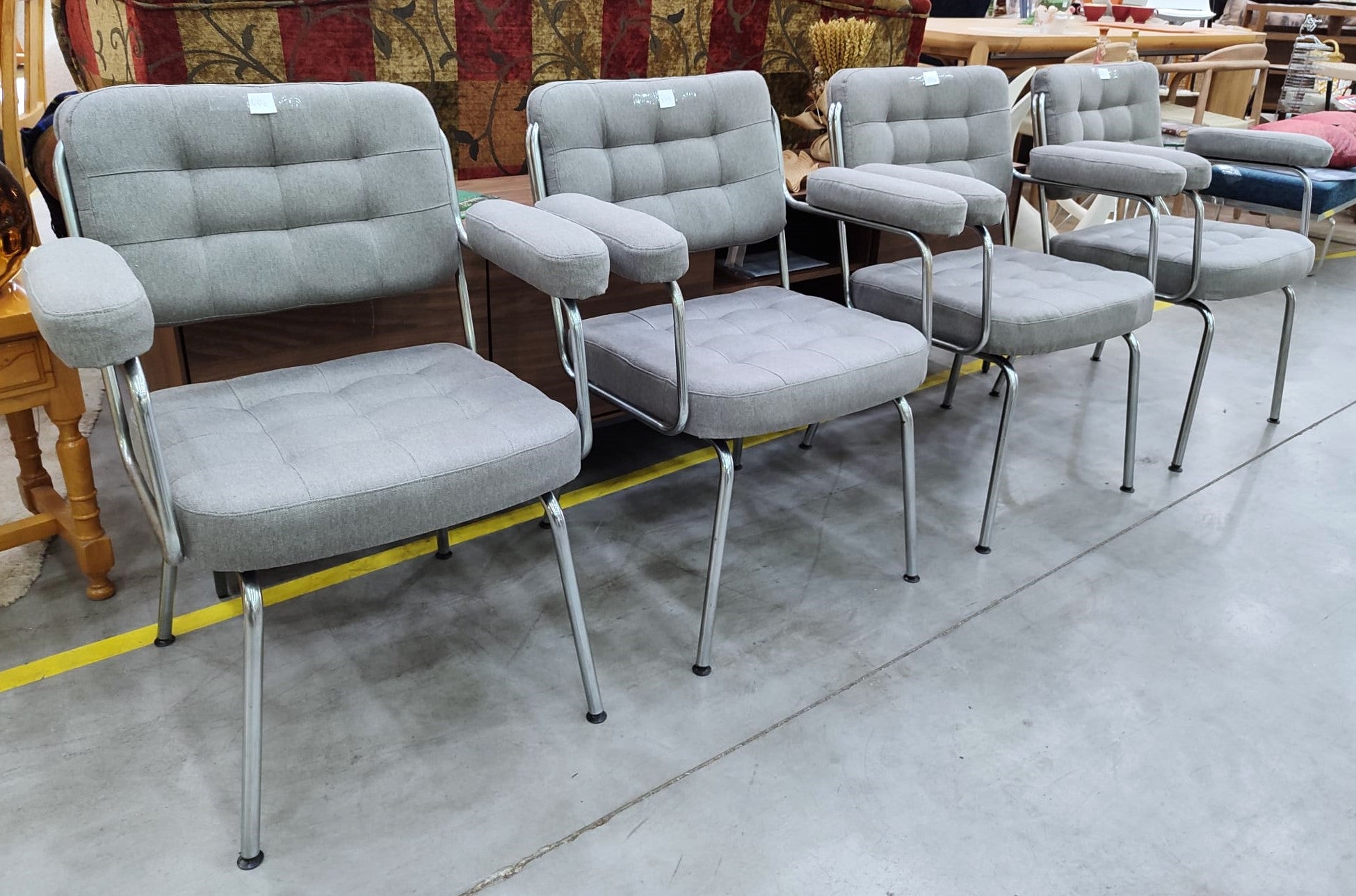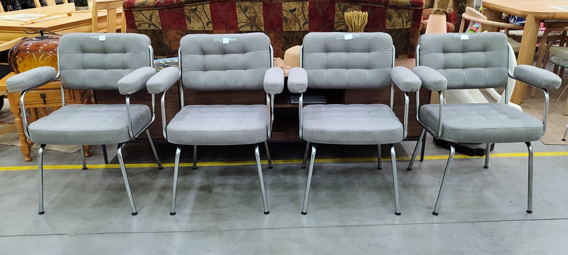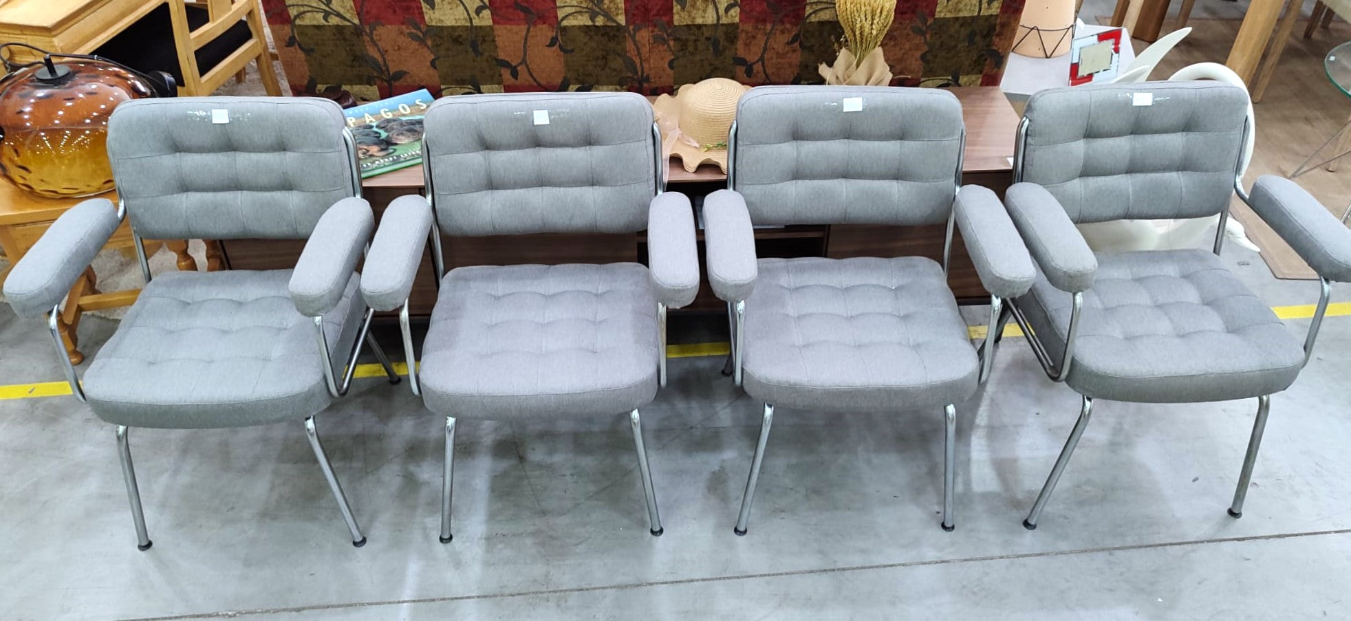 Forma del producto CUATRO SILLAS 61x44x78 cm €240,00IVA incluido SKU: R-053-E Recogida gratuita en nuestra(s) tienda(s) Contáctanos por WhatsApp Estado: En buen estadoMedidas: Largo 61 cm, Profundidad 44 cm, Alto 78 cm.Color: Plateado y GrisDefecto: no tienen