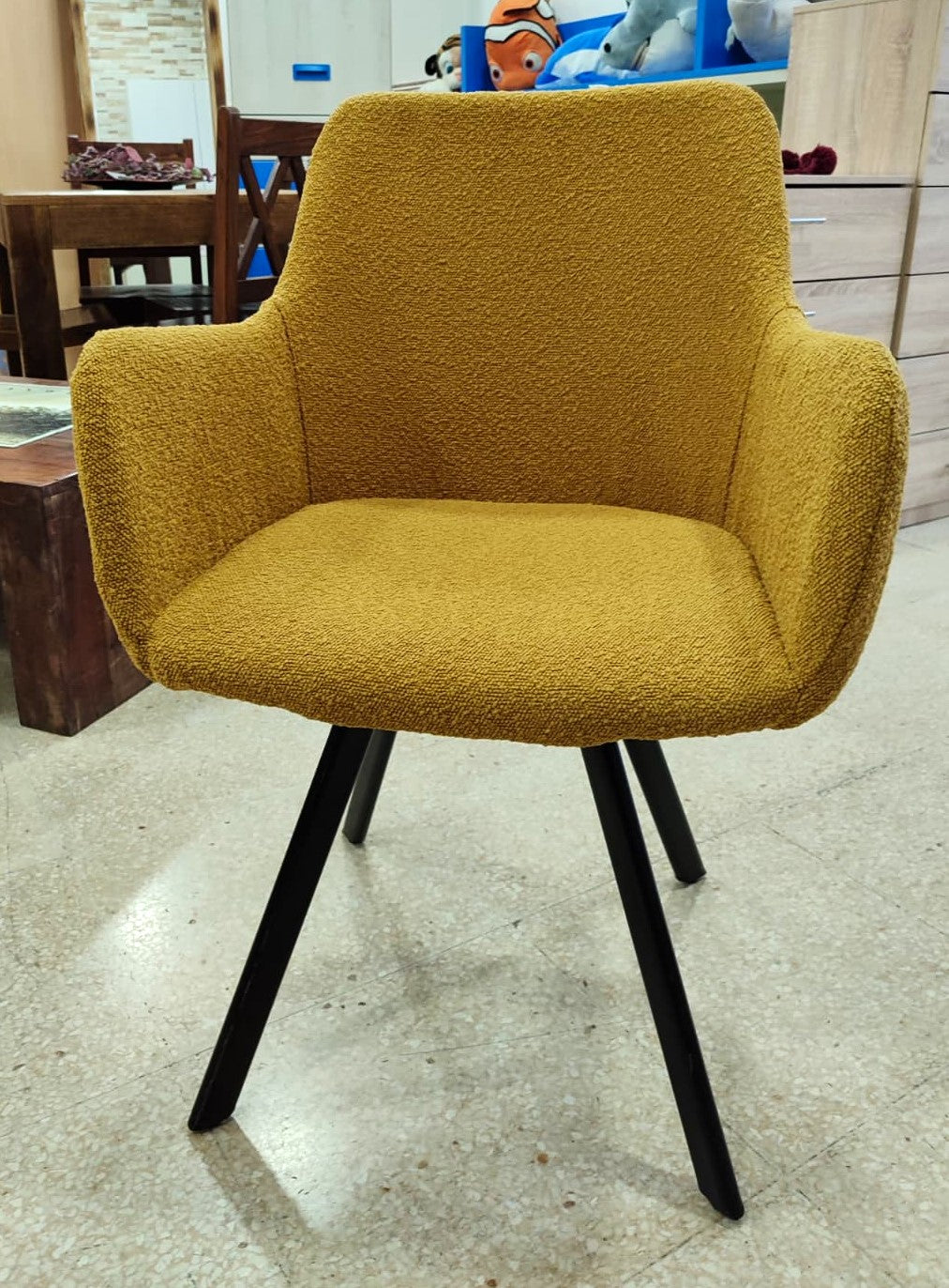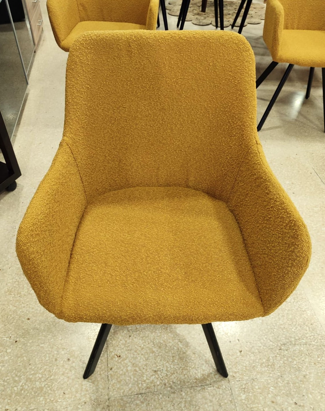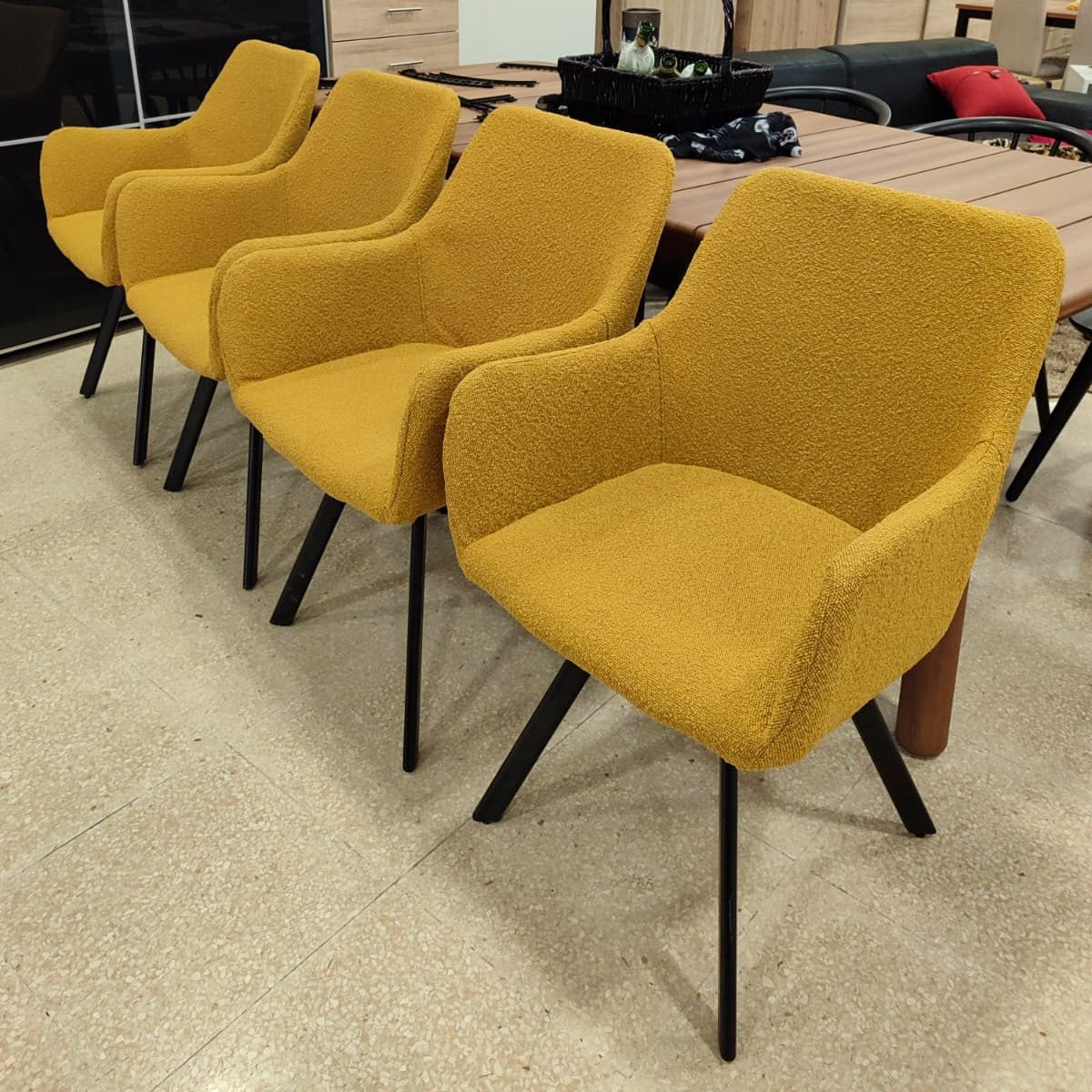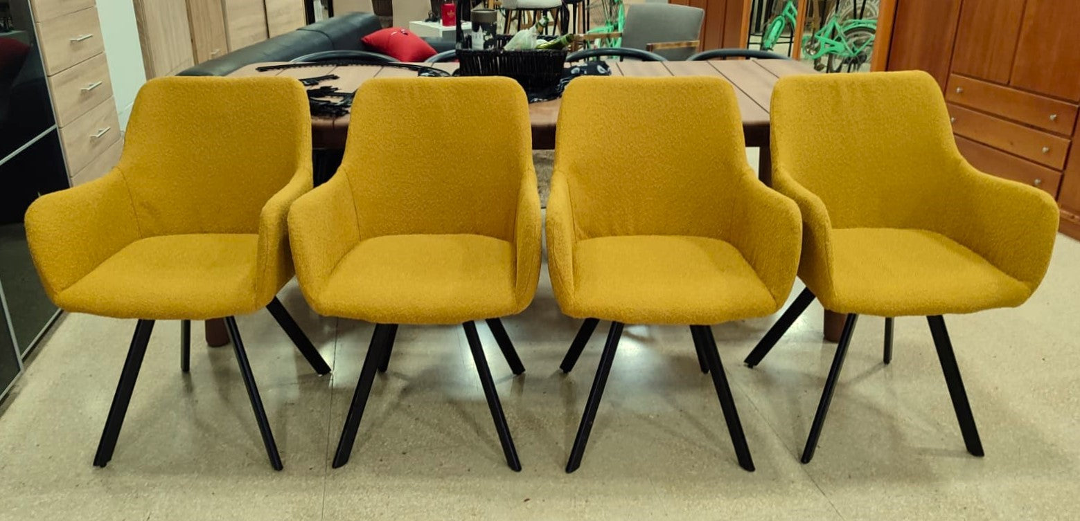 Descripción Conjunto de sillas elegantes para comedor. Estructura completamente tapizada en chenilla color amarillo de tacto suave y estética refinada. Respaldo alto con reposabrazos y asiento acolchado. Cuatro patas de madera. Se pueden comprar por separado, 100€ cada una.