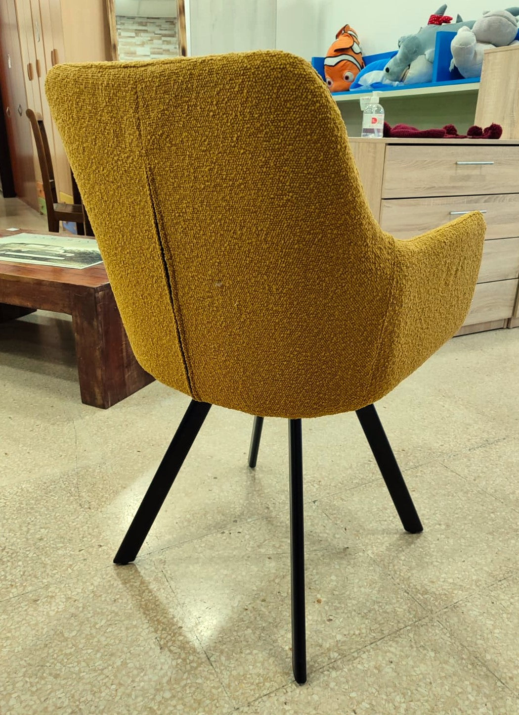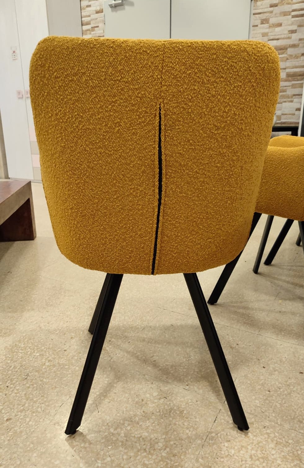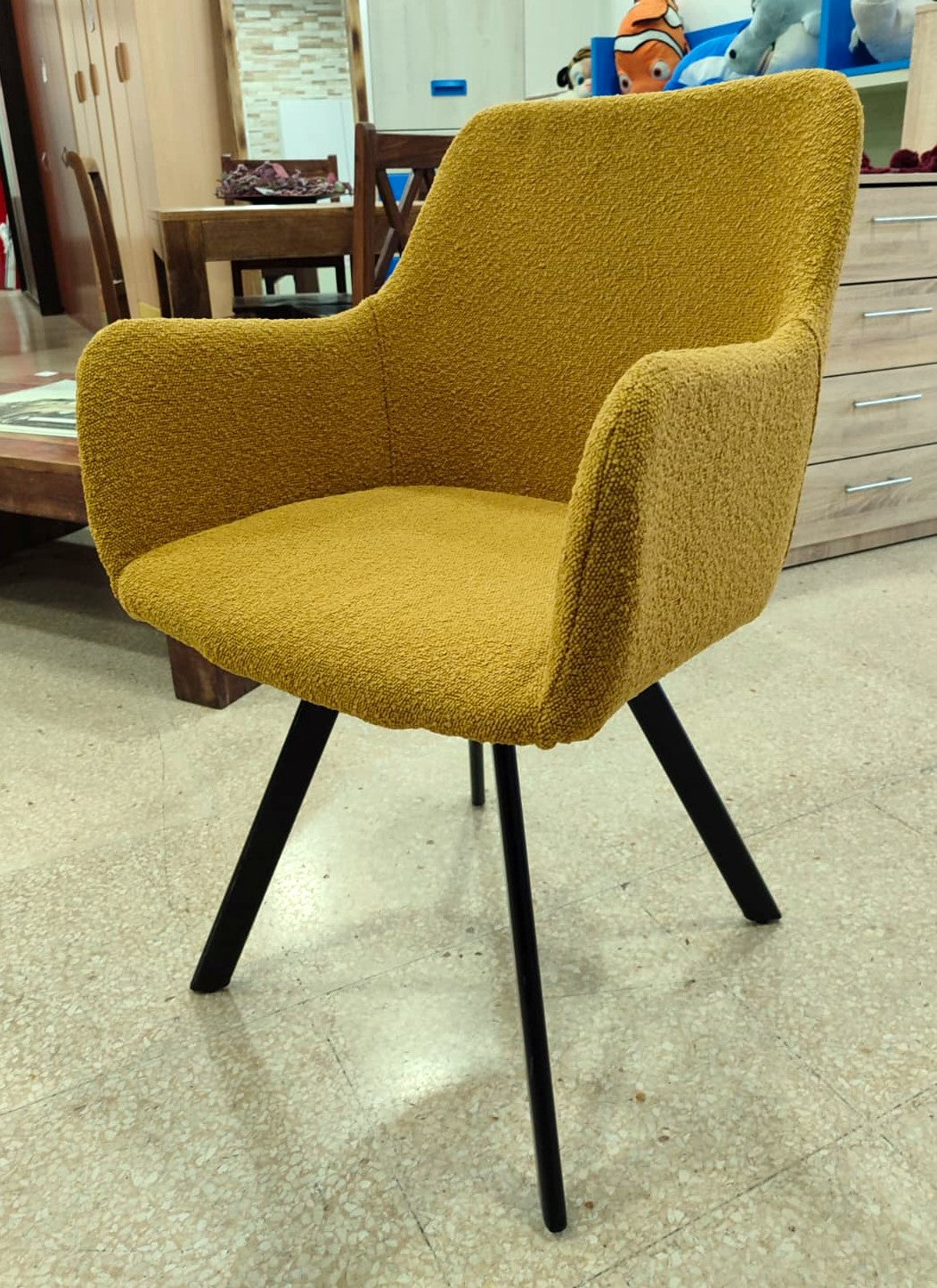 Descripción Conjunto de sillas elegantes para comedor. Estructura completamente tapizada en chenilla color amarillo de tacto suave y estética refinada. Respaldo alto con reposabrazos y asiento acolchado. Cuatro patas de madera. Se pueden comprar por separado, 100€ cada una.