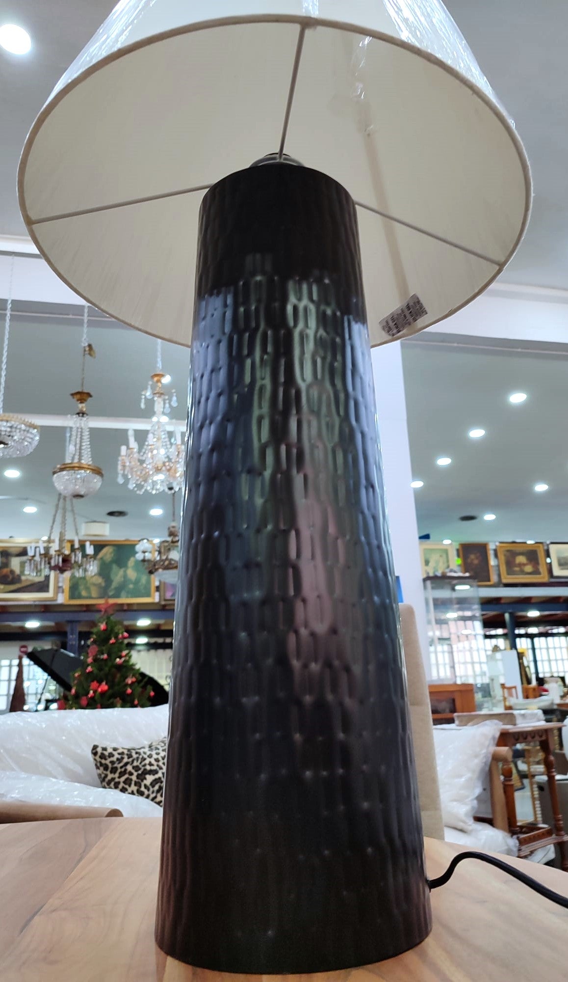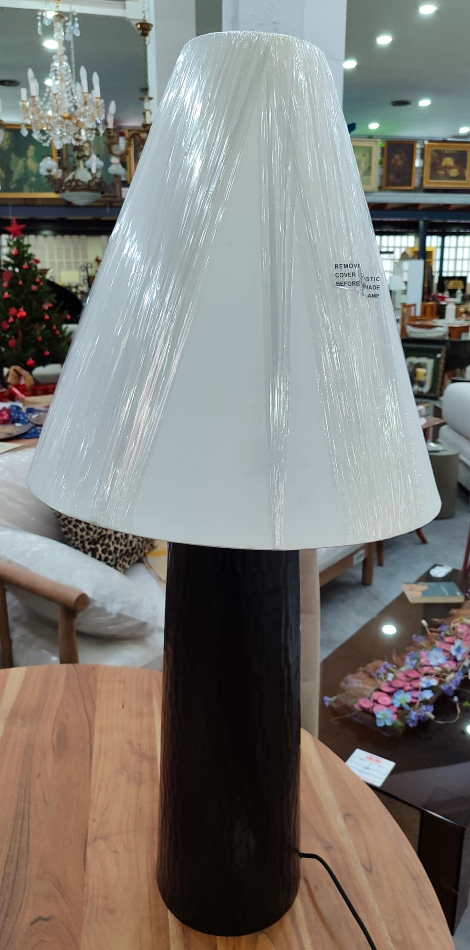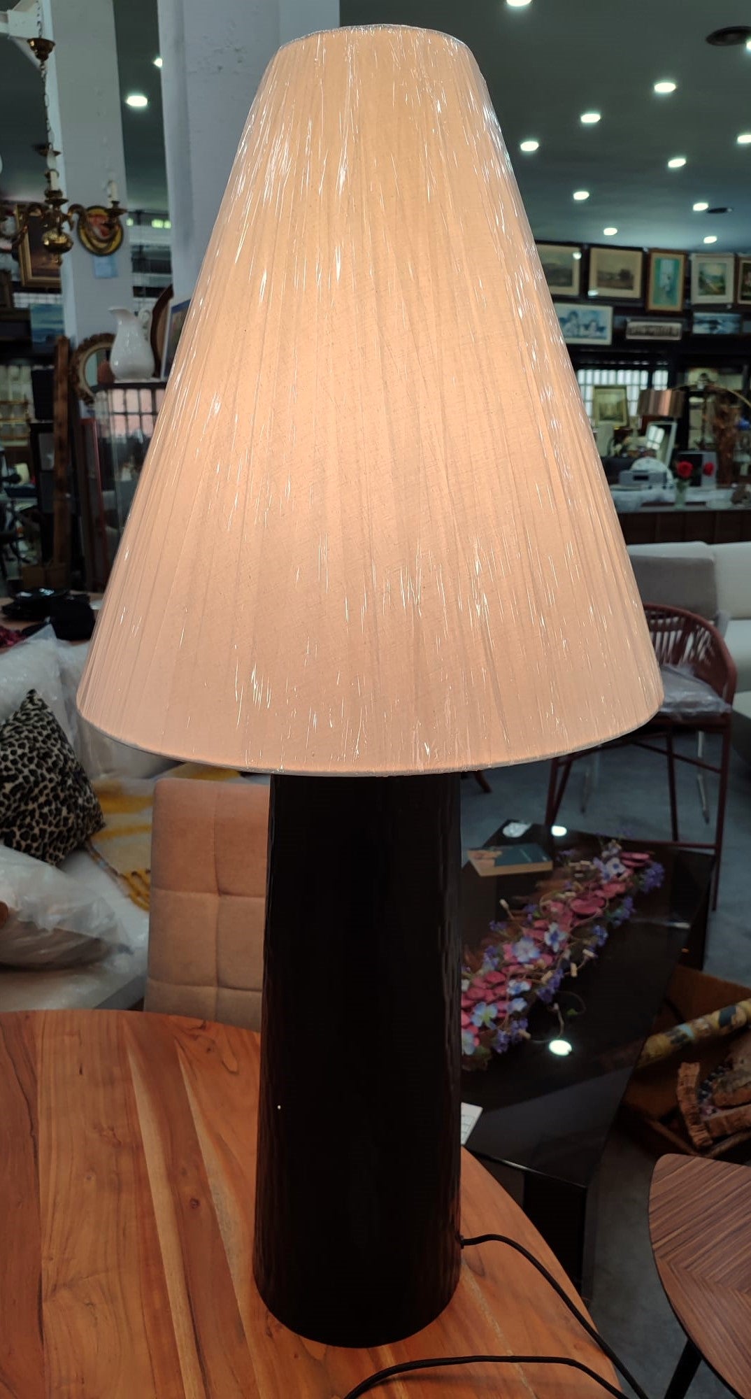 Descripción Lámpara hecha a mano, con texturas y acabados únicos. Pie de metal con acabado pintado negro. Base con grabado que añade textura a la superficie. Pantalla de tejido con acabado natural (44 cm de diámetro). Funciona con una bombilla tipo E27 máx. 40W NO INCLUÍDA. Interruptor de pie en el cable.