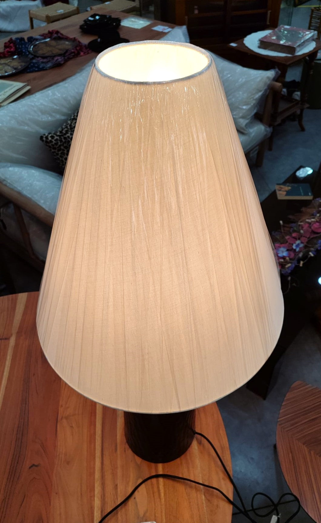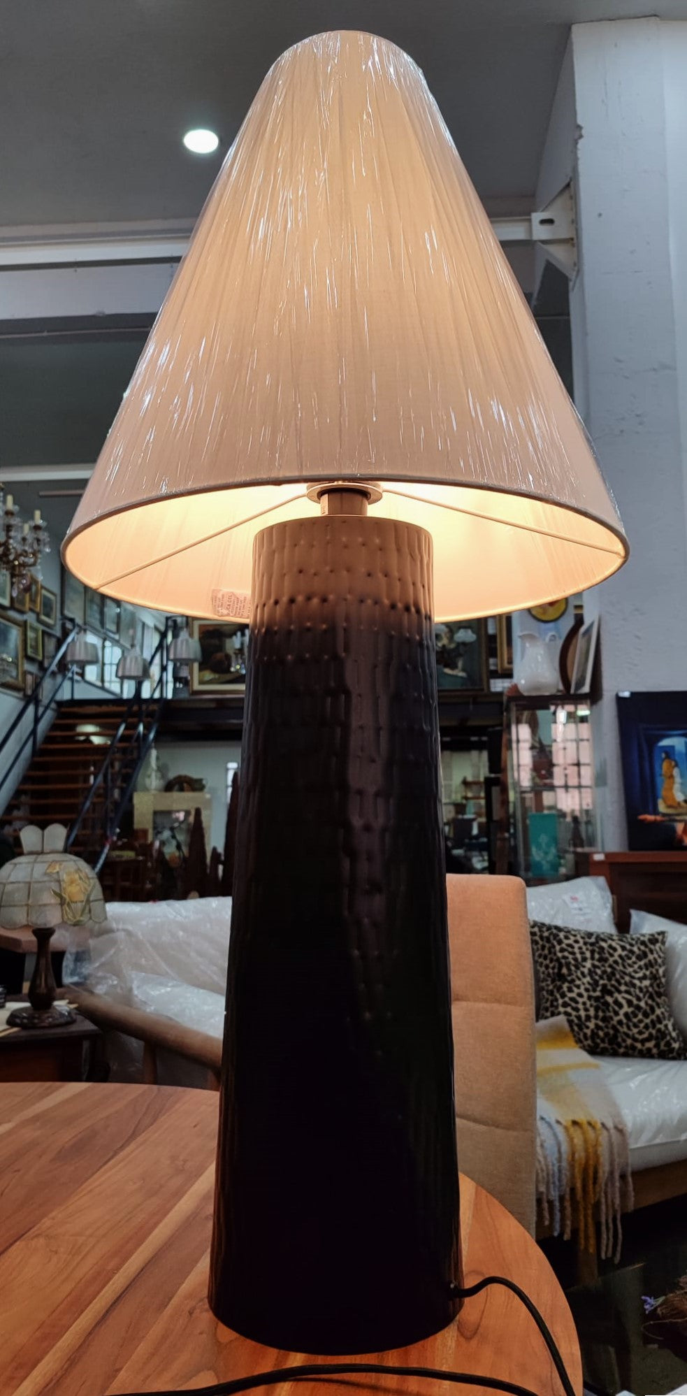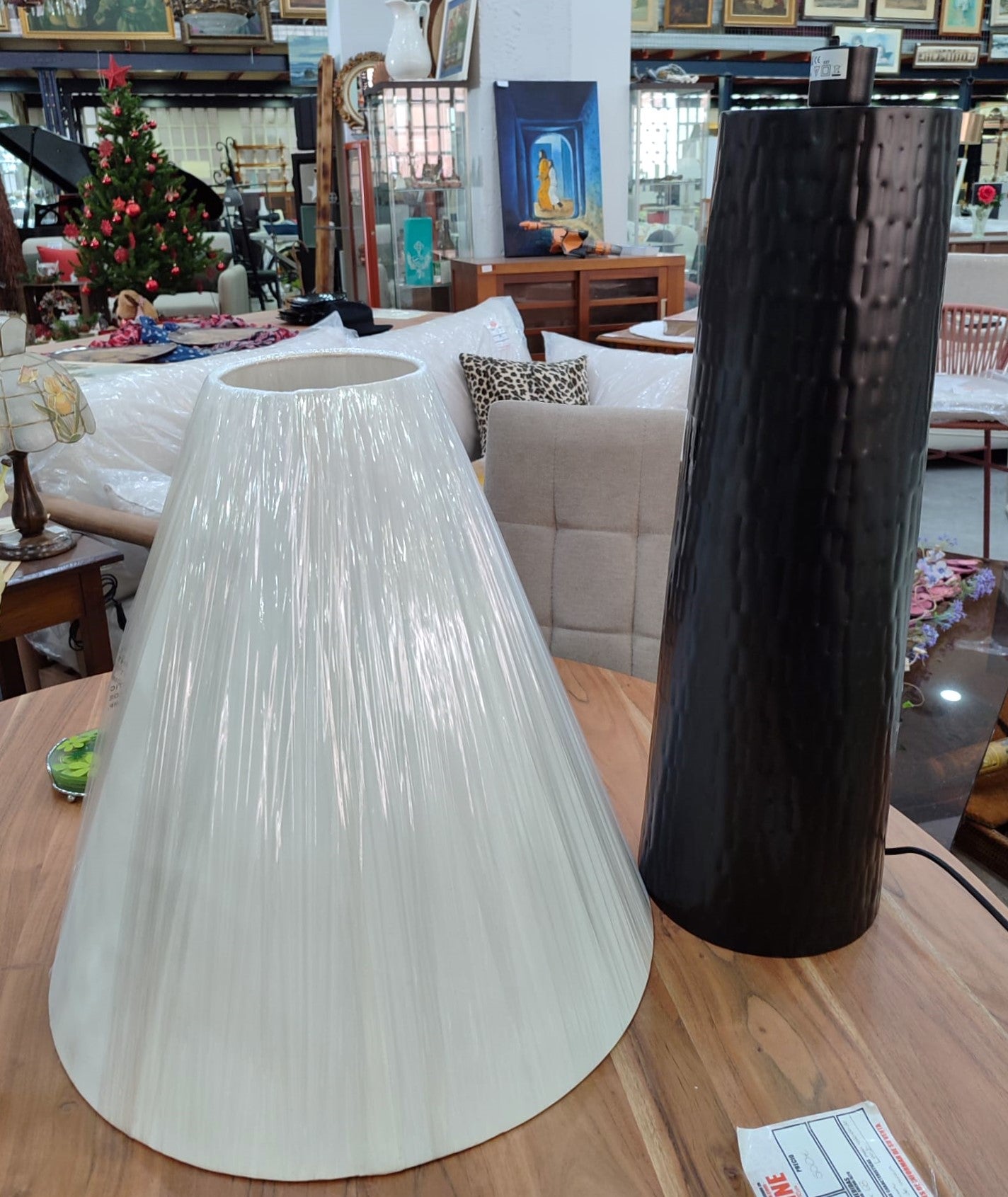 Descripción Lámpara hecha a mano, con texturas y acabados únicos. Pie de metal con acabado pintado negro. Base con grabado que añade textura a la superficie. Pantalla de tejido con acabado natural (44 cm de diámetro). Funciona con una bombilla tipo E27 máx. 40W NO INCLUÍDA. Interruptor de pie en el cable.