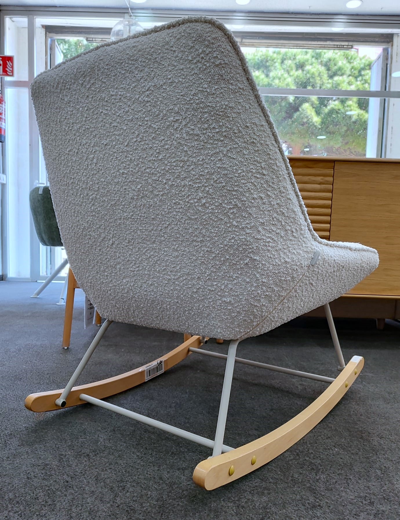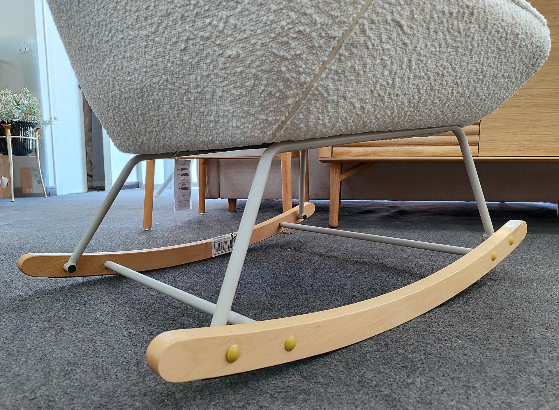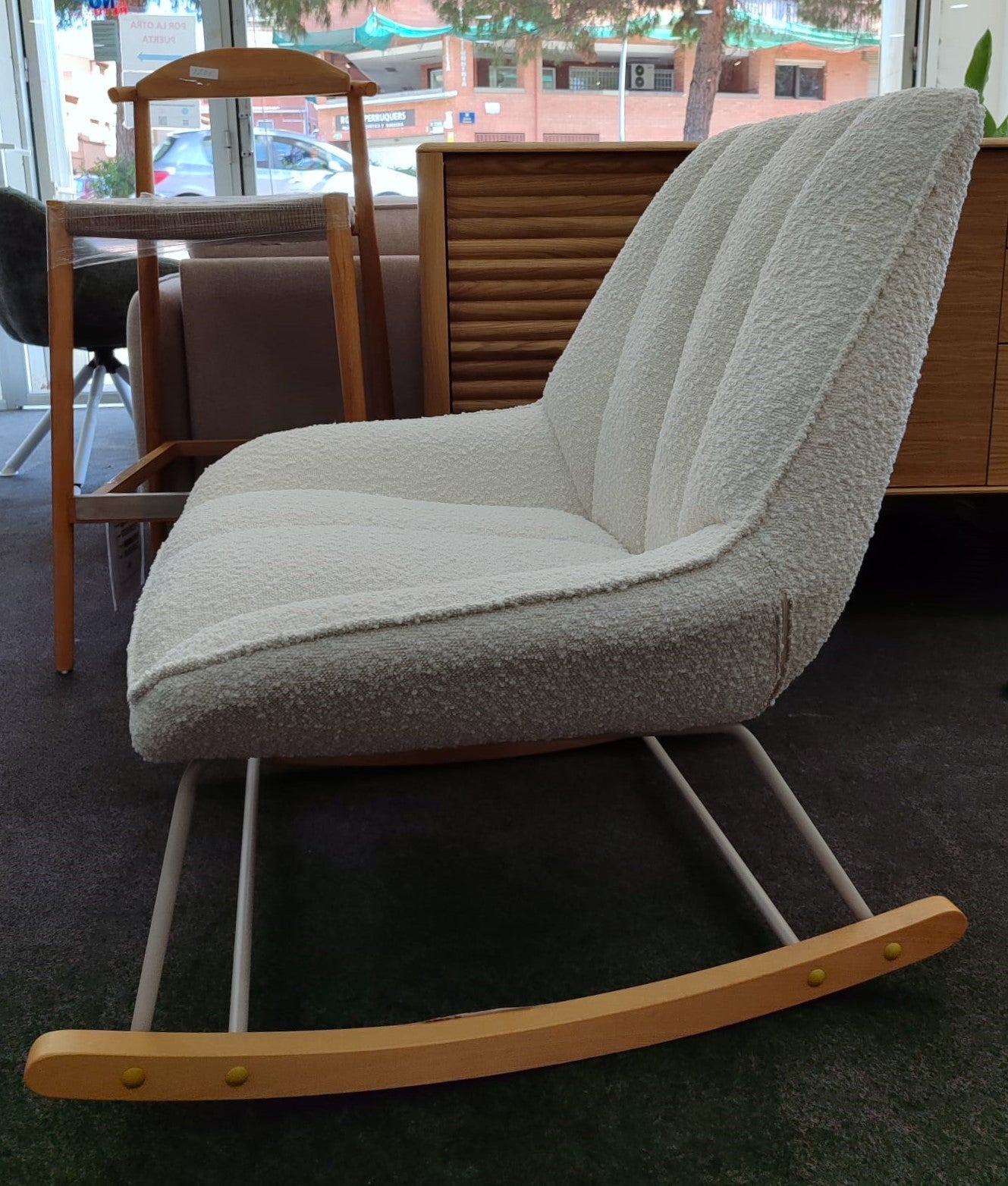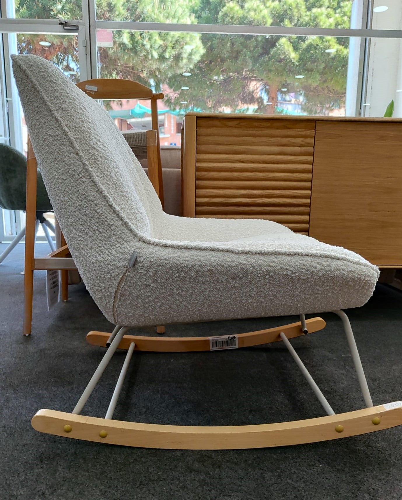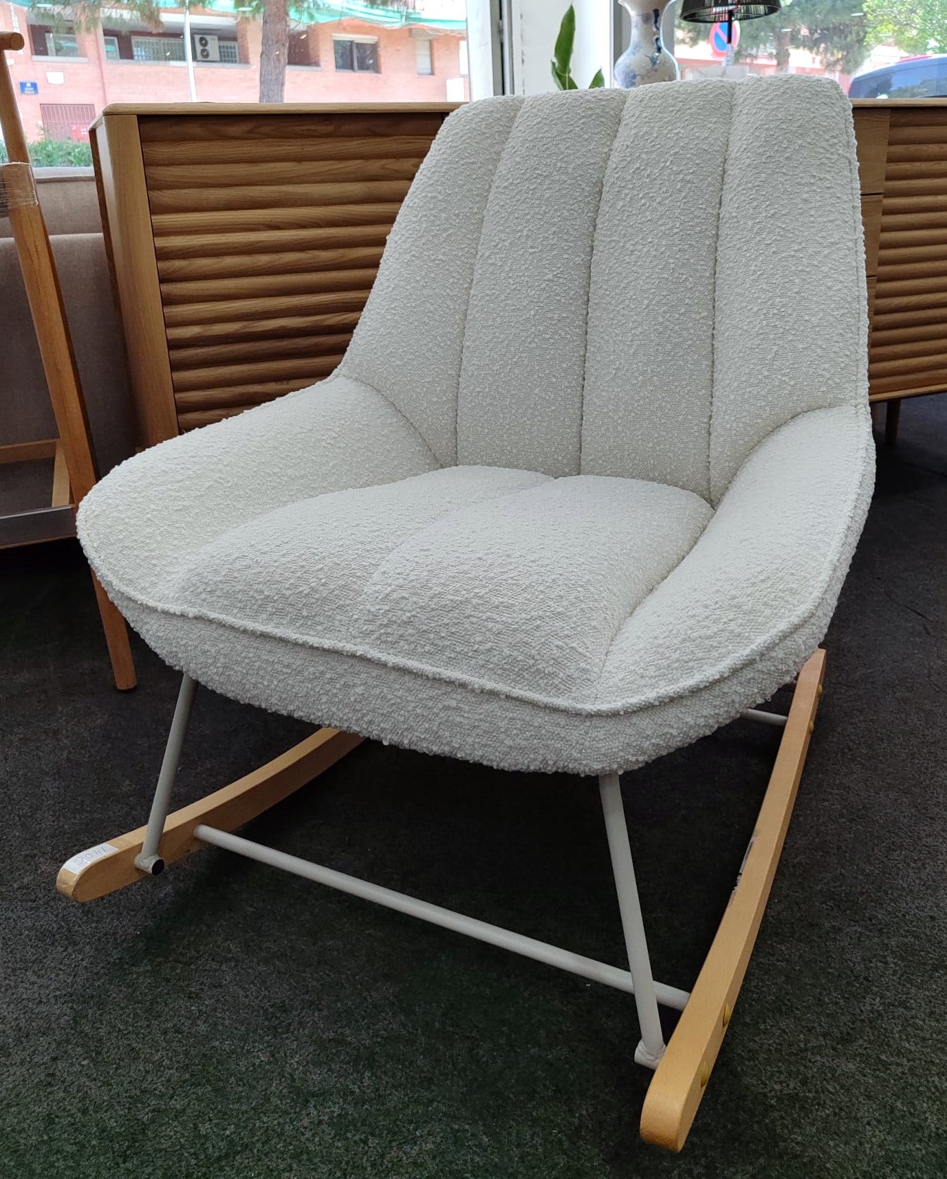 Descripción Mecedora tapizada con tejido estilo borrego. Estructura de metal acabado pintado blanco. Balancines de madera maciza de haya acabado natural. Respaldo y asiento acolchado de espuma de densidad media.