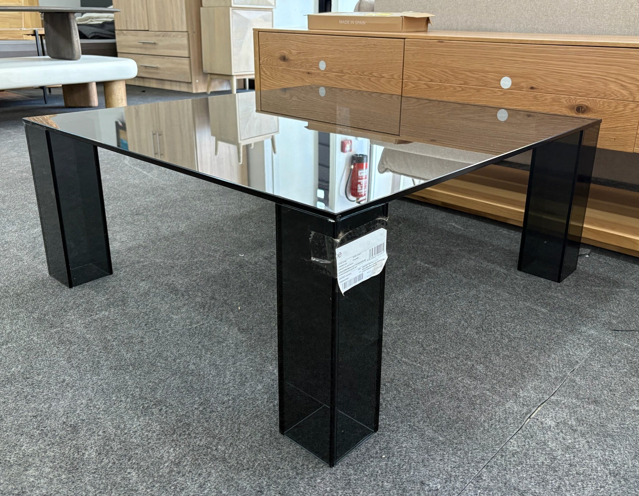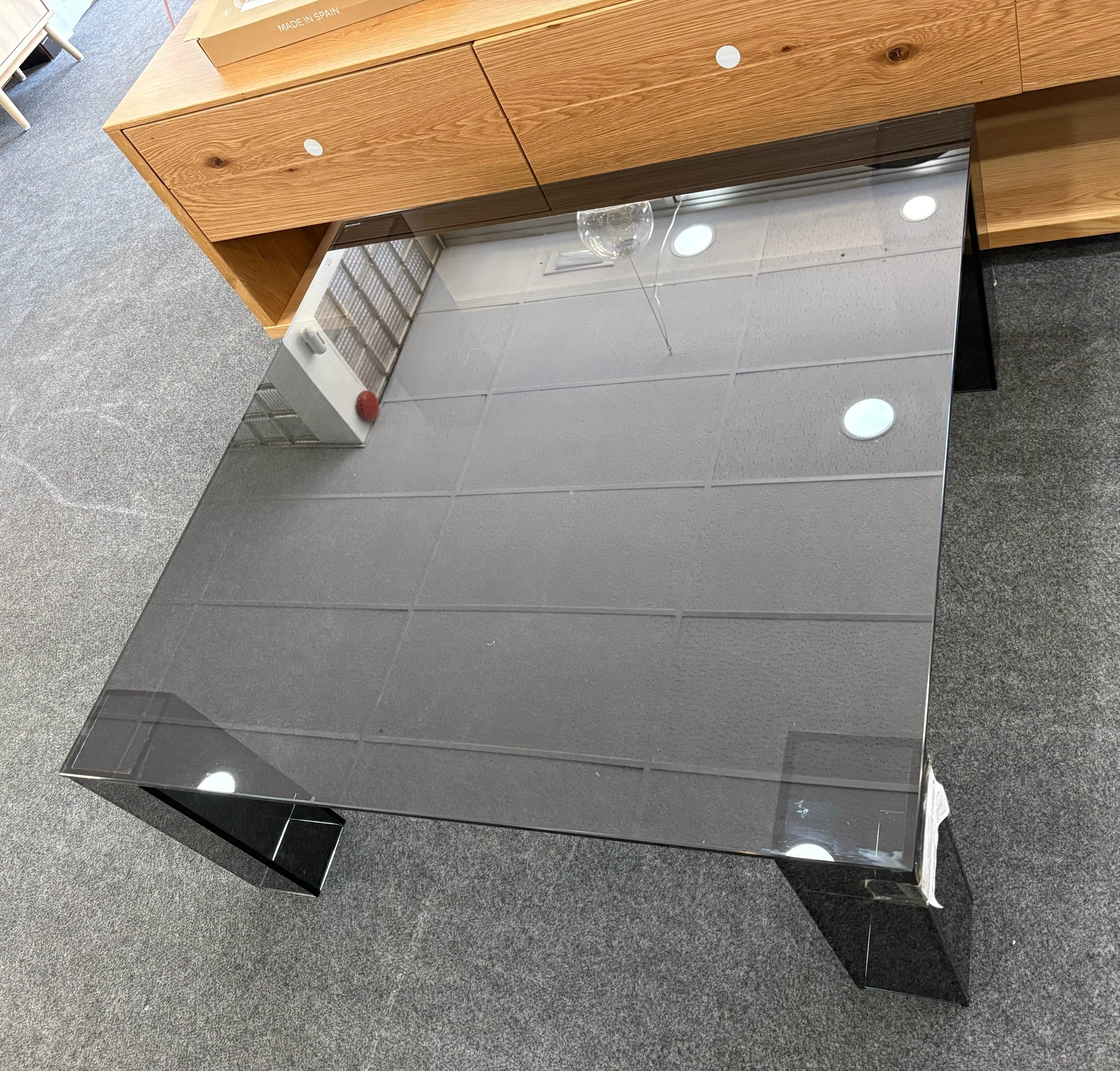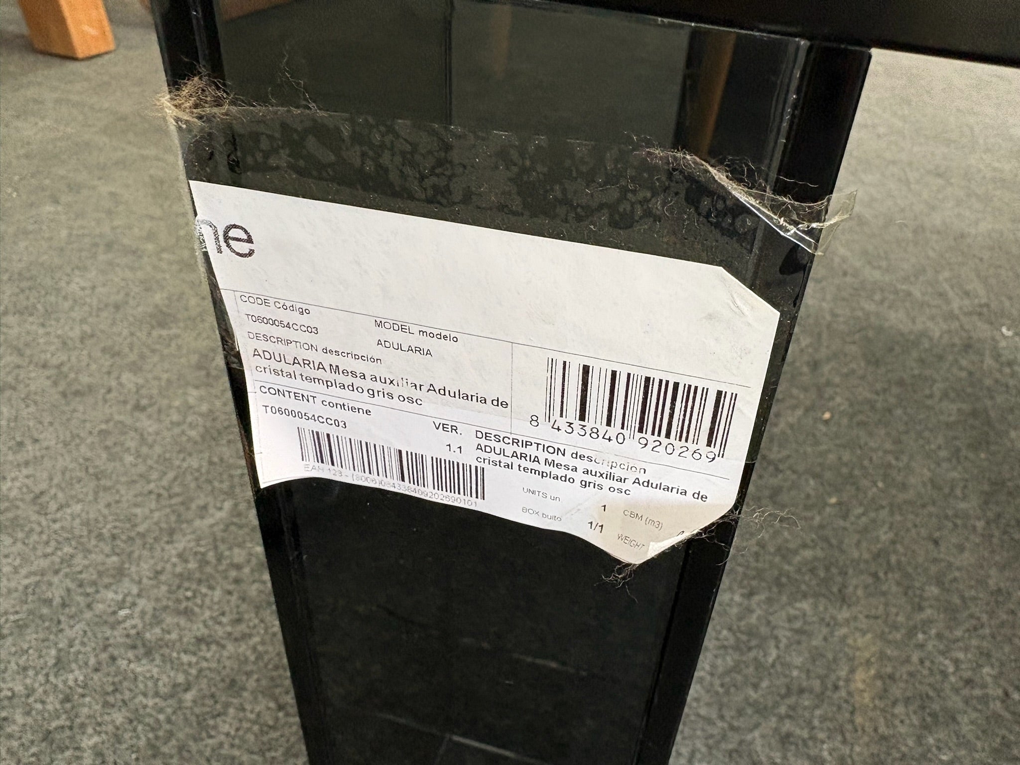 - Mesa auxiliar hecha de cristal templado gris oscuro.