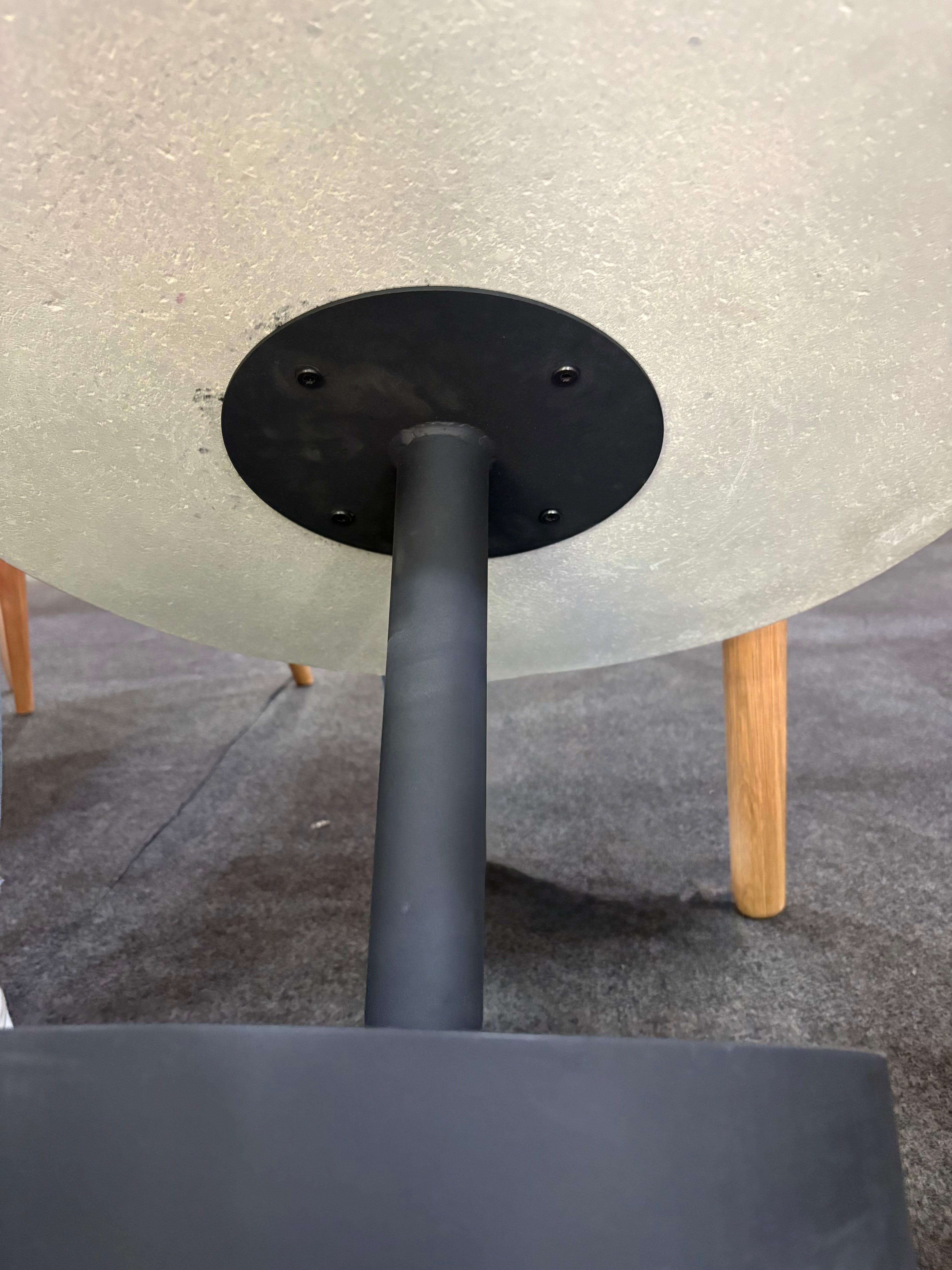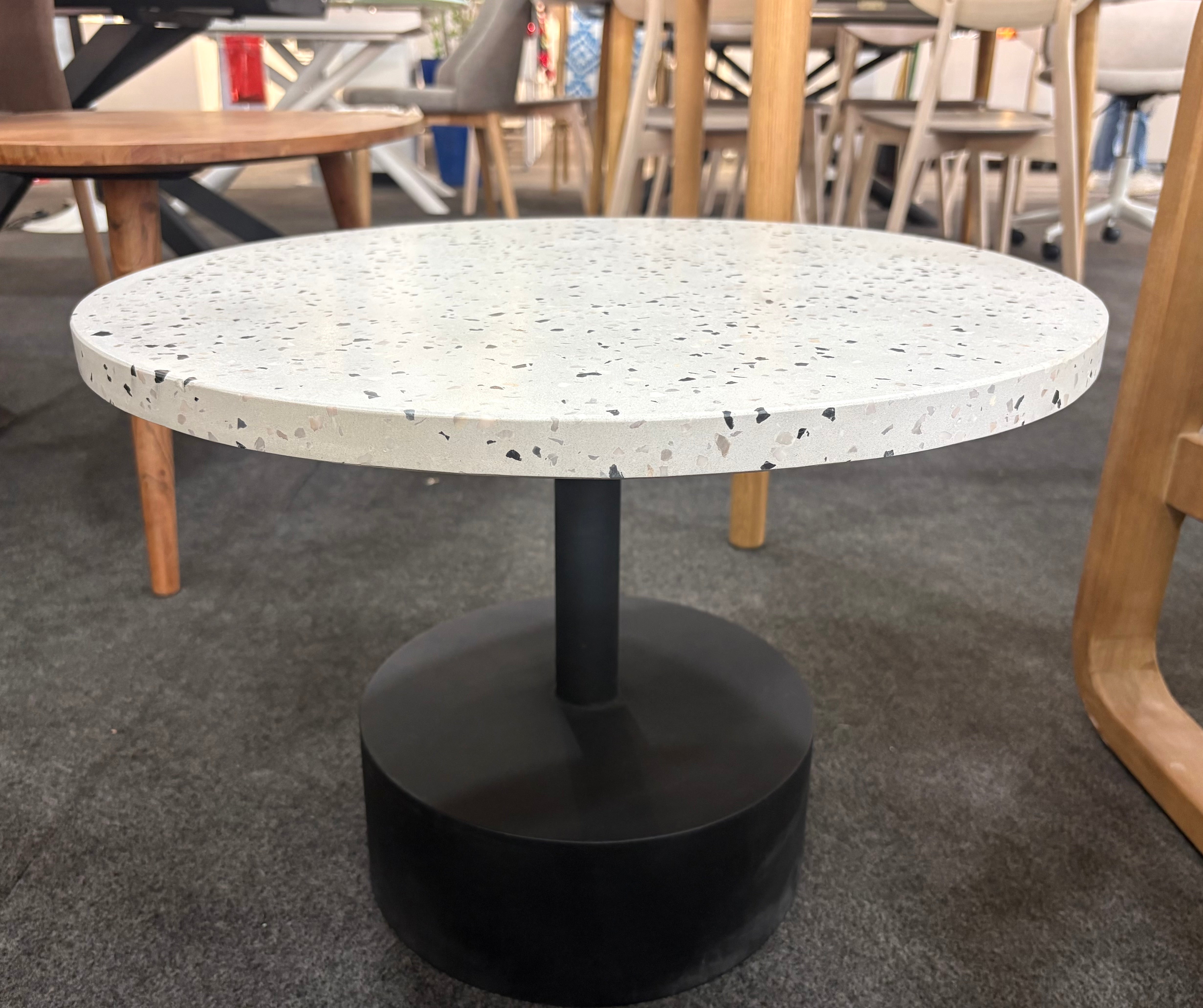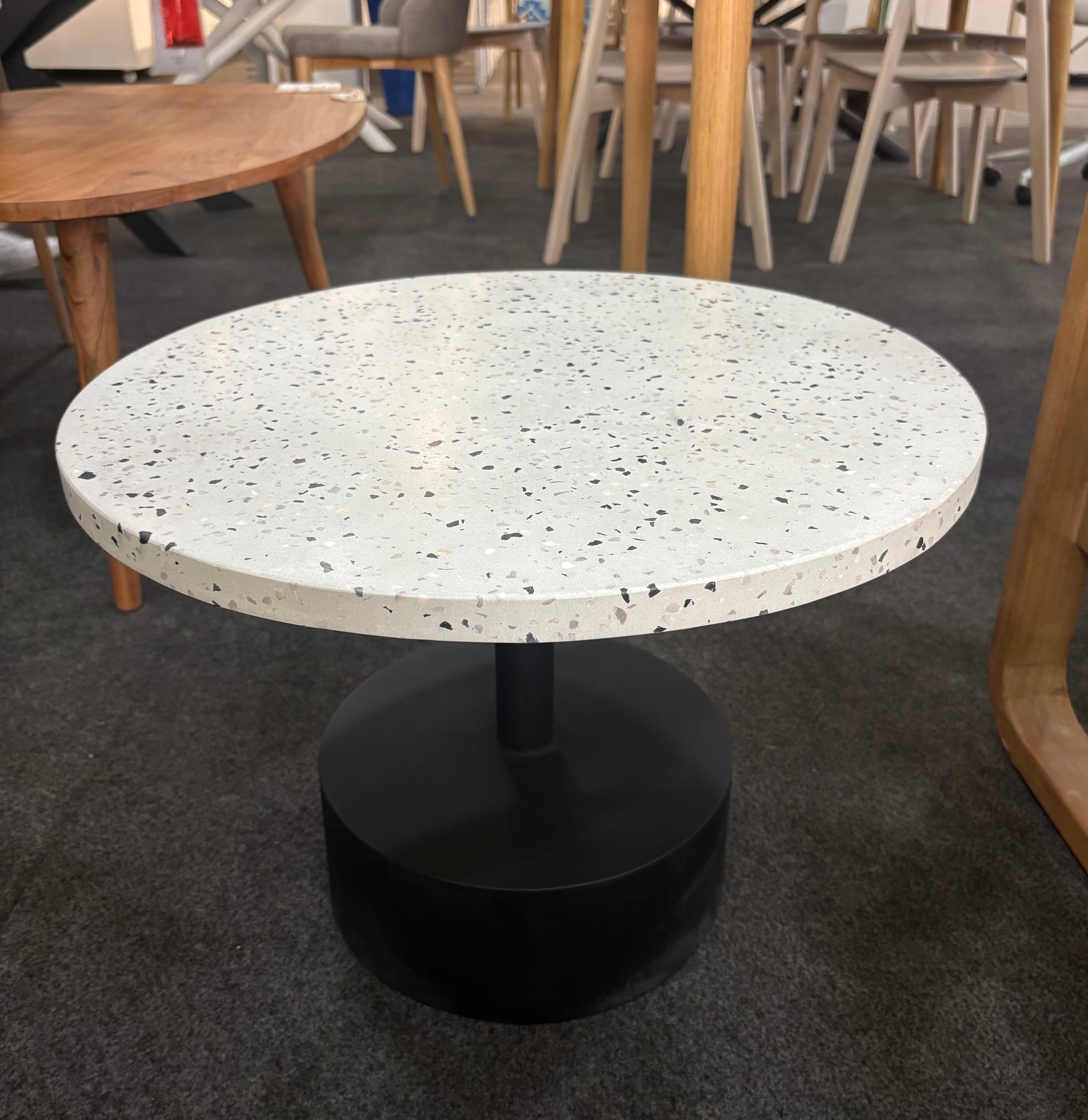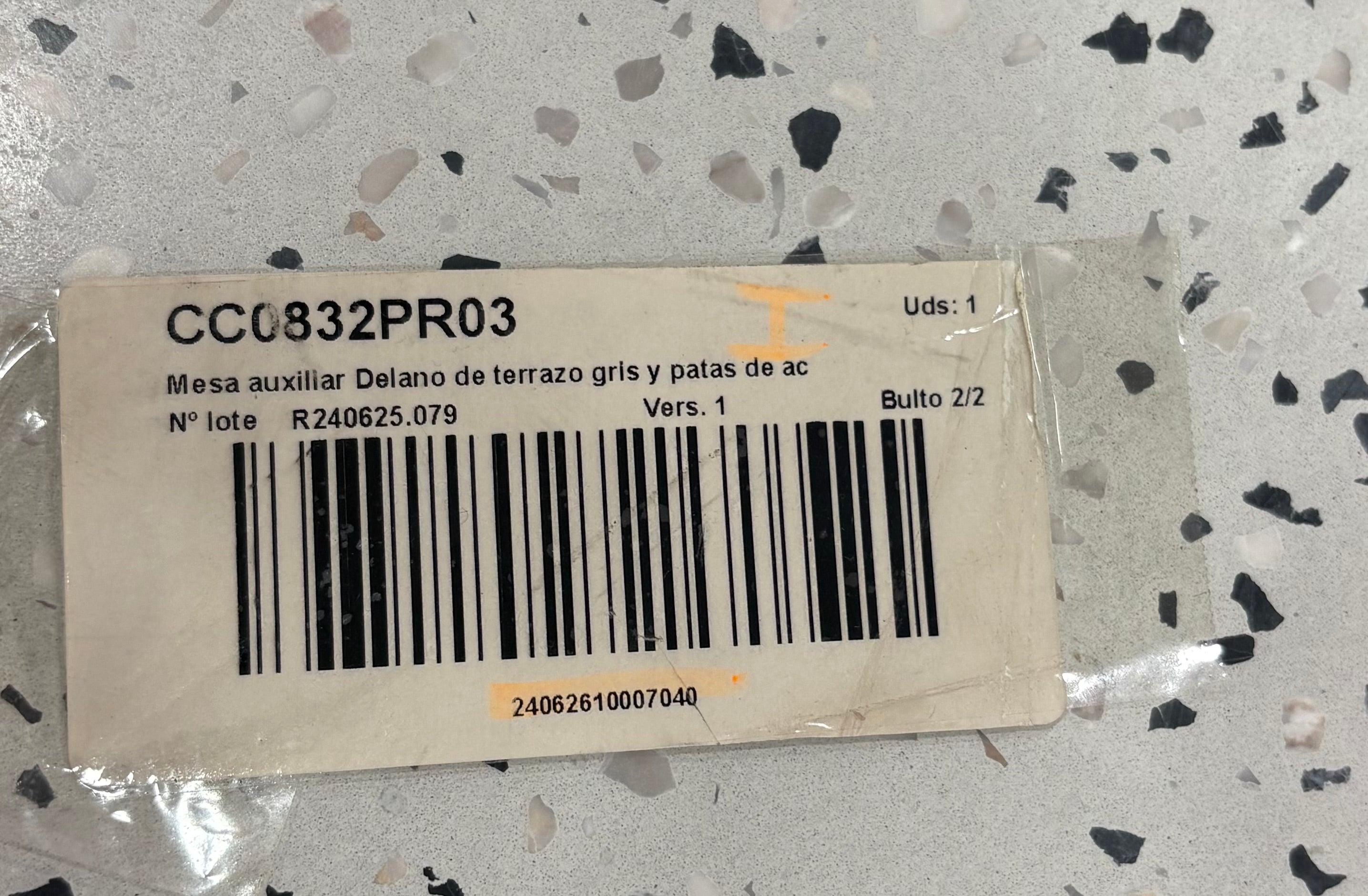 - Mesa auxiliar con sobre cerámico de terrazo con fondo gris.