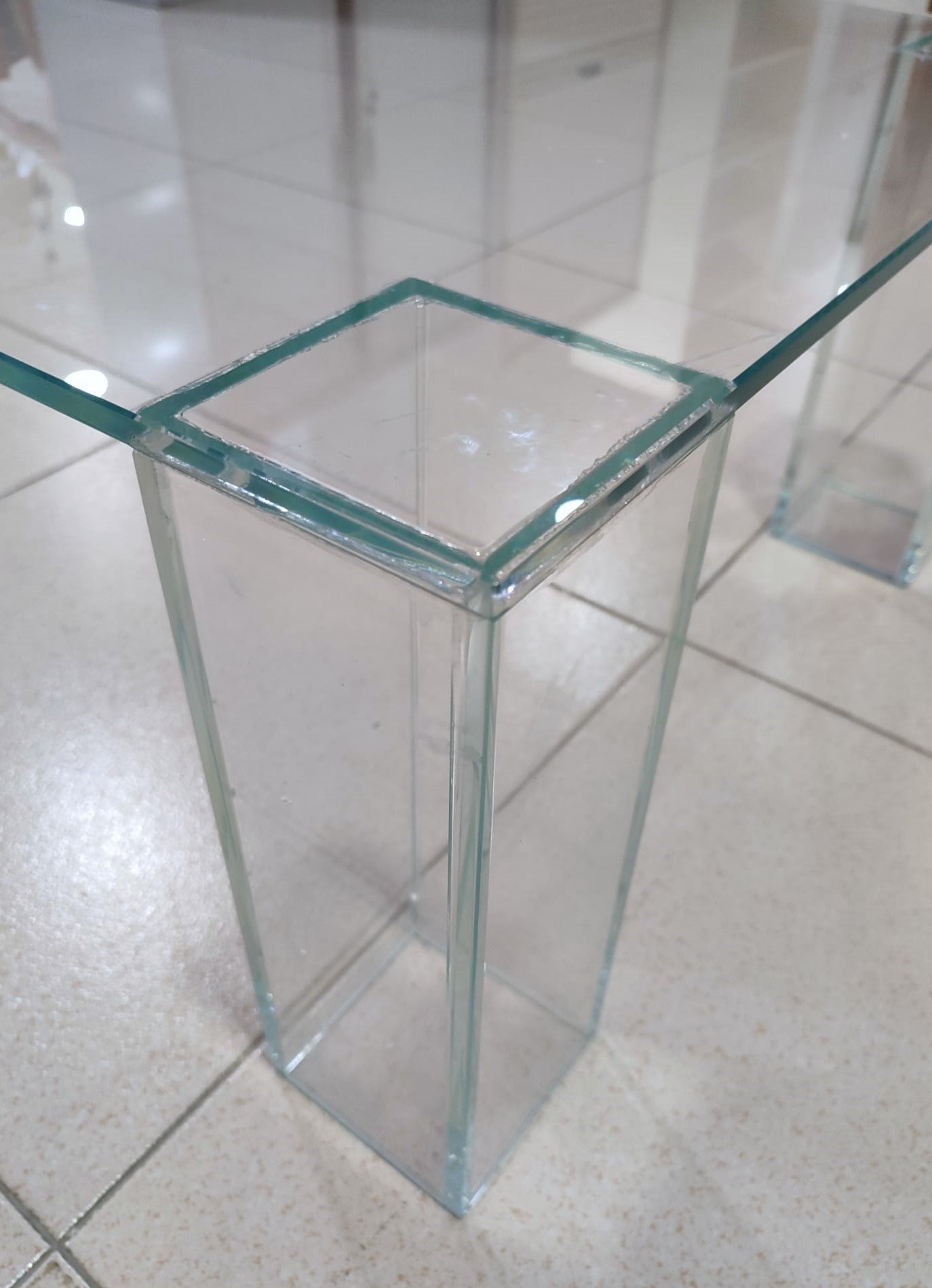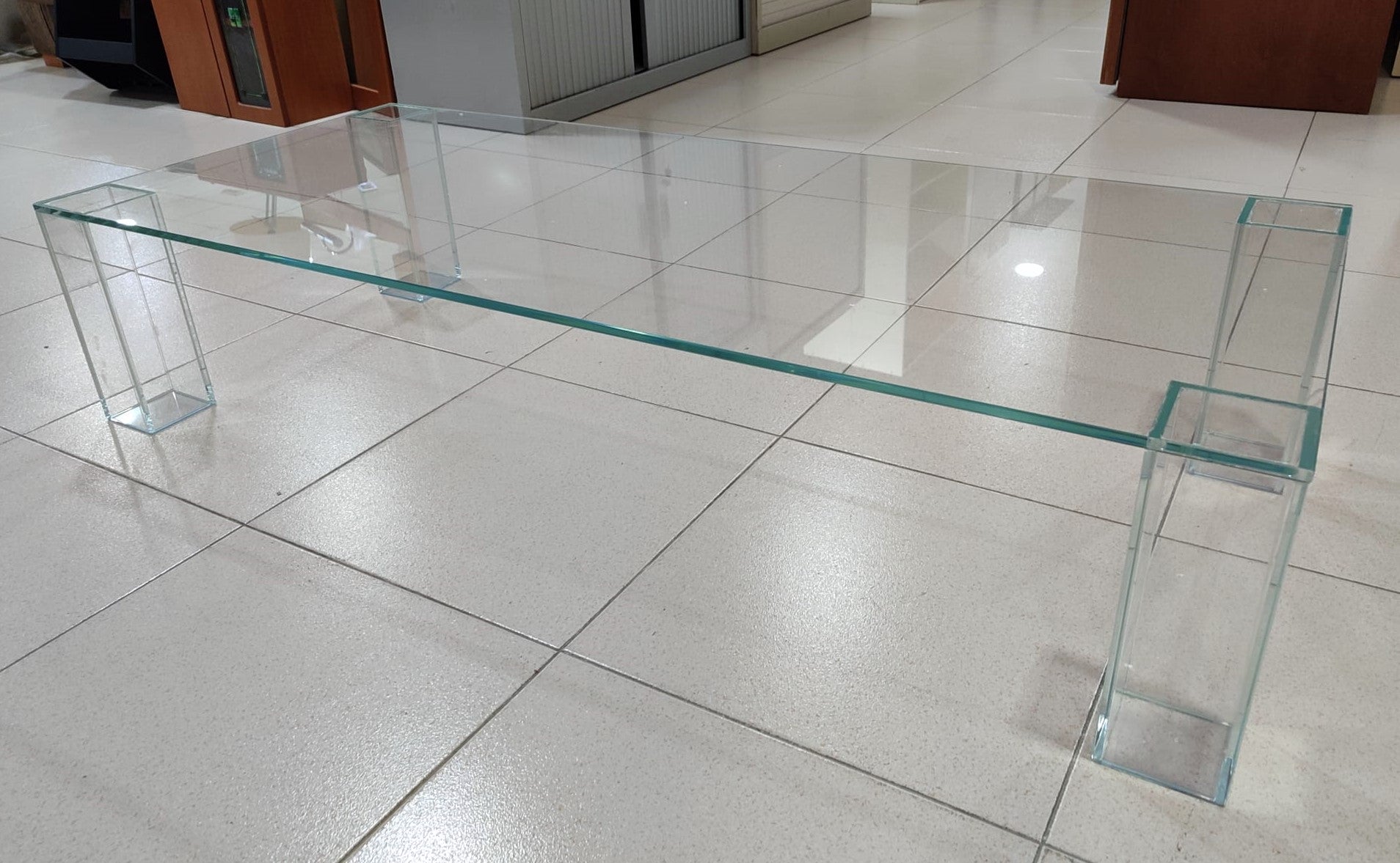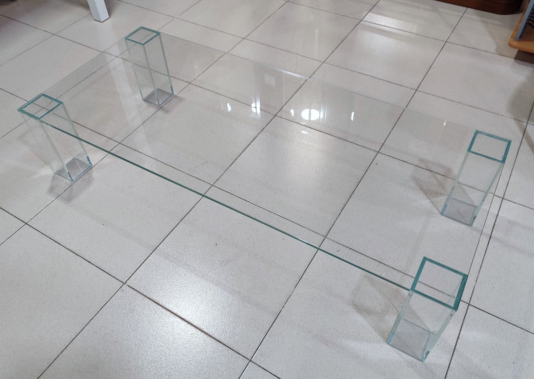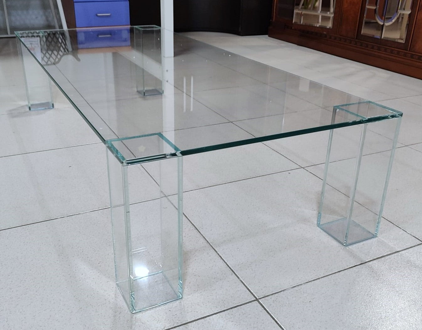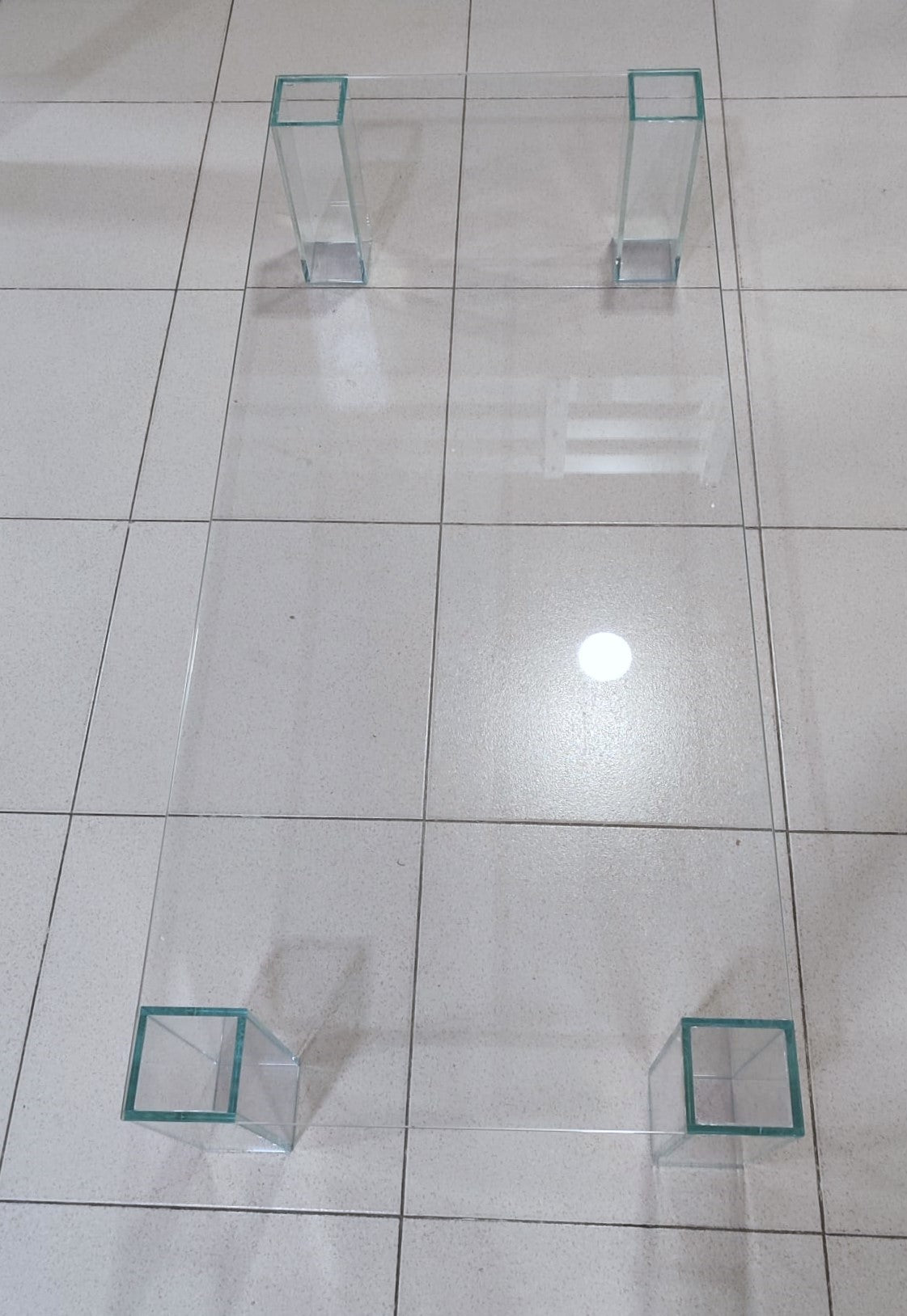 Descripción Mesa de centro hecha de vidrio templado transparente. Unión invisible entre el sobre y las patas.