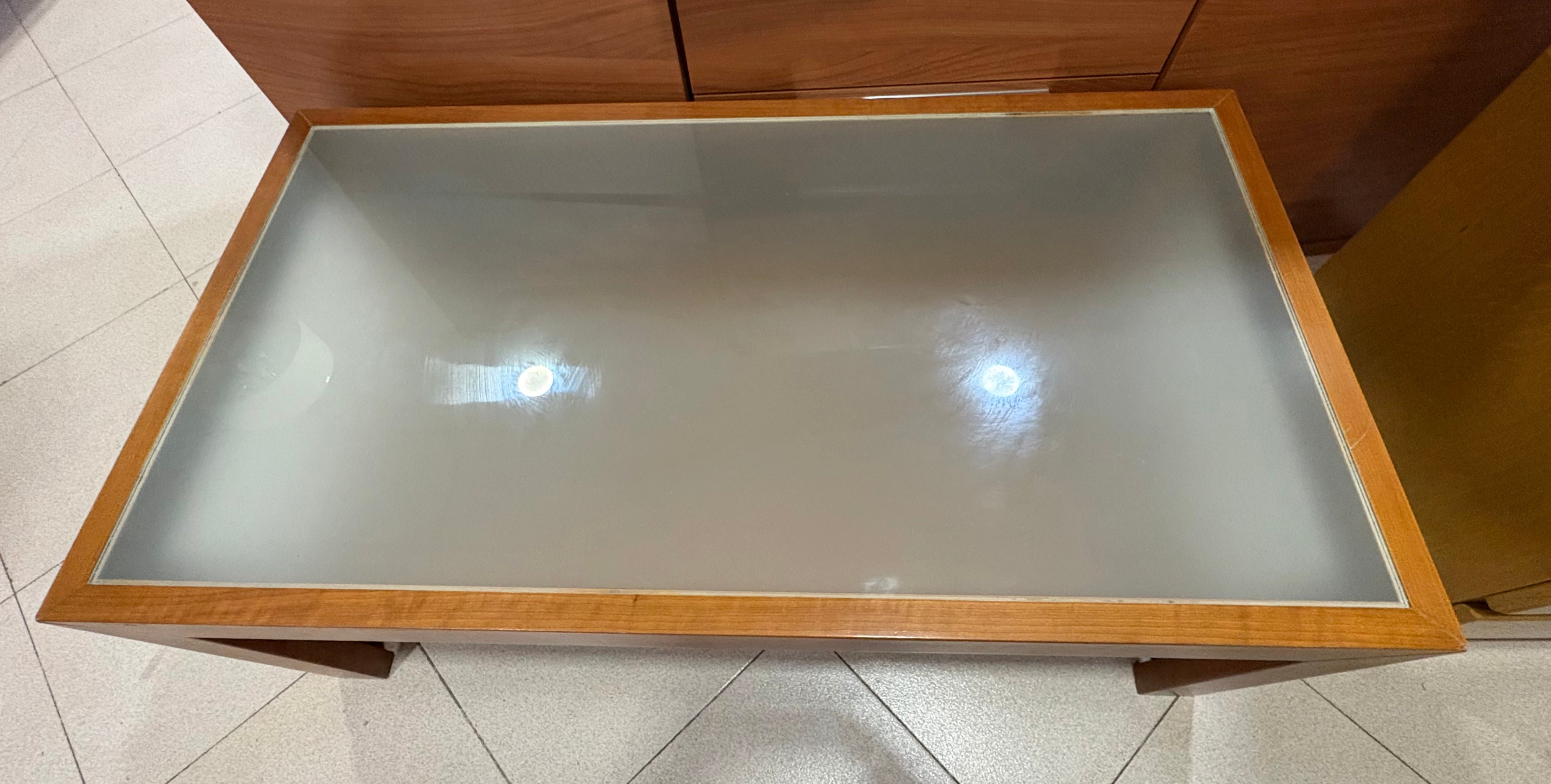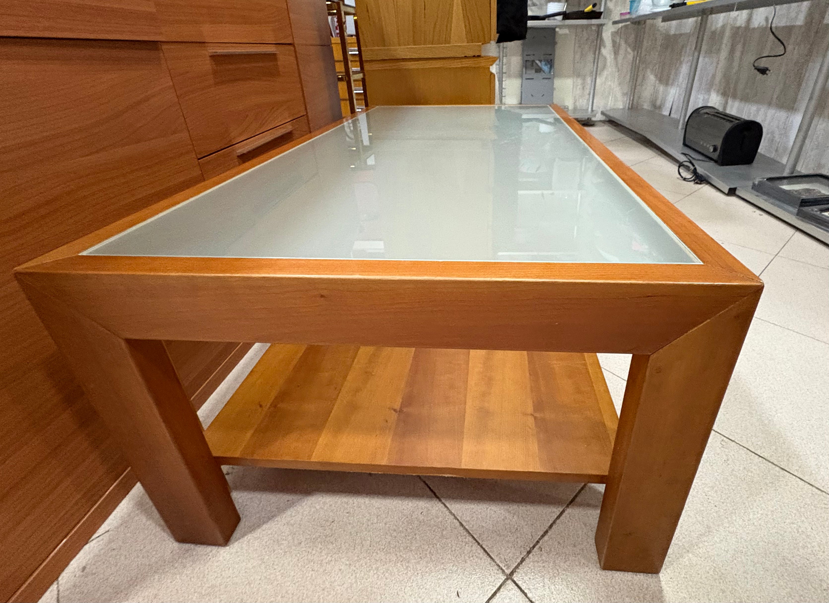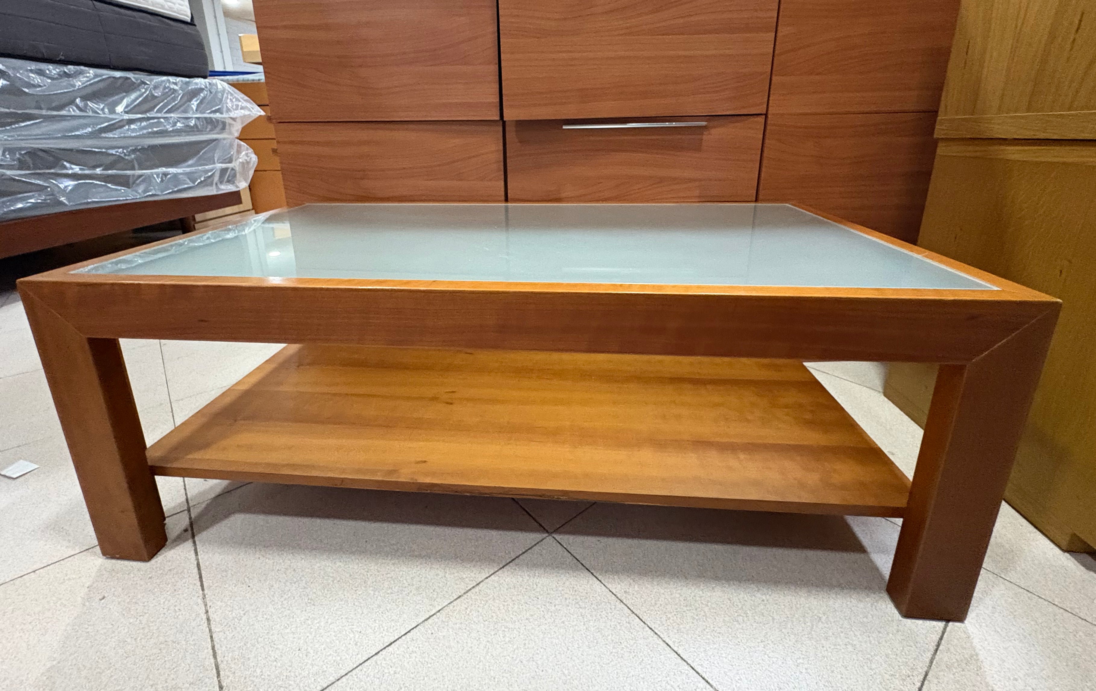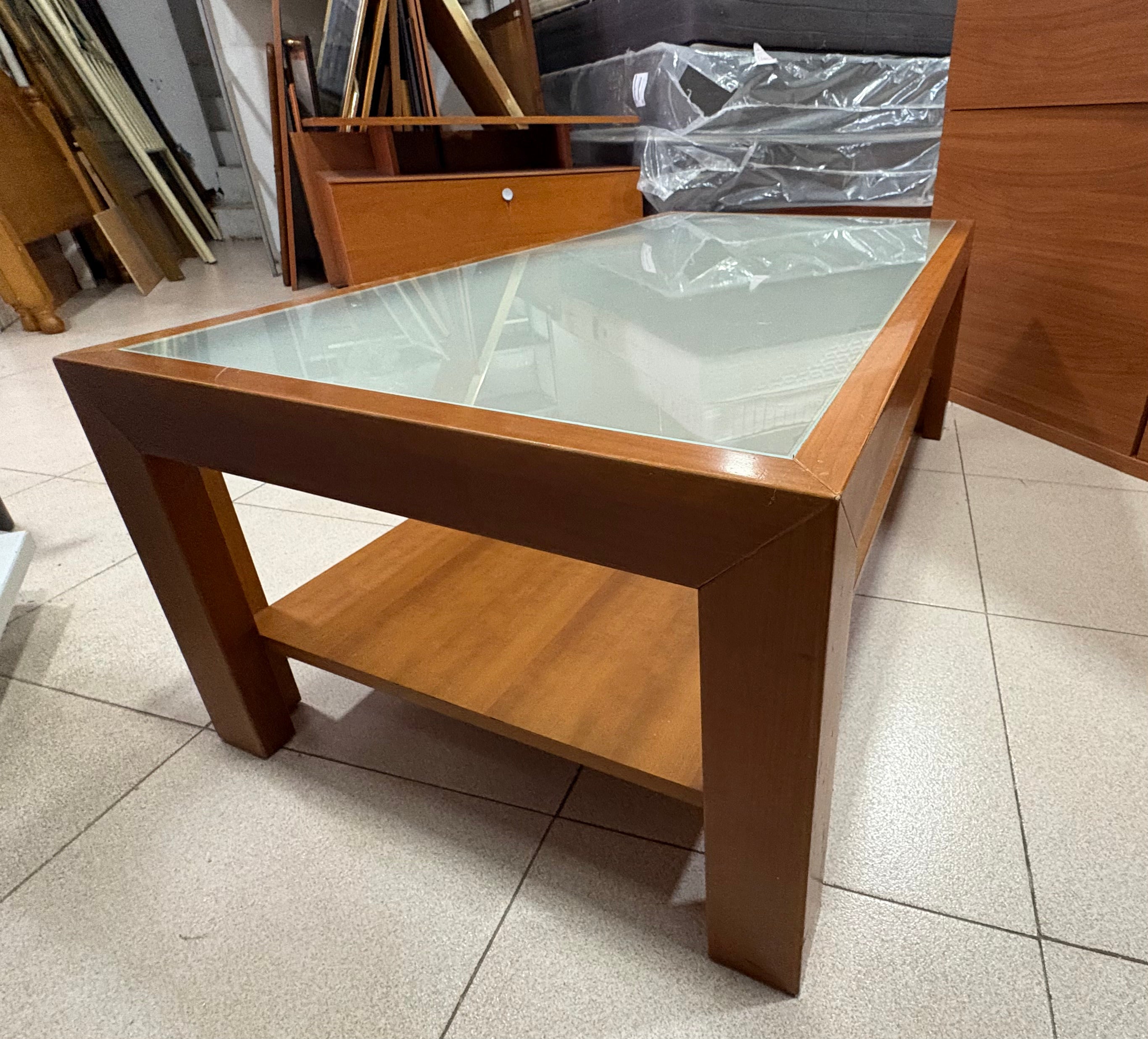 Mesa de centro con estructura de madera y superficie de vidrio.