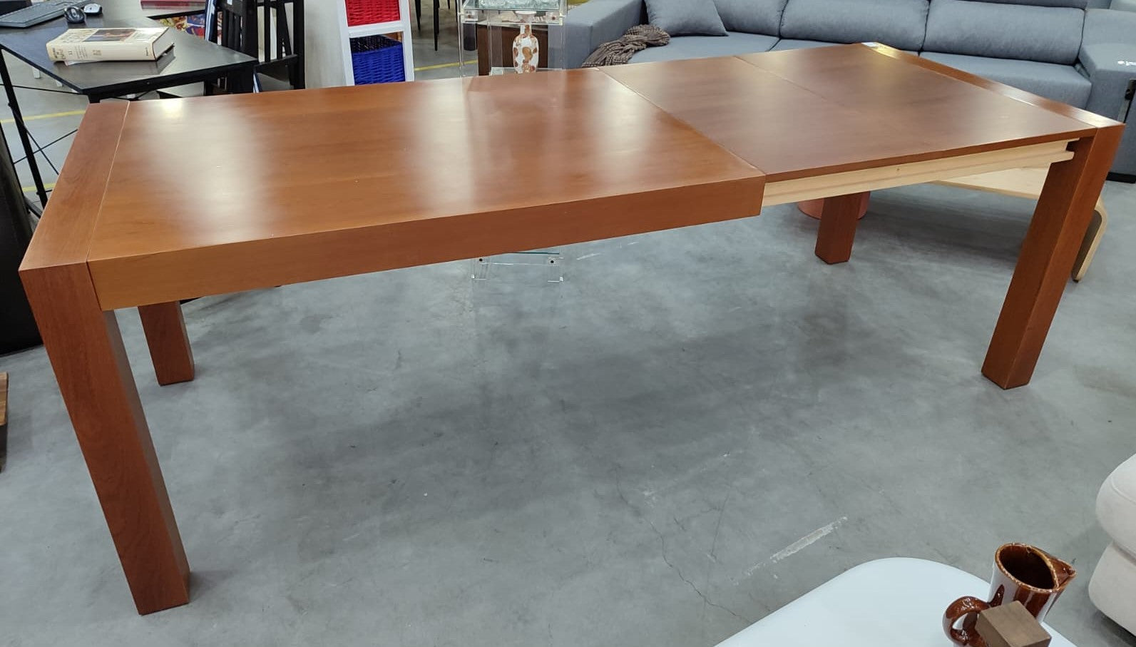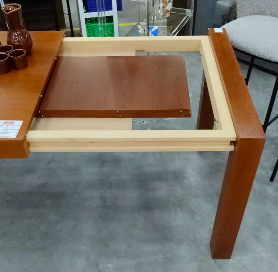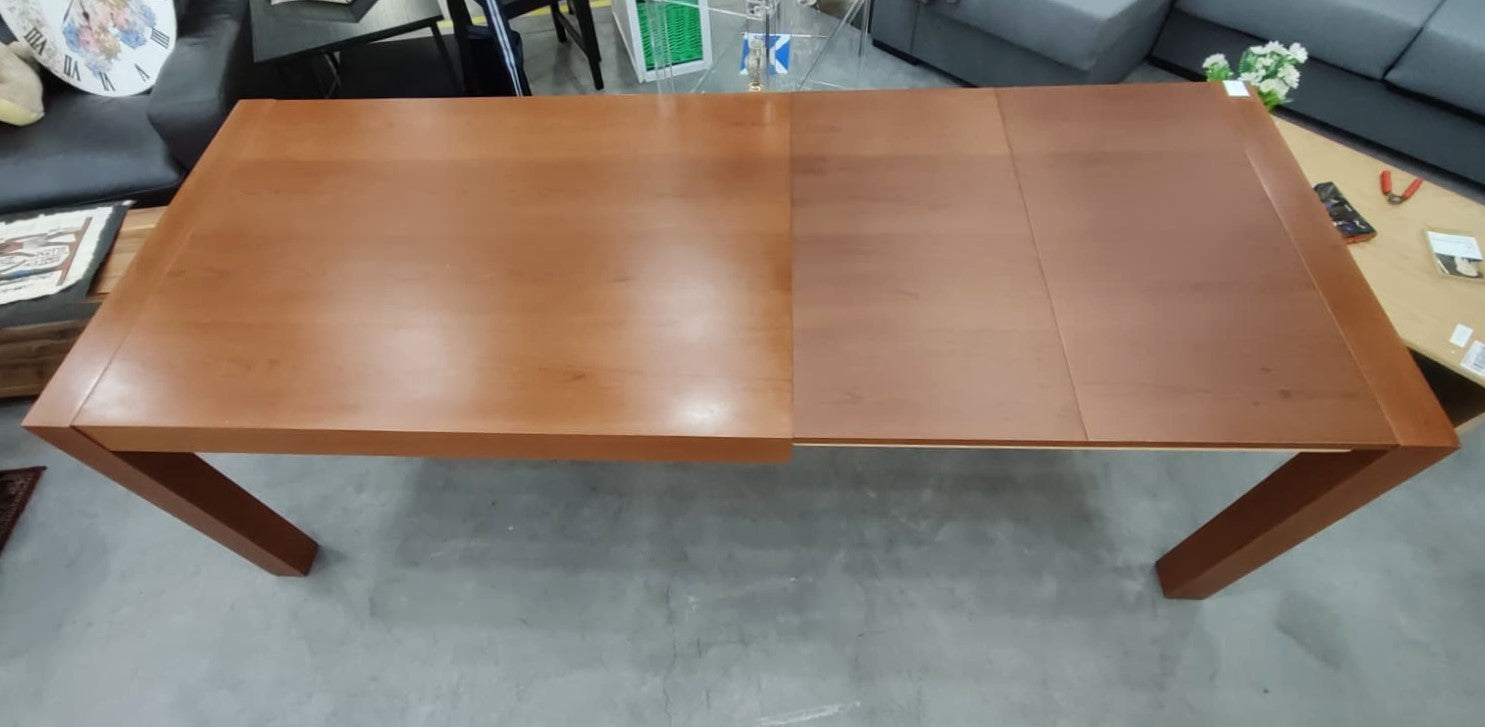 Descripción Mesa de madera aglomerada con acabado de melamina. Capacidad para acoger hasta 10 personas. Sistema de extensión fácil de usar, estirando uno de los extremos y colocando en su sitio las dos piezas anexas bajo la mesa. Defecto: La capa de melamina está un poco dañada en la encimera solo donde se ve en las fotos adjuntas.
