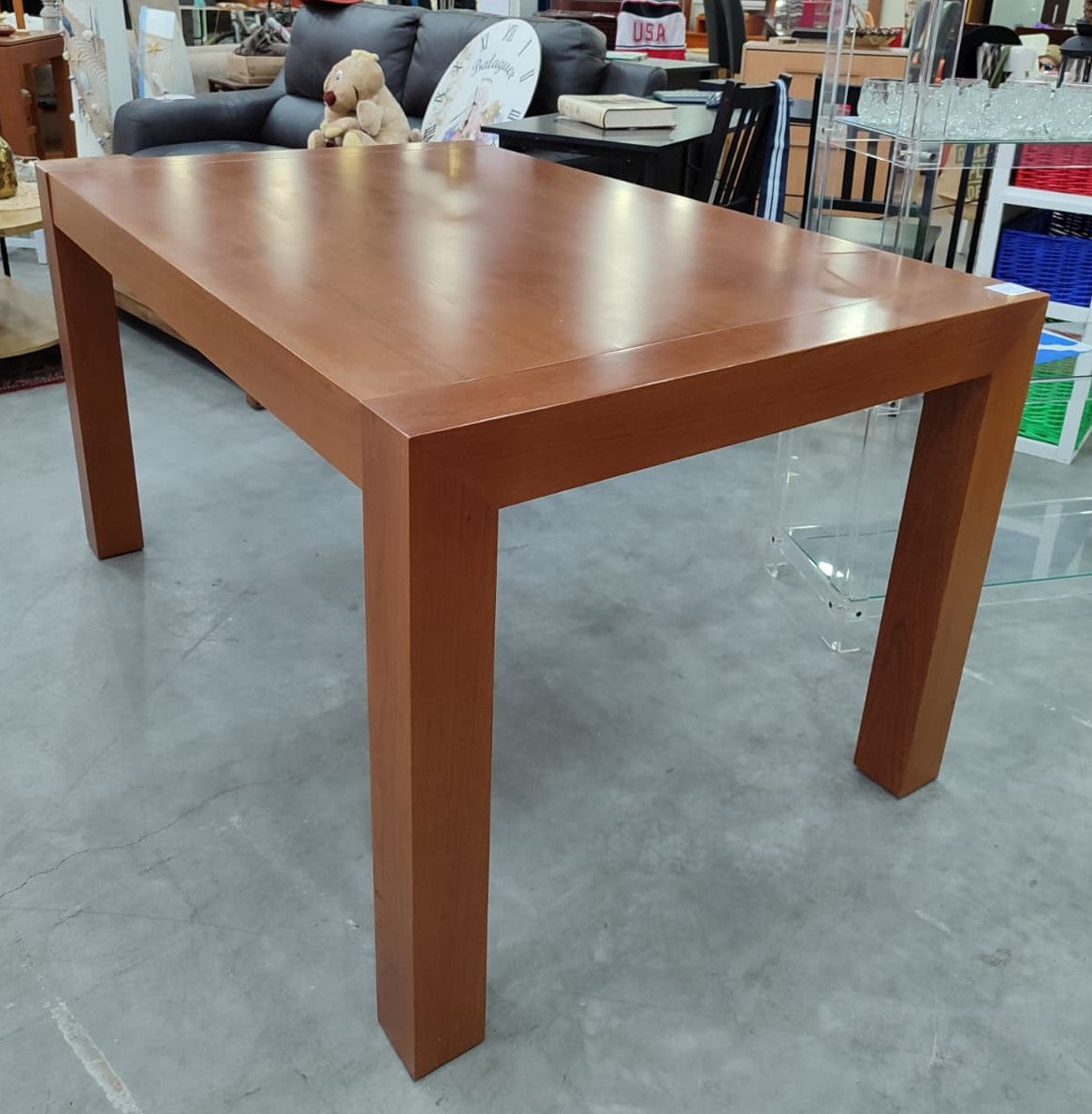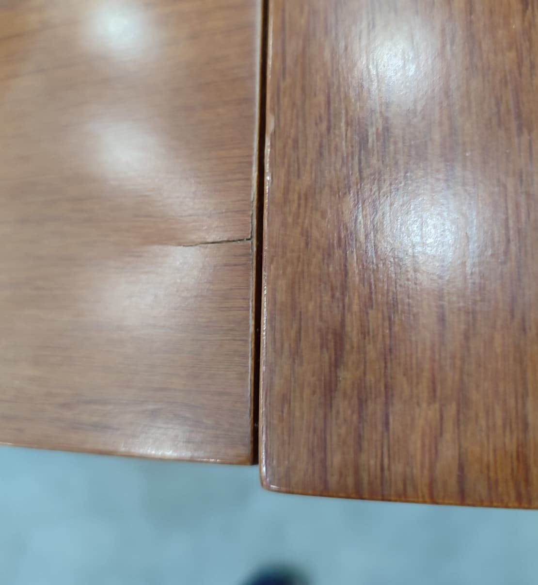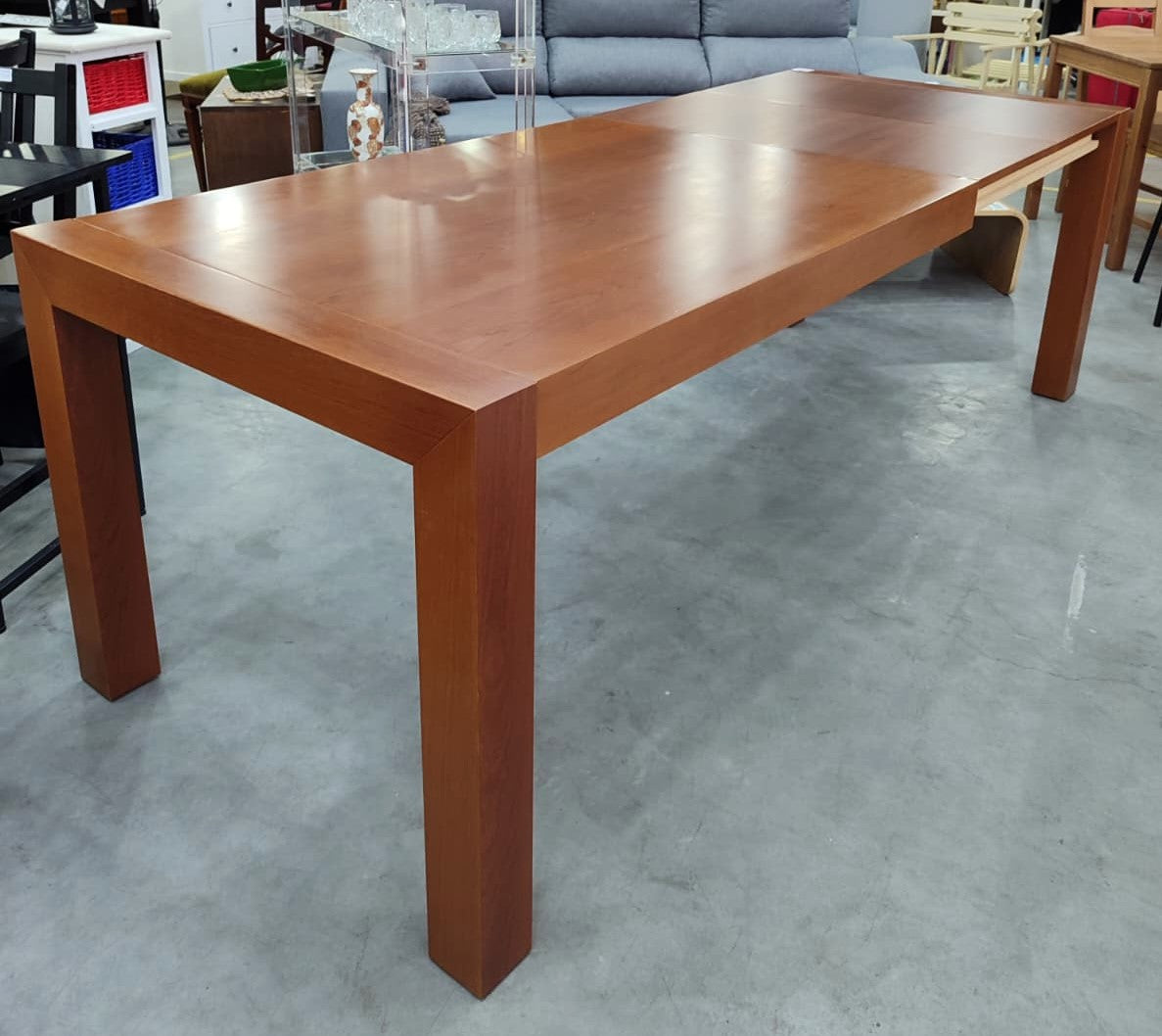Descripción Mesa de madera aglomerada con acabado de melamina. Capacidad para acoger hasta 10 personas. Sistema de extensión fácil de usar, estirando uno de los extremos y colocando en su sitio las dos piezas anexas bajo la mesa. Defecto: La capa de melamina está un poco dañada en la encimera solo donde se ve en las fotos adjuntas.