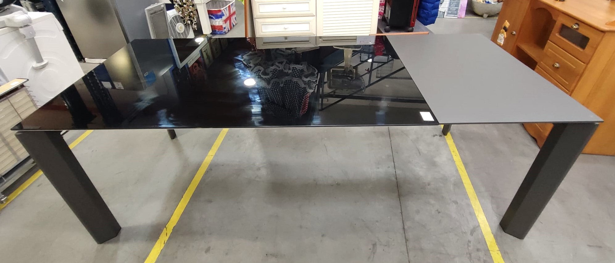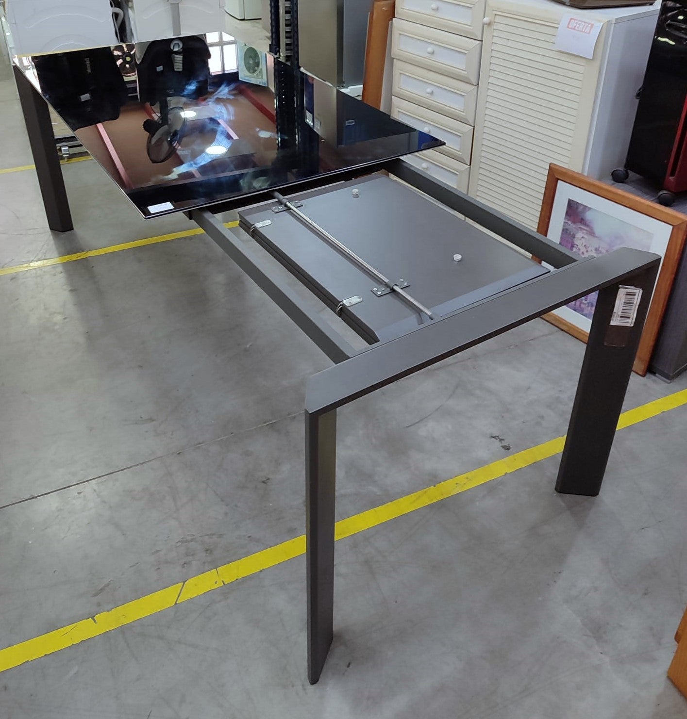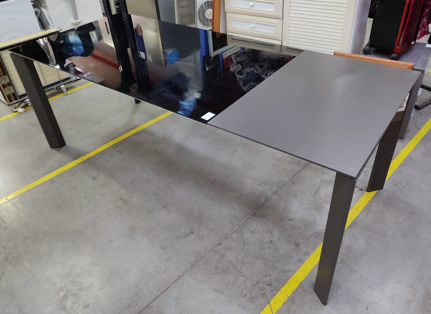 Descripción Mesa extensible de estilo moderno, capacidad para acoger de 4 a 8 comensales. Sobre de cristal templado color negro. Patas de acero. El extensible tiene un acabado lacado en poliuretano que se diferencia del resto del sobre a simple vista. Mecanismo de extensión mariposa. Estirando por uno de los extremos y colocando el anexo en su sitio.
