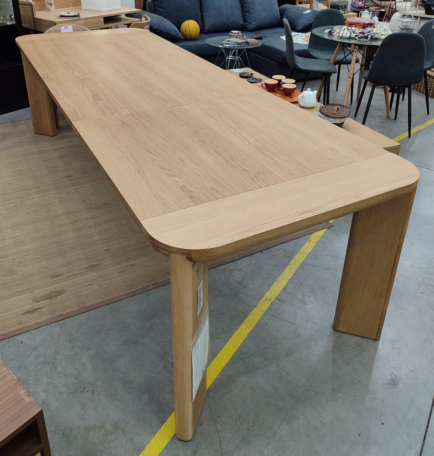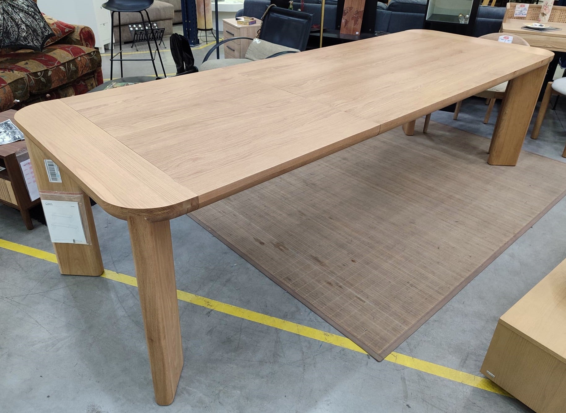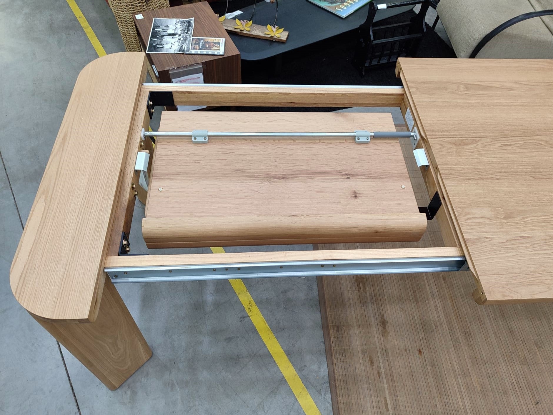 Descripción Mesa extensible con sobre chapado y patas de roble macizo con acabado natural. Capacidad para acoger de 8 a 12 comensales. Mecanismo extensible fácil de usar, estirando por uno de los costados y encajando en su sitio la pieza adjunta. Extensión de 80 cm oculta en el interior de la mesa.