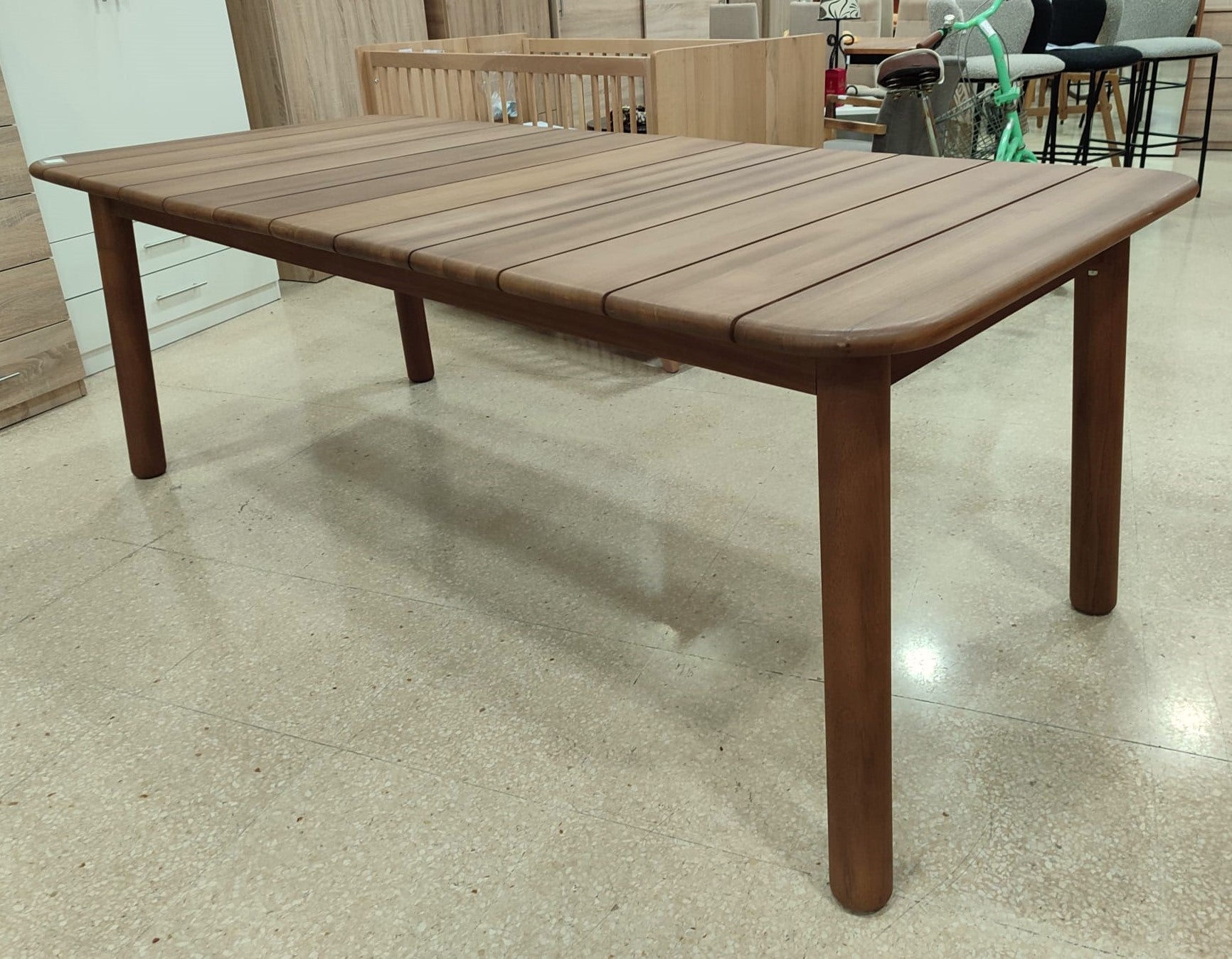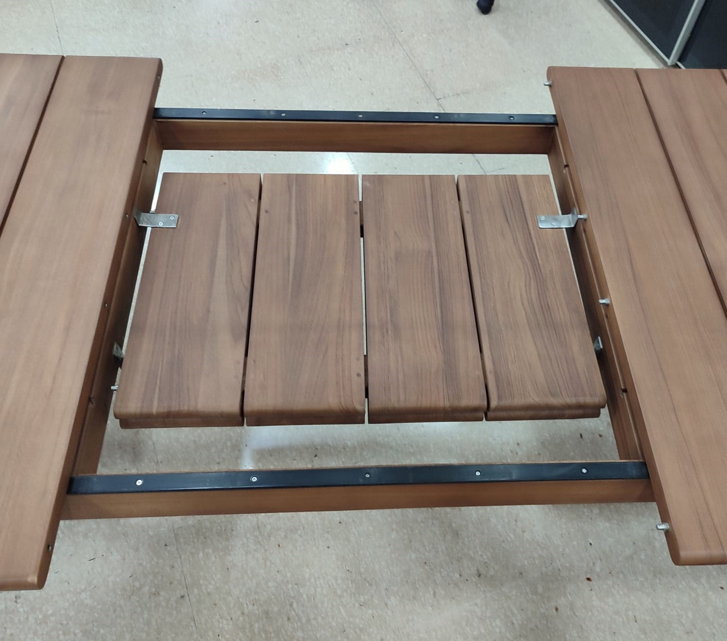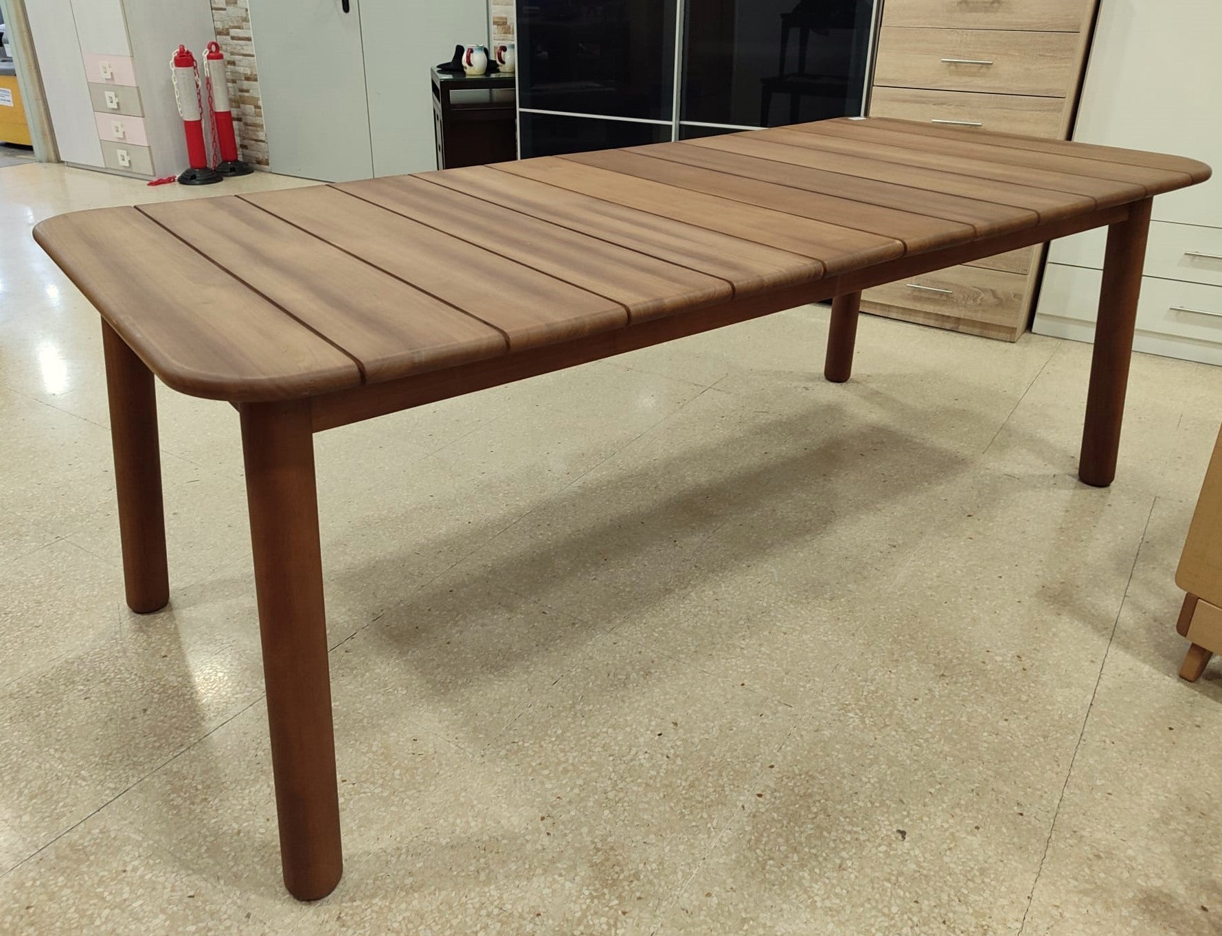 Descripción Mesa extensible fabricada en madera maciza de teca. Apta para uso en exteriores. (Para garantizar su perfecto estado, aplique productos de mantenimiento para madera al menos una vez al año.) Sistema de extensión de fácil uso, estirando de los extremos y colocando en su sitio, las dos placas anexas en forma de libro que hay en el interior.
