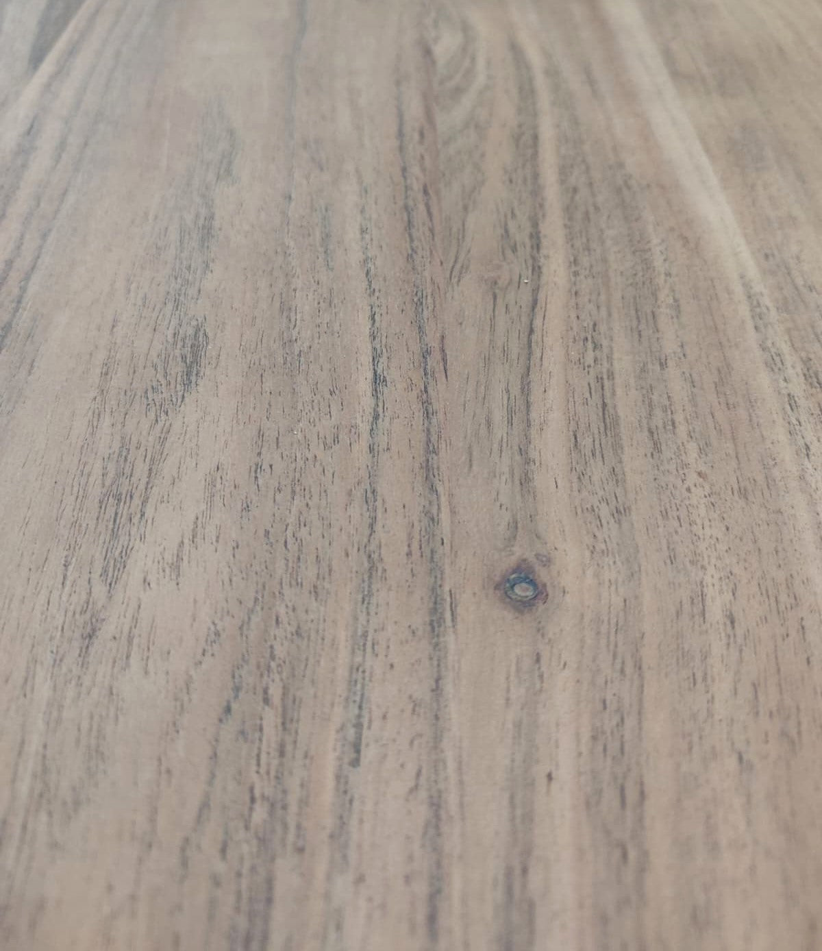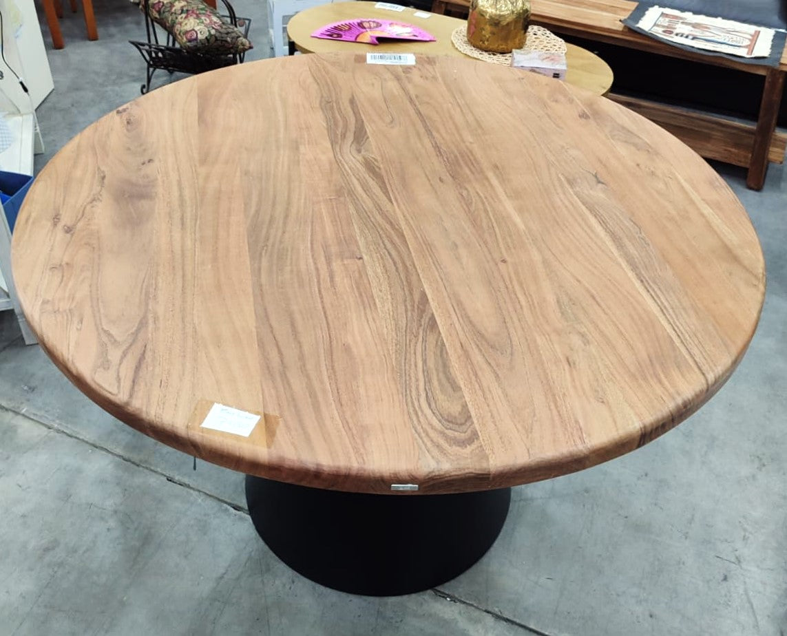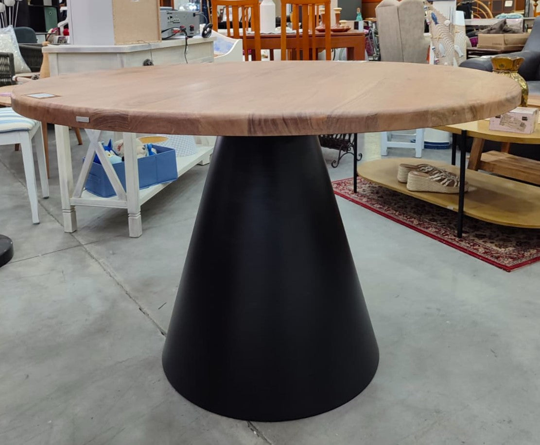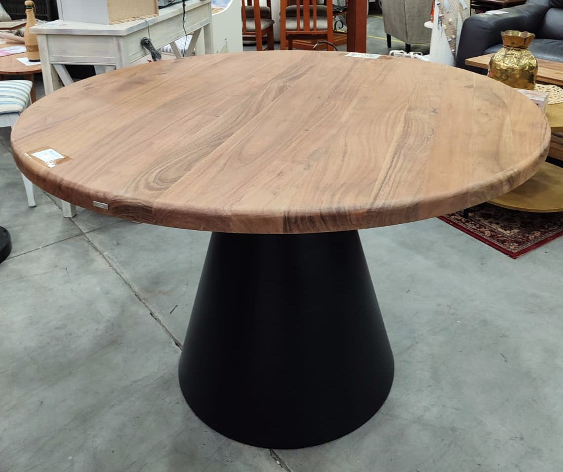 Descripción Mesa de madera maciza de acacia con acabado de vetas y nudos naturales. Capacidad para acoger hasta 5 comensales. Base cónica de metal.
