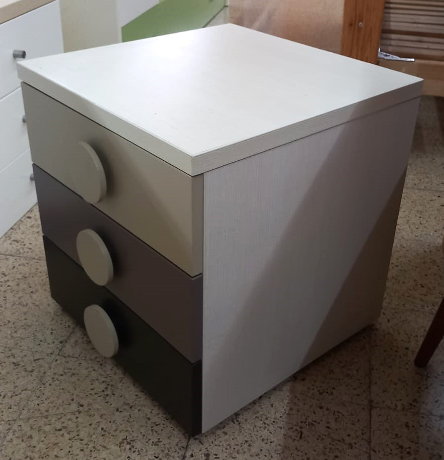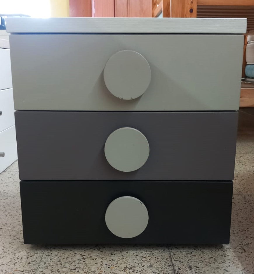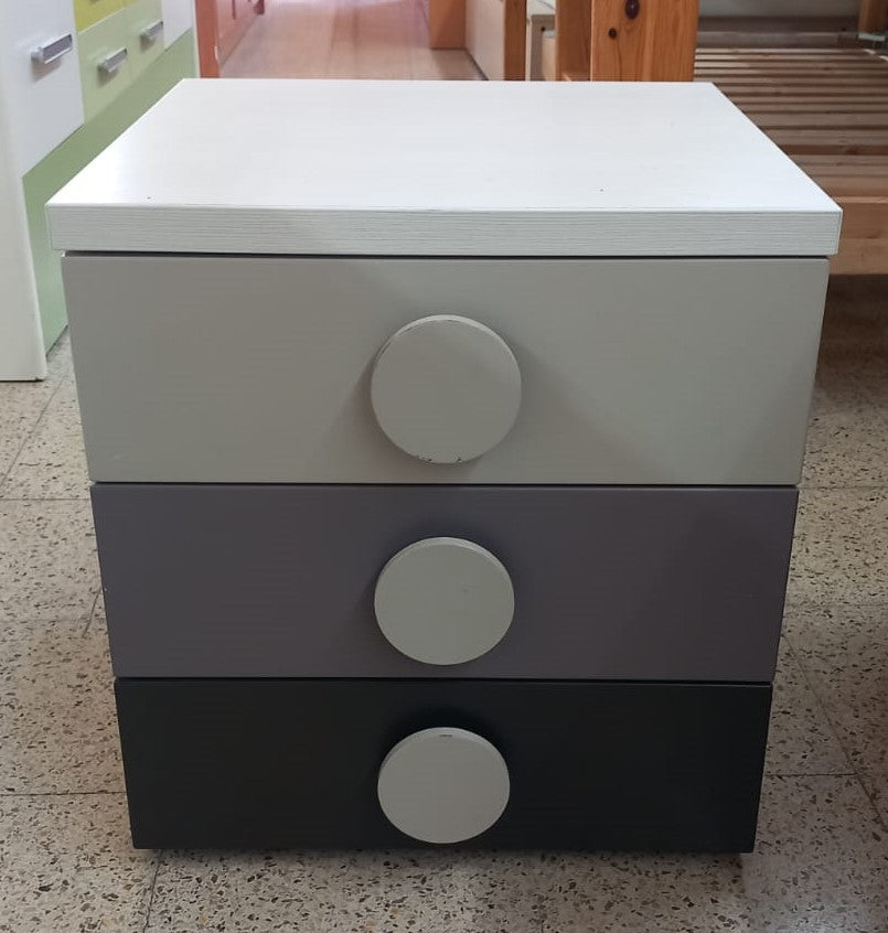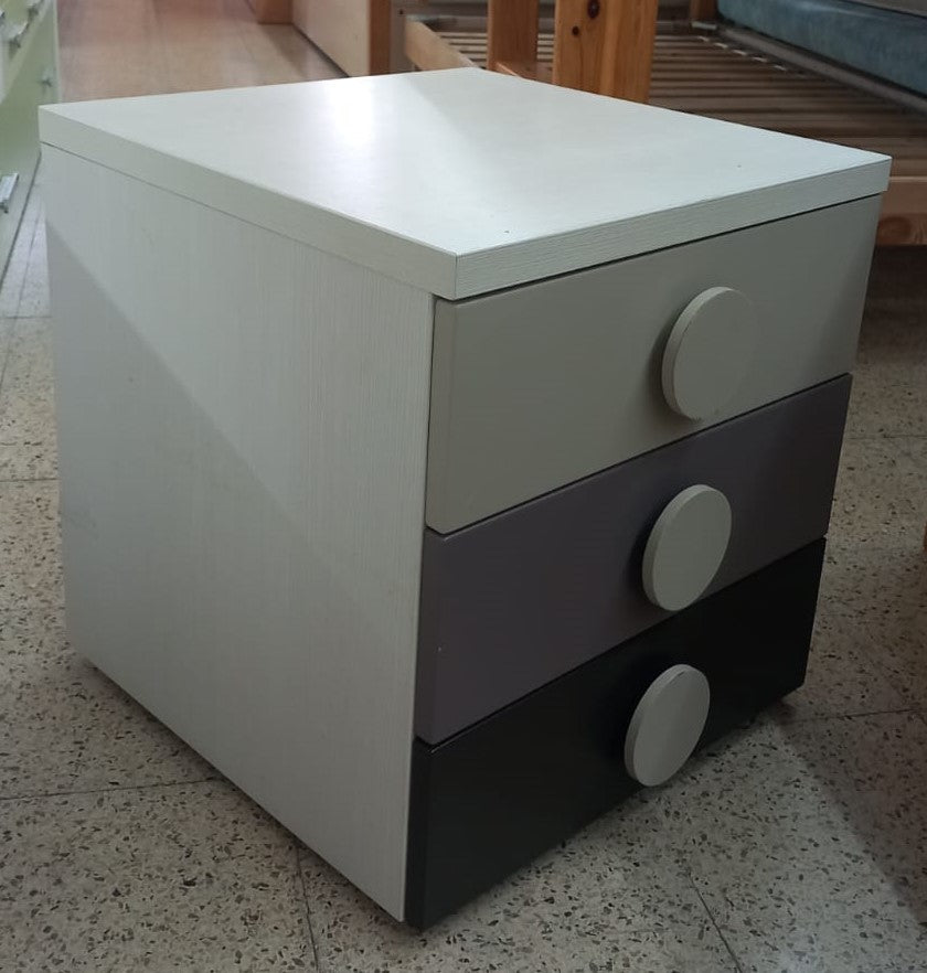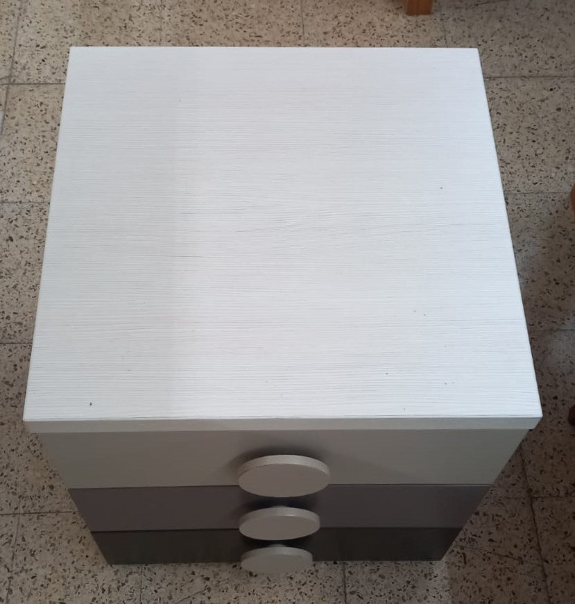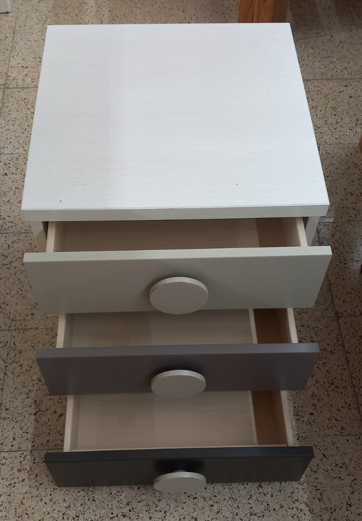 Descripción Mesita de estilo juvenil, hecha de madera aglomerada con acabados de melamina en tonos grises. 3 cajones.