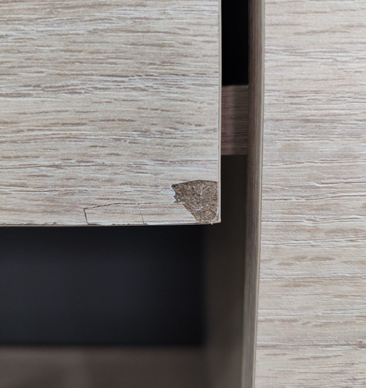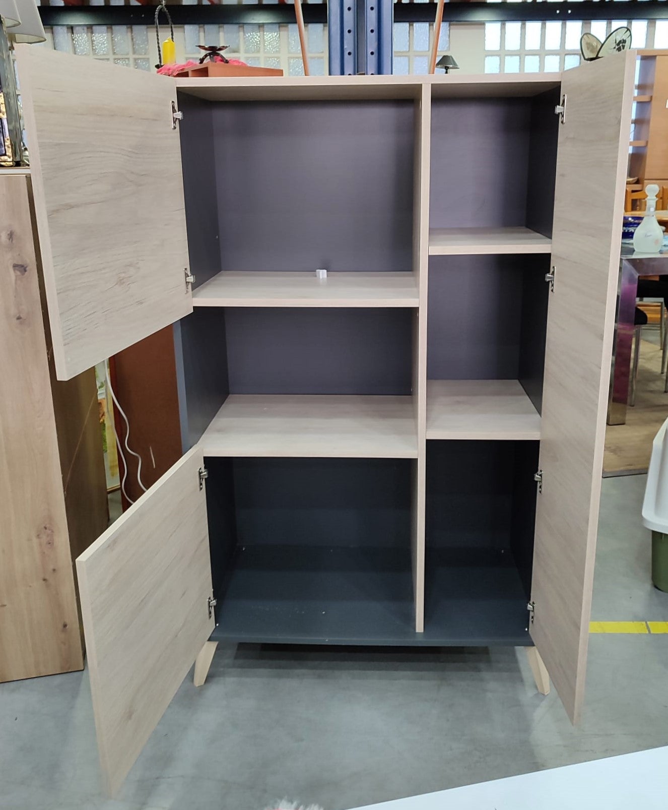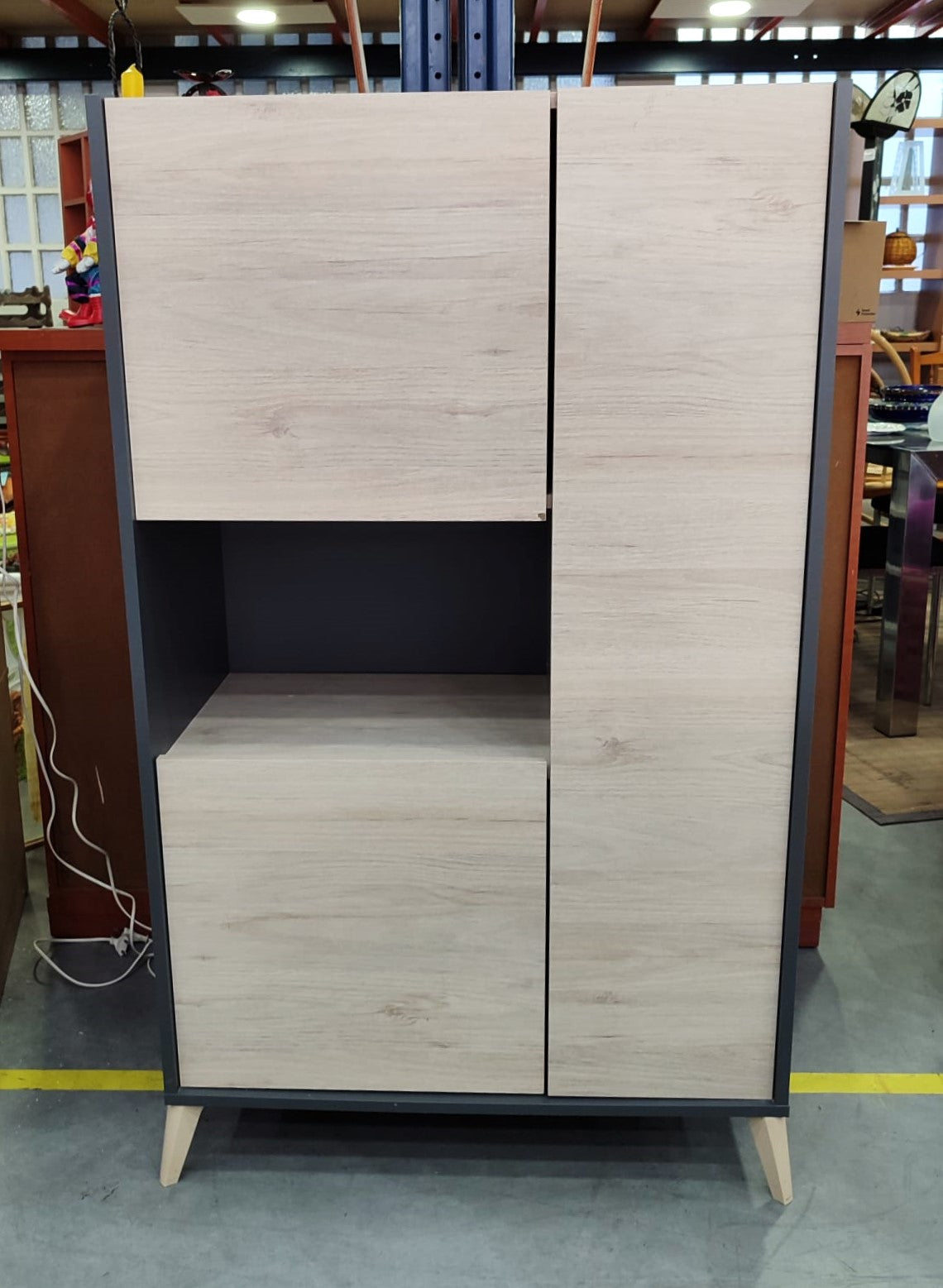 Descripción Modulo alto hecho de madera MDF con acabado de melamina. Tres puertas y hueco. Múltiples estantes internos. Defecto: La capa embellecedora de la esquina de una de las puertas está picada. ver foto.