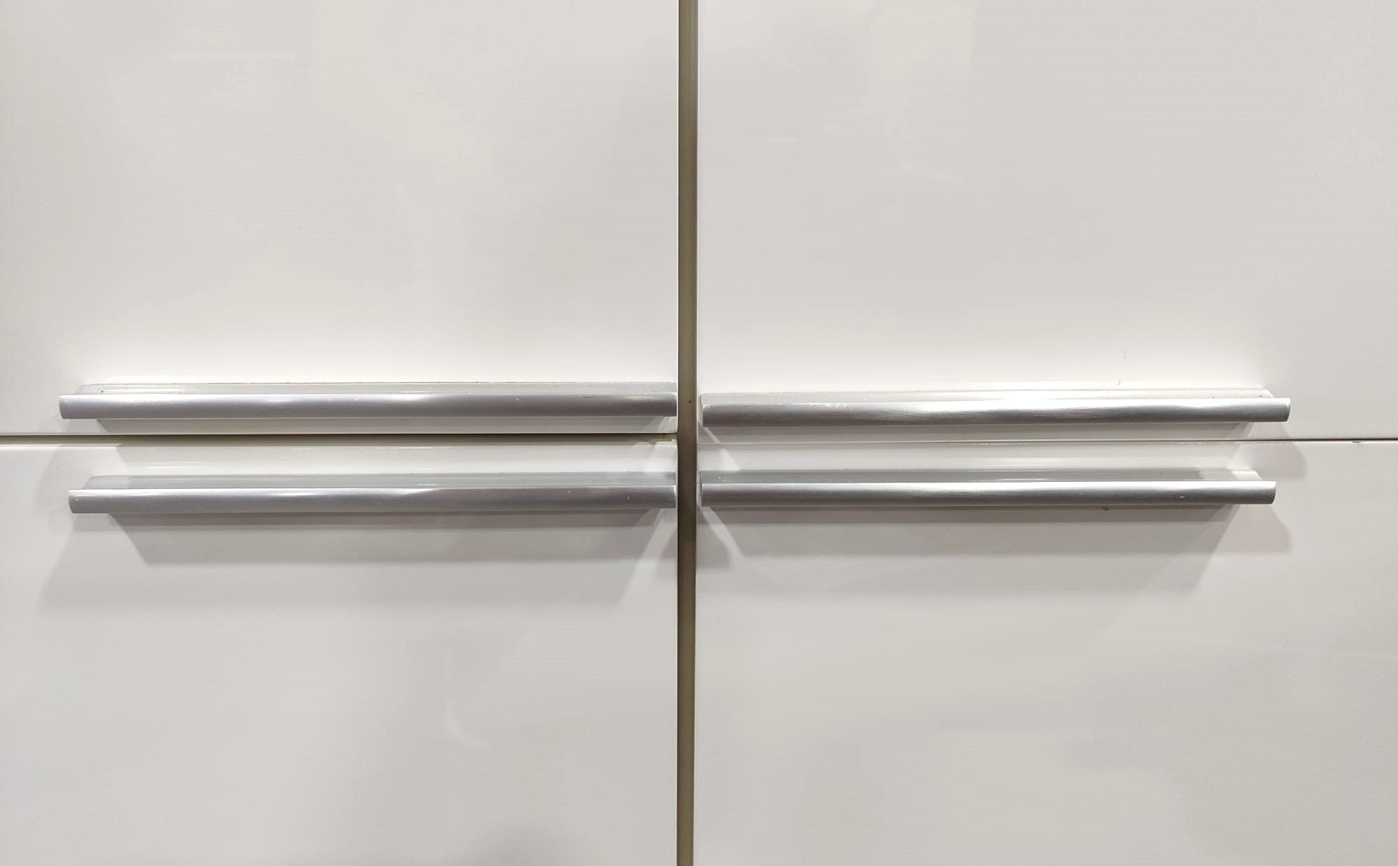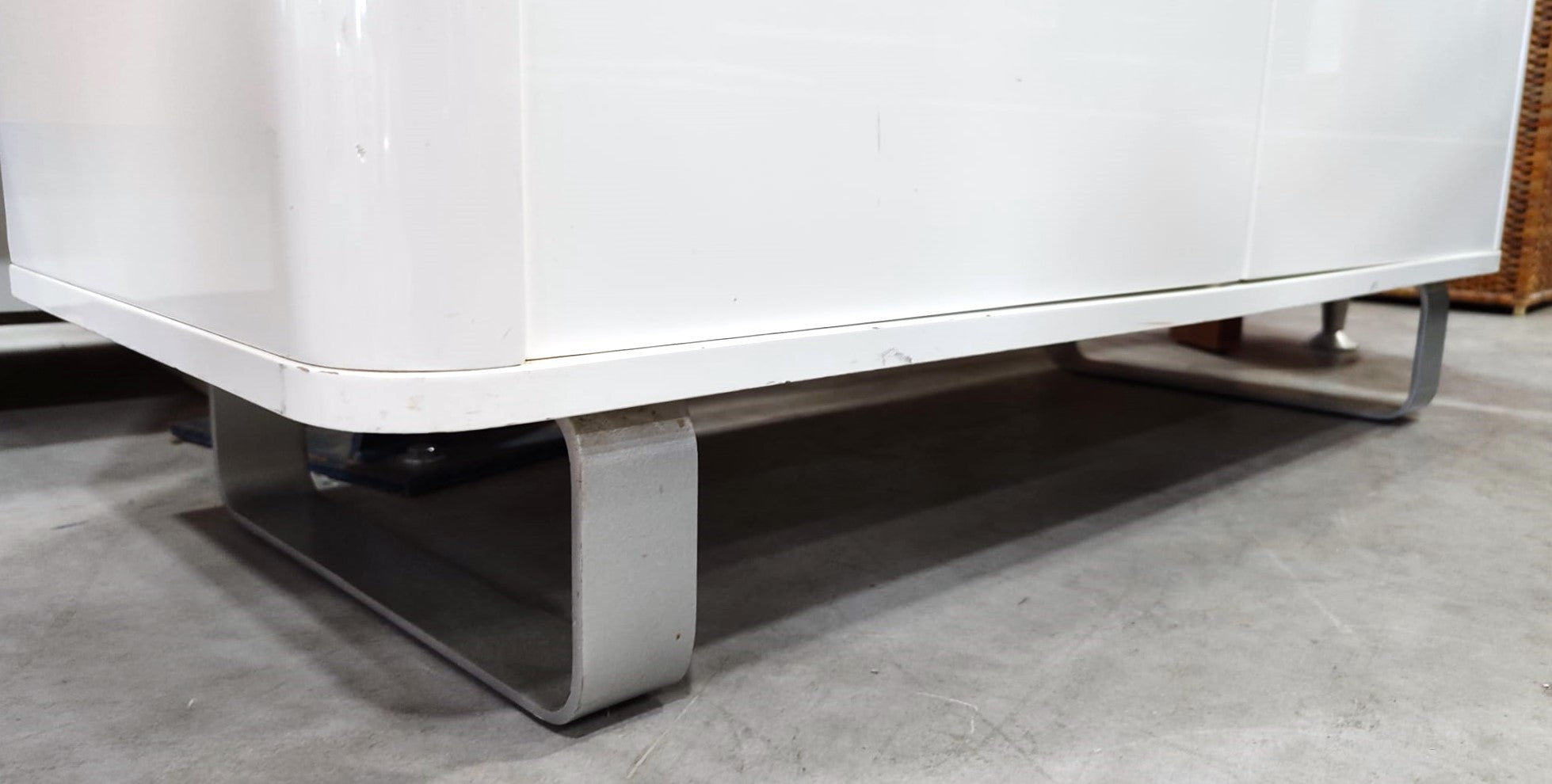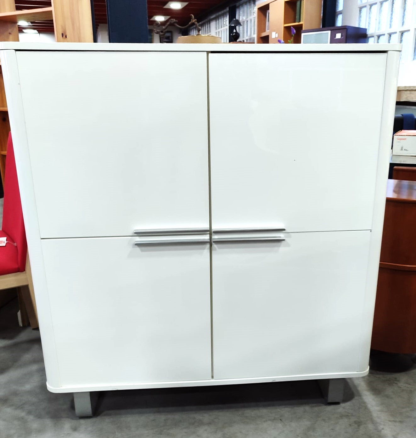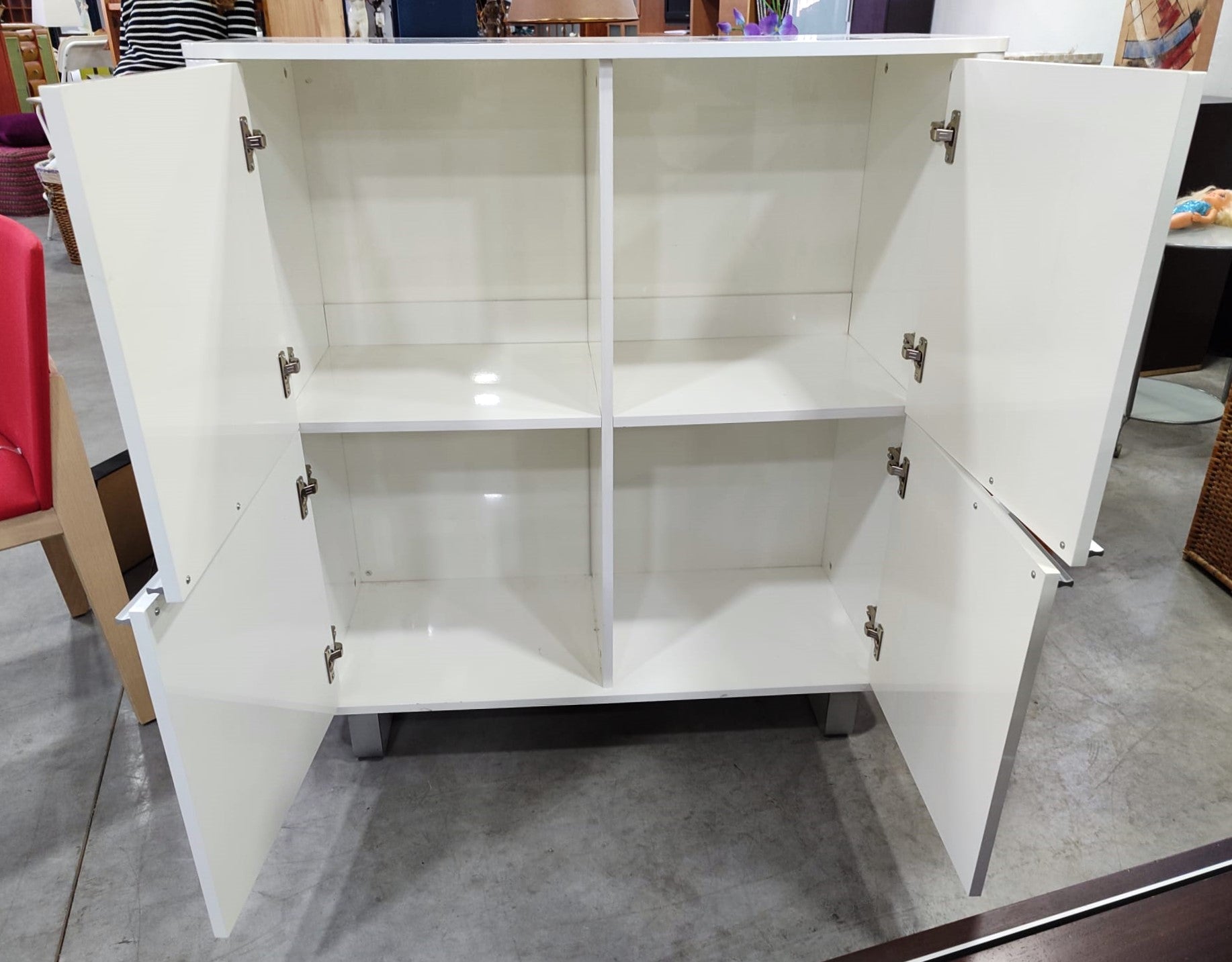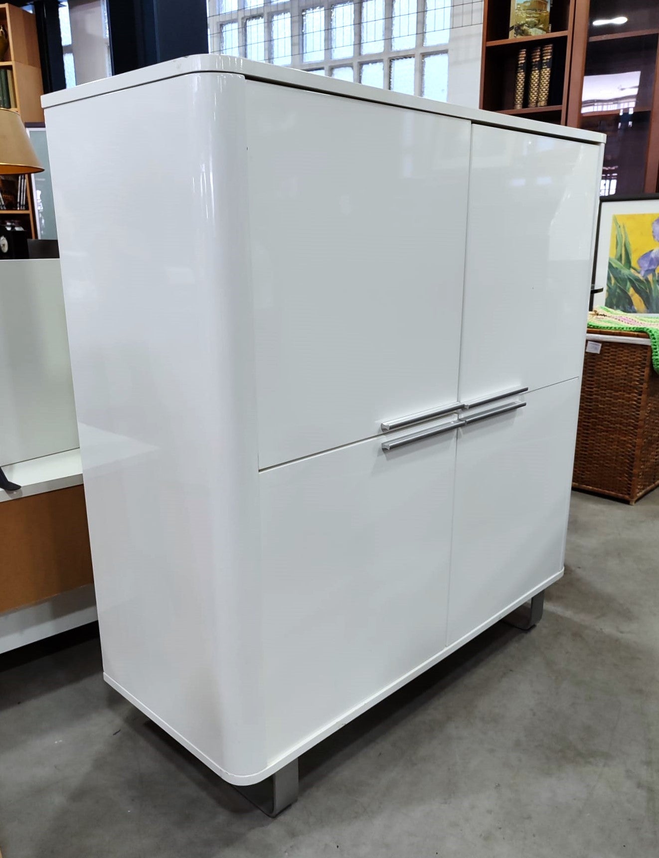 Descripción Elegante mueble de diseño moderno. Hecho de madera con esmaltado brillante. 4 compartimentos amplios con puerta abatible y tirador de aluminio. Base alta de patas metálicas.