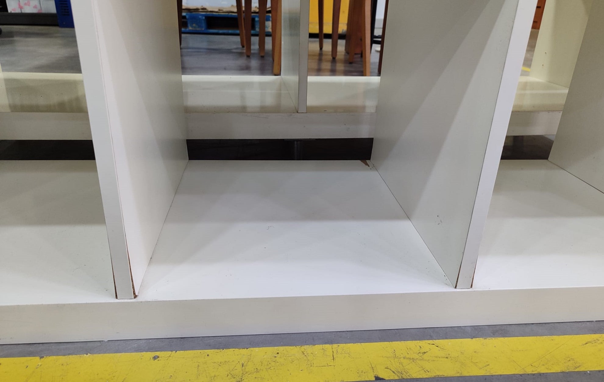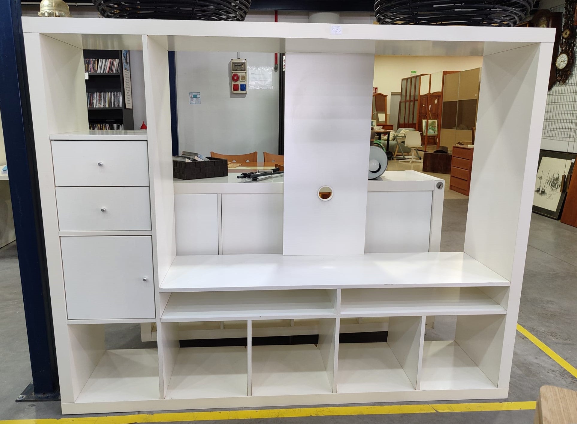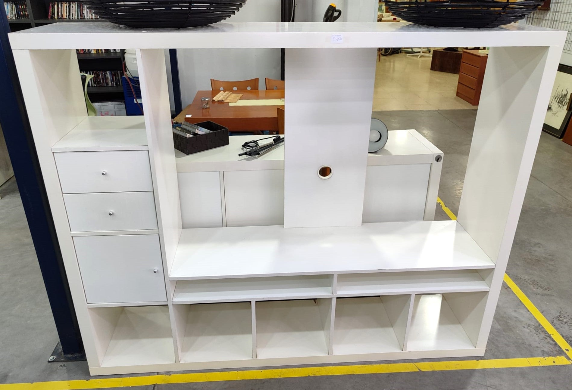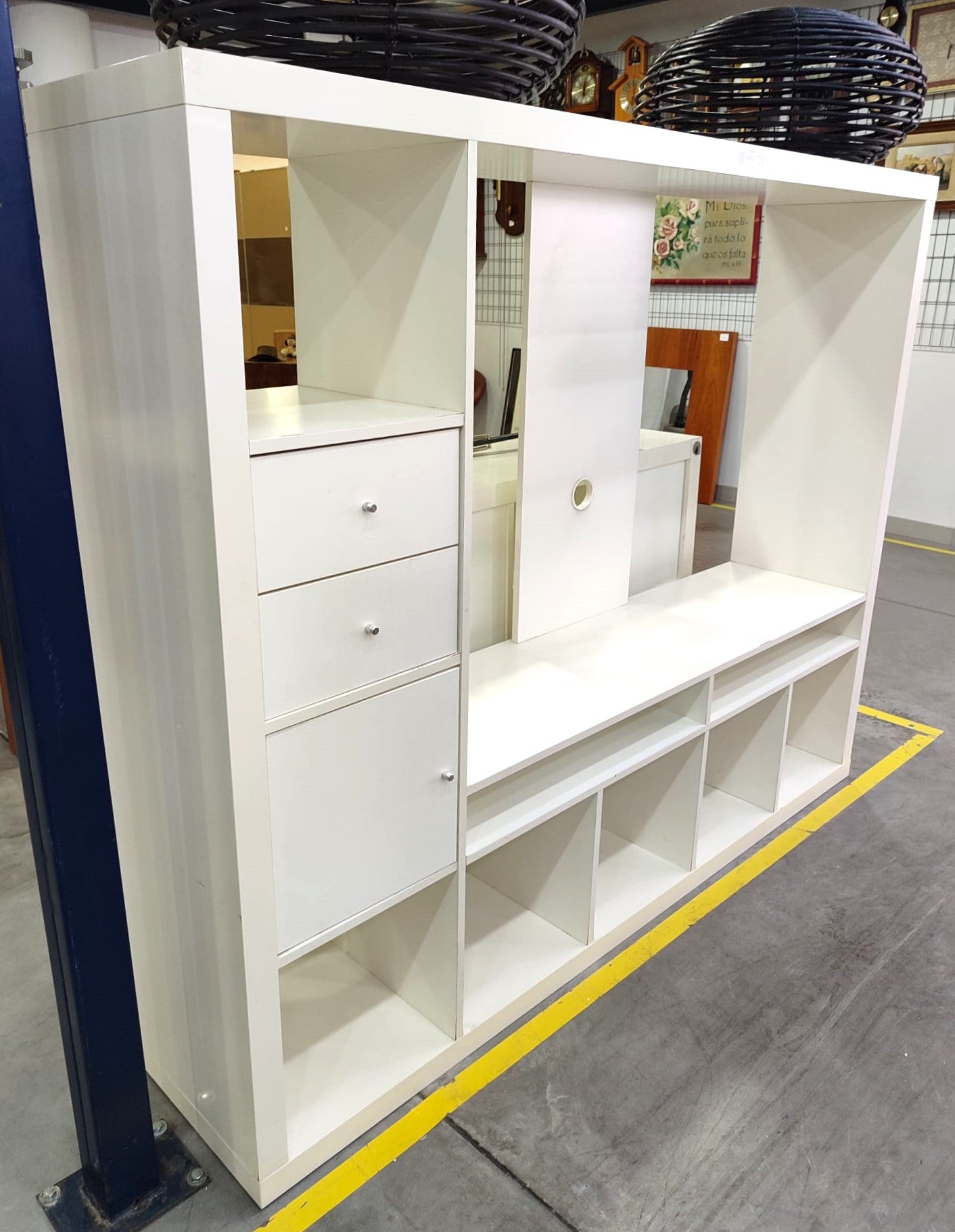 Descripción Mueble de madera aglomerada con acabado de melamina, estilo moderno. Dispone de 7 compartimentos de 33,5x33,5 cm, uno de ellos tiene puerta. 2 cajones auxiliares. Compartimento para TV de 140x92 cm. 2 compartimentos espaciales para consolas. Defecto: Presenta varias taras que pueden verse fácilmente en las fotos.