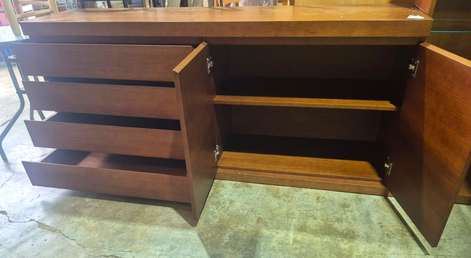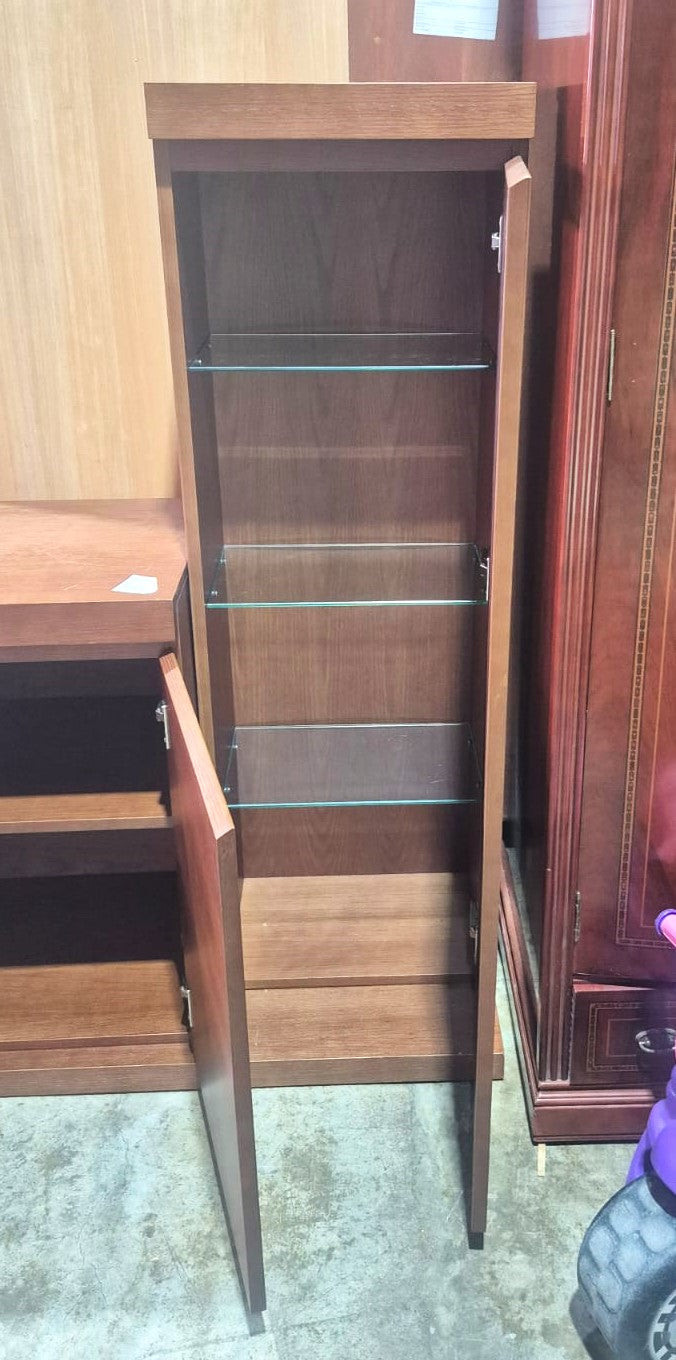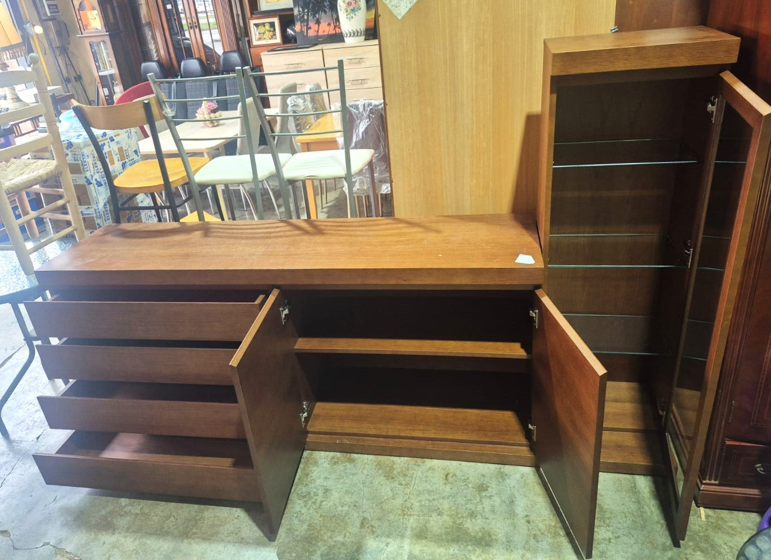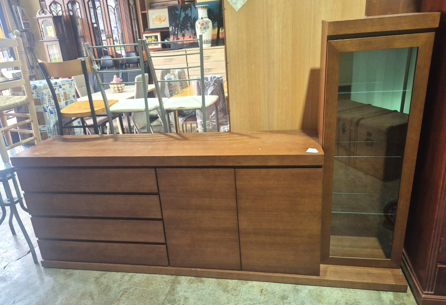 Descripción Mueble de salón de estilo moderno y elegante. Aparador de encimera ancha con un armario lateral de puertas abatibles y 4 cajones amplios. Vitrina lateral de puerta acristalada y tres estantes de cristal en su interior.