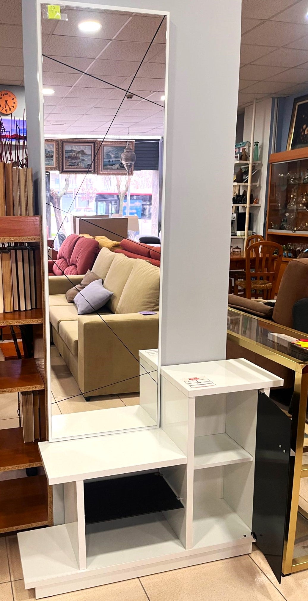 Forma del producto MUEBLE RECIBIDOR 98x26x70 cm €100,00IVA incluido SKU: RT-1366 Recogida gratuita en nuestra(s) tienda(s) Contáctanos por WhatsApp Estado: En buen estadoMedidas: Medidas del MUEBLE: Largo: 98 cm Profundidad: 26 cm Alto: 70 cm Medidas del ESPEJO: Ancho: 45 cm Alto: 153 cmColor: Blanco y AntracitaDefecto: No tiene