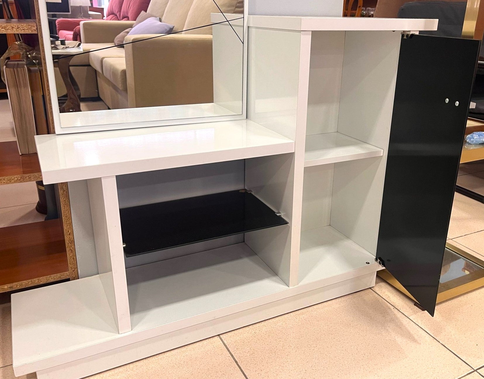 Descripción Estantería con espejo perfecta para el recibidor de casa. Mueble de madera aglomerada con acabado de melamina, puerta y balda de cristal tintado en negro. Espejo de pared rectangular con marco de madera, a juego.