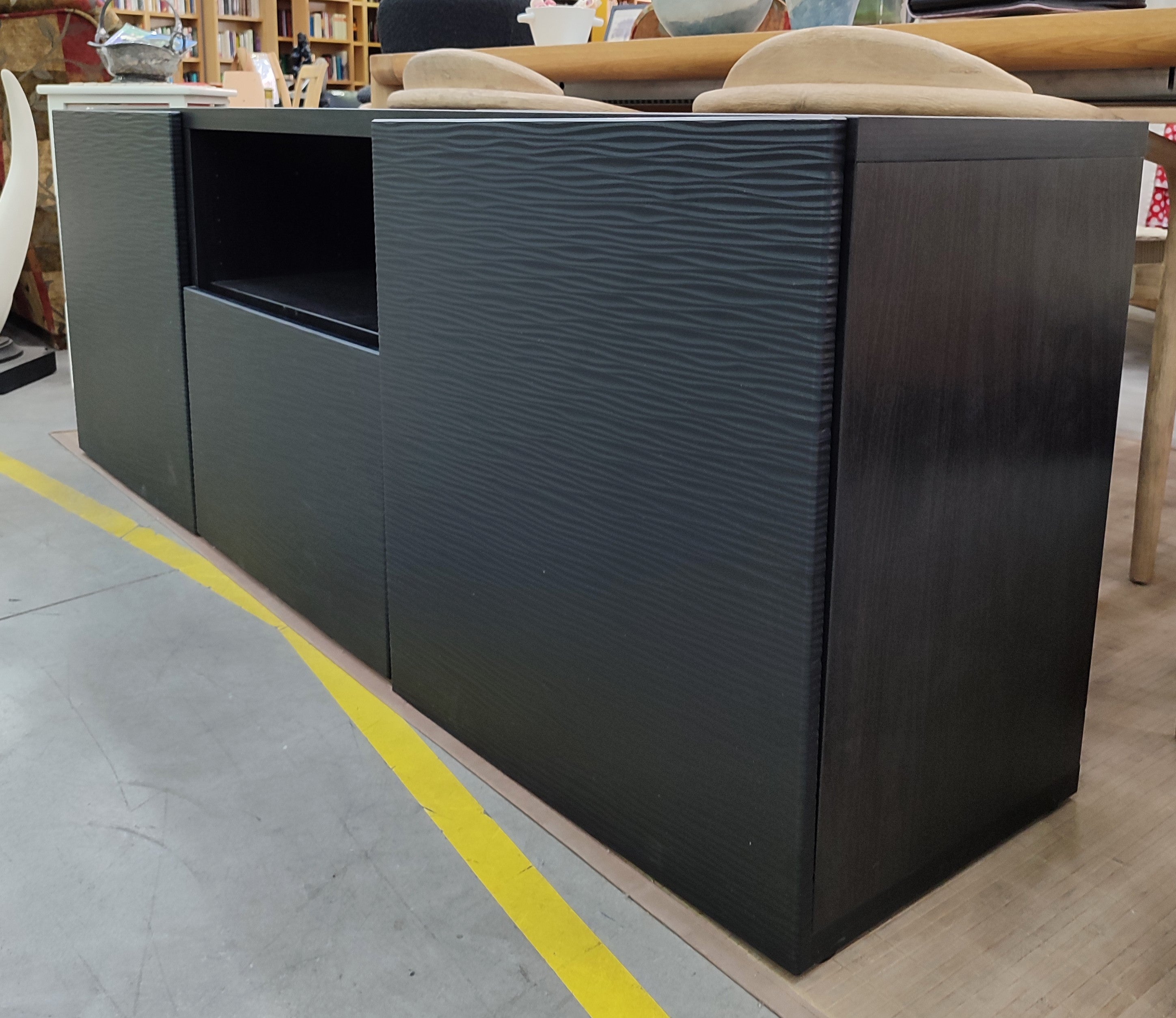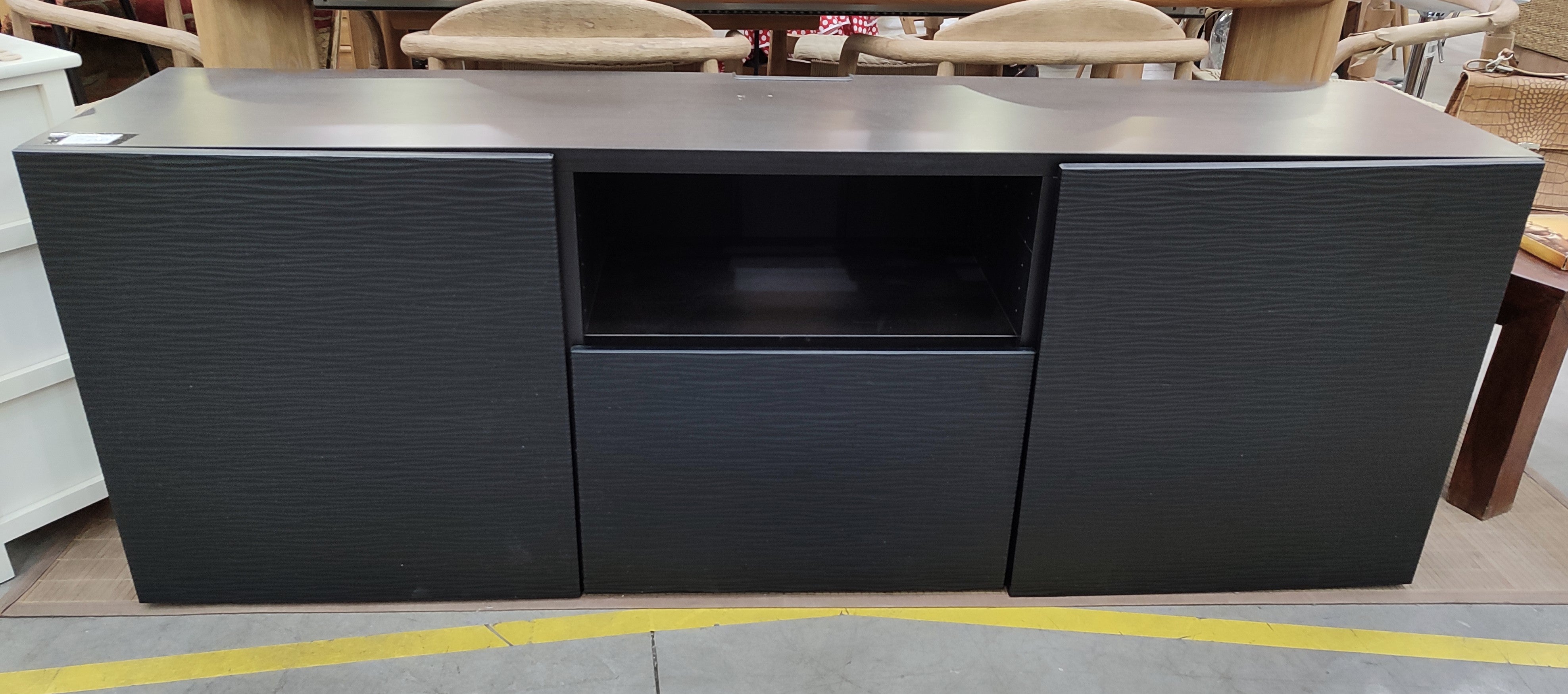 Descripción Mueble de televisión de diseño elegante y moderno. Tres puertas con textura ondulada y abertura abatible tipo "push to open". Encimera amplia para cualquier tipo de TV. 6 compartimentos internos para diferentes usos. Los compartimentos centrales disponen de agujeros pasacables. 3 baldas de altura regulable. Defecto: tiene un rayón grande en el compartimento visible y pequeños rasguños en la encimera. ver fotos.