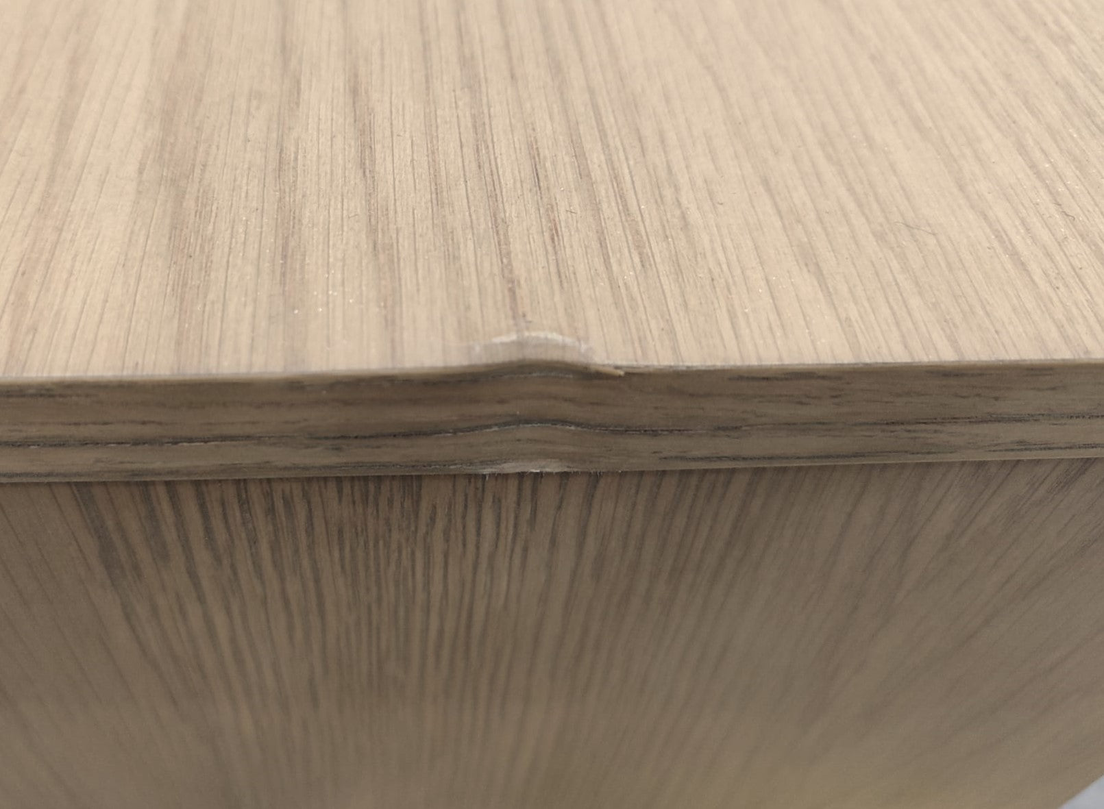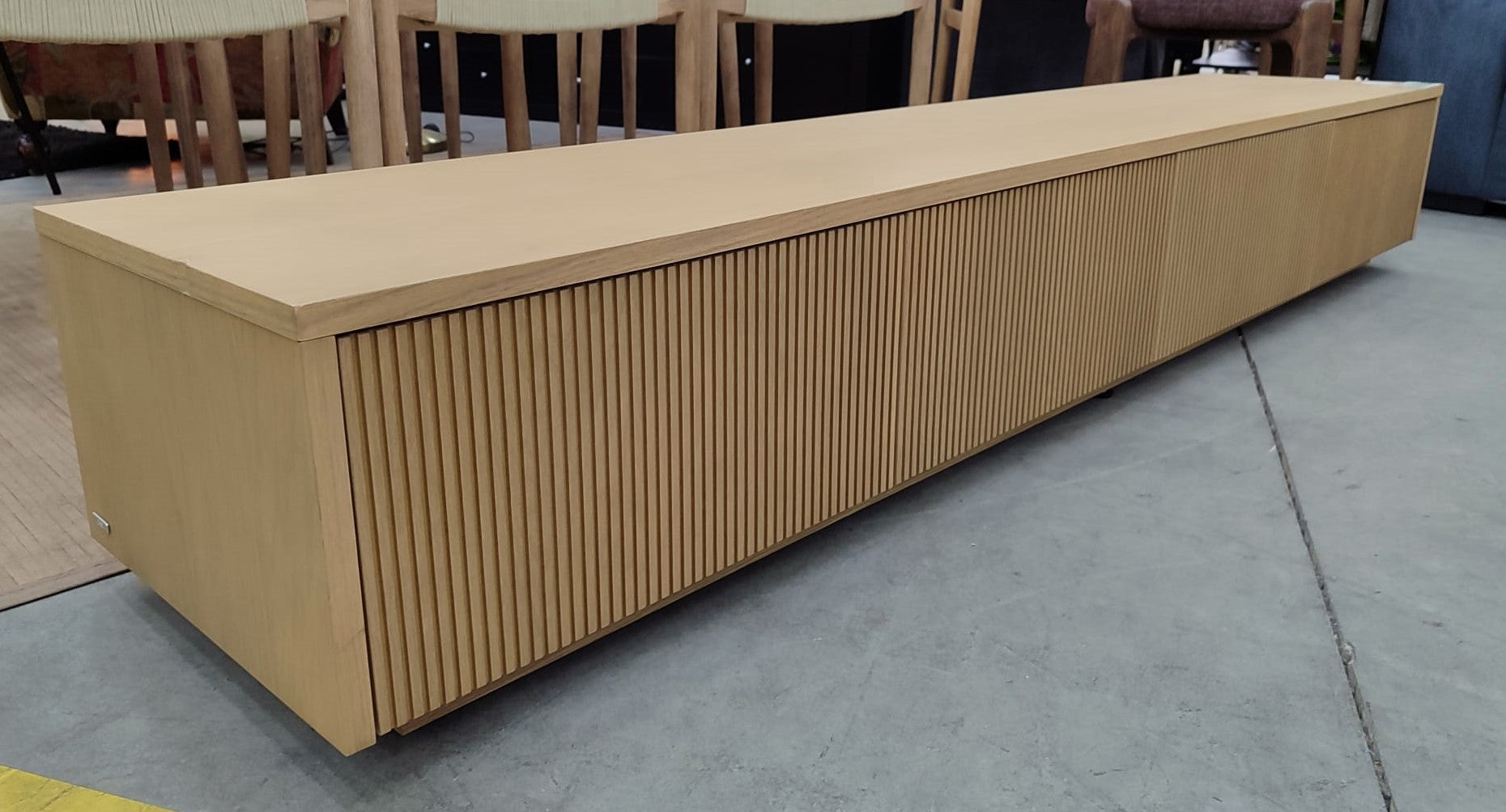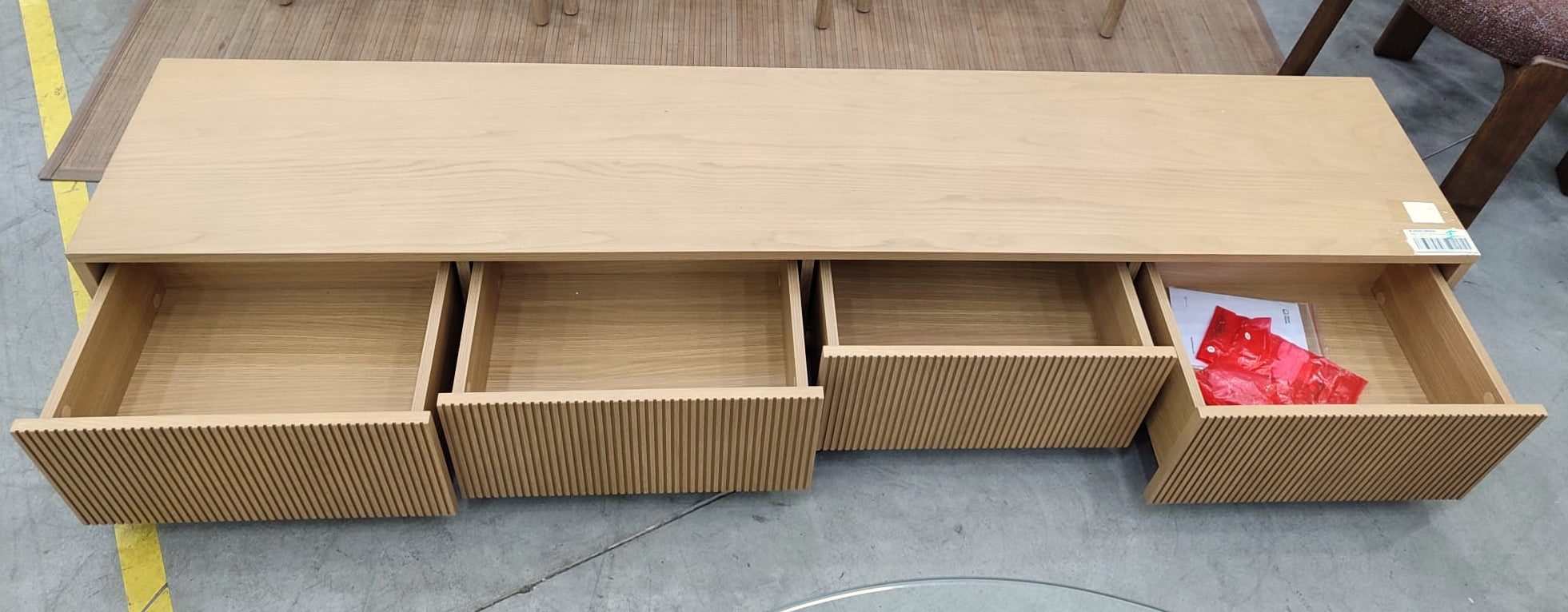 Descripción Mueble de TV hecho de chapa de roble. 4 cajones con apertura moderna a presión. Reguladores de altura en la base para salvar los desniveles. Defecto: Un lateral tiene un pequeño golpe. ver foto.