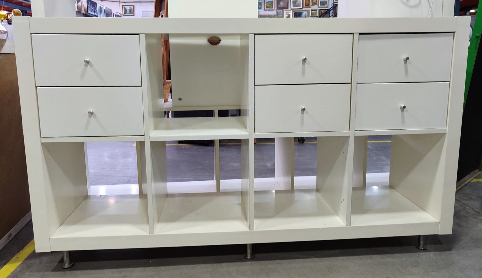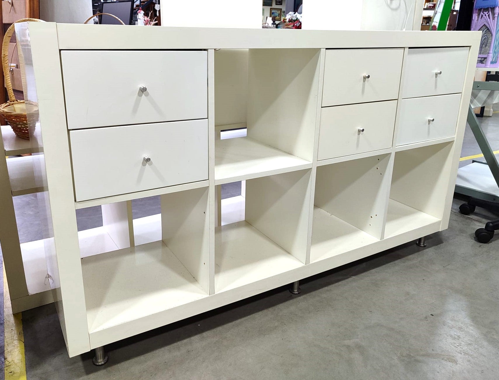 Descripción Estantería modelo "KALLAX" de Ikea con accesorios varios. Cinco compartimentos. 6 cajones pequeños multiusos. Patas altas de metal cromado. Defecto: La estructura tiene algunos agujeros de tornillos y rasguños por la encimera.