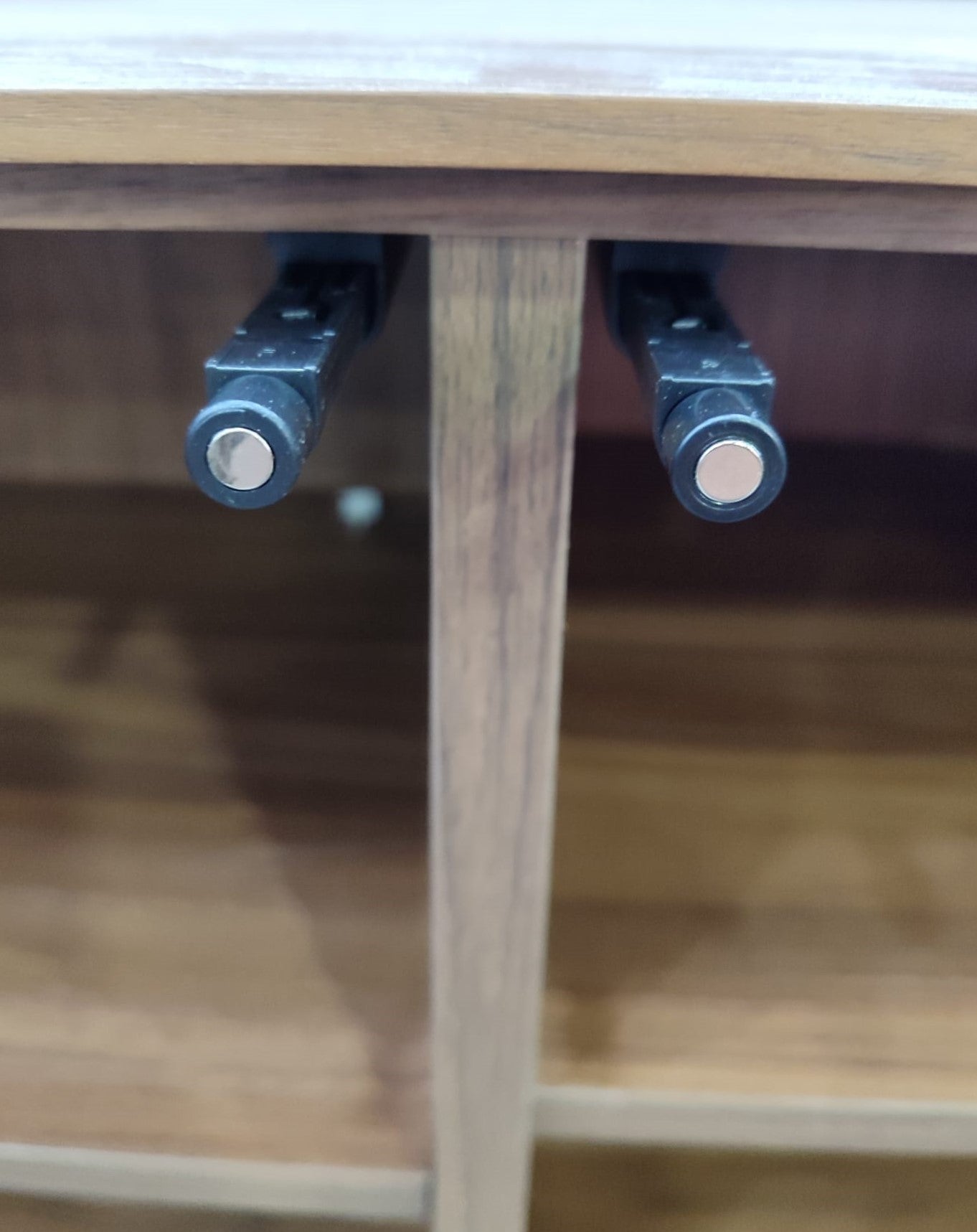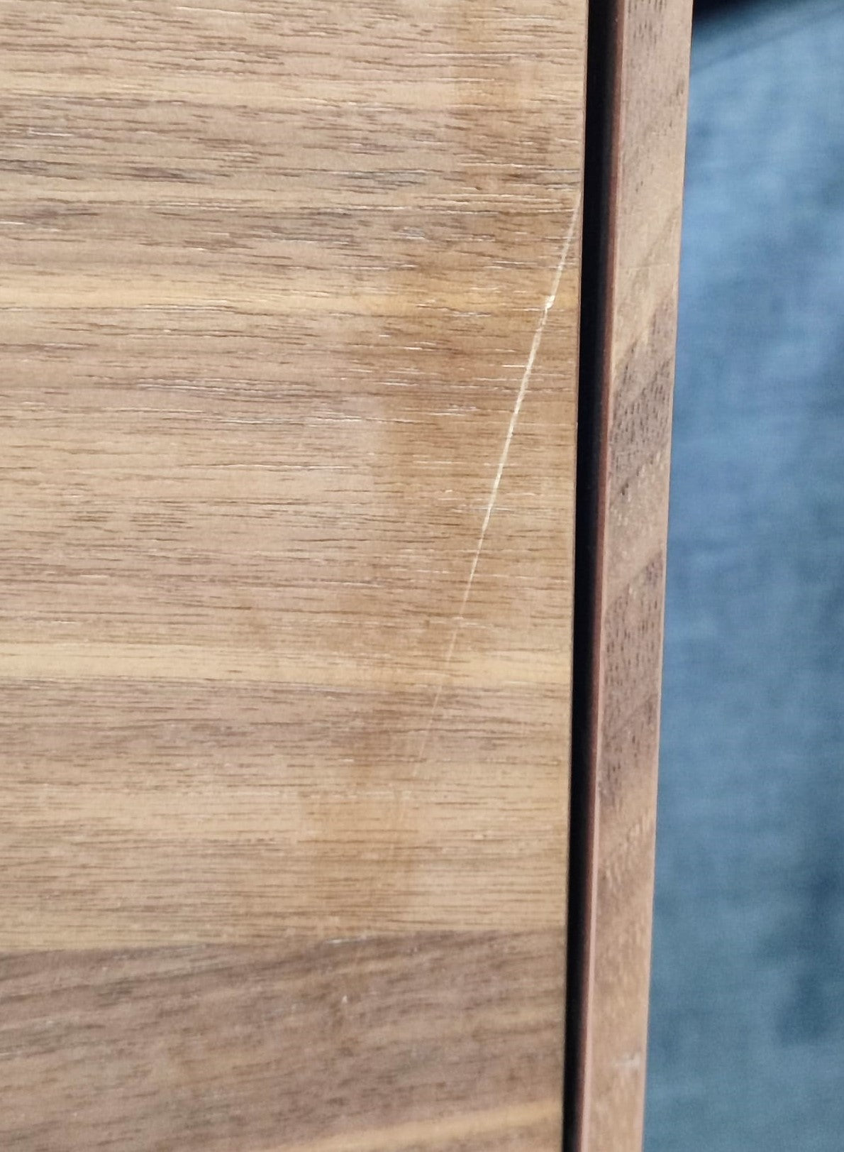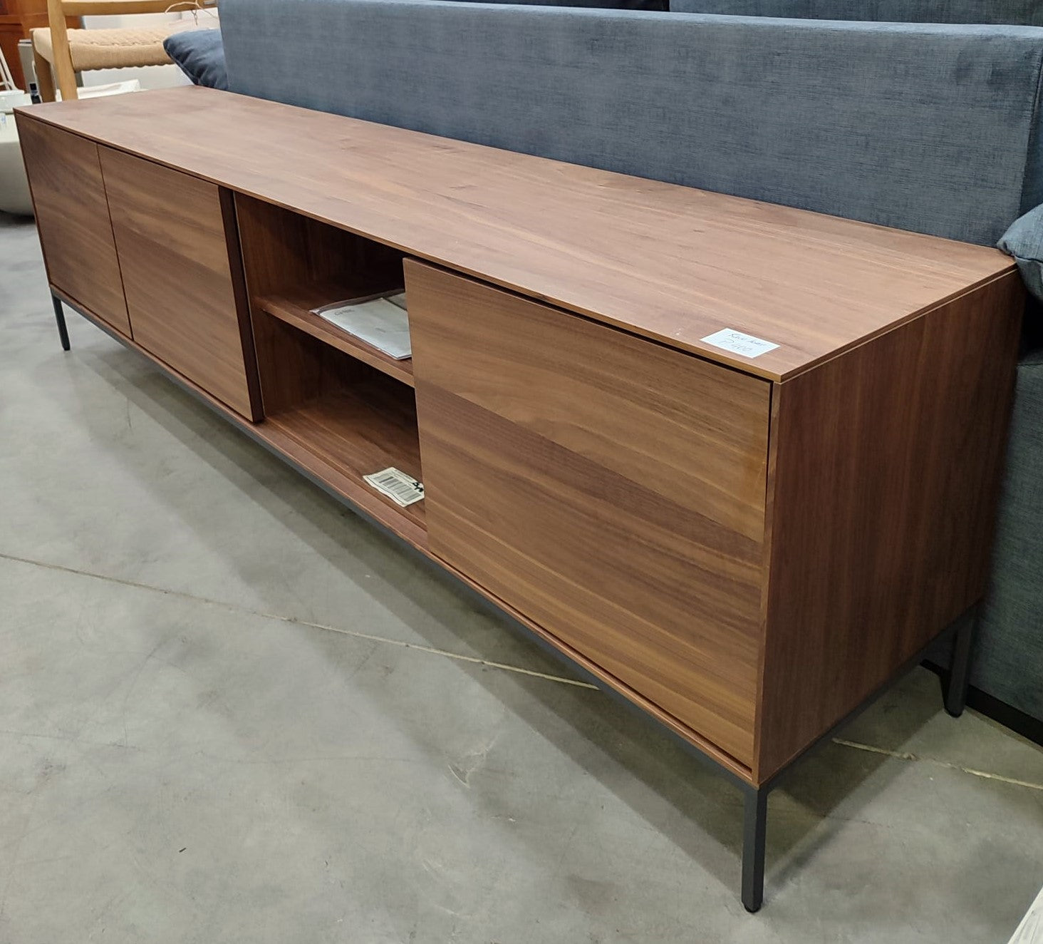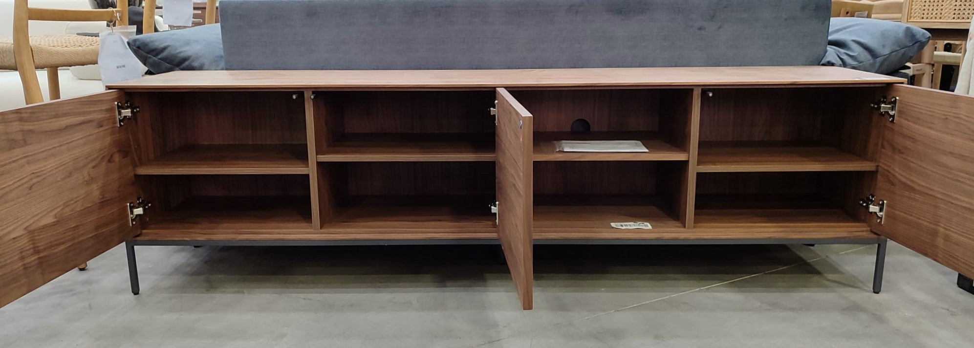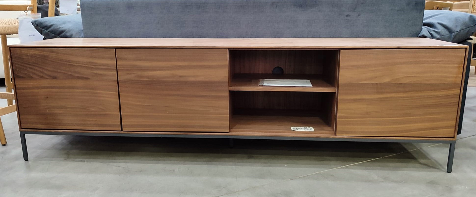 Descripción Mueble TV hecho de chapa de nogal, elegante y moderno con diseño atemporal. 3 puertas con apertura "push open" y bisagras de cierre suave. Patas de acero regulables con acabado pintado en color antracita mate. Interior con 8 compartimentos de gran capacidad, iguales, uno de ellos cuenta con un agujero para pasar cables. Defecto Una puerta tiene una raya. ver fotos.