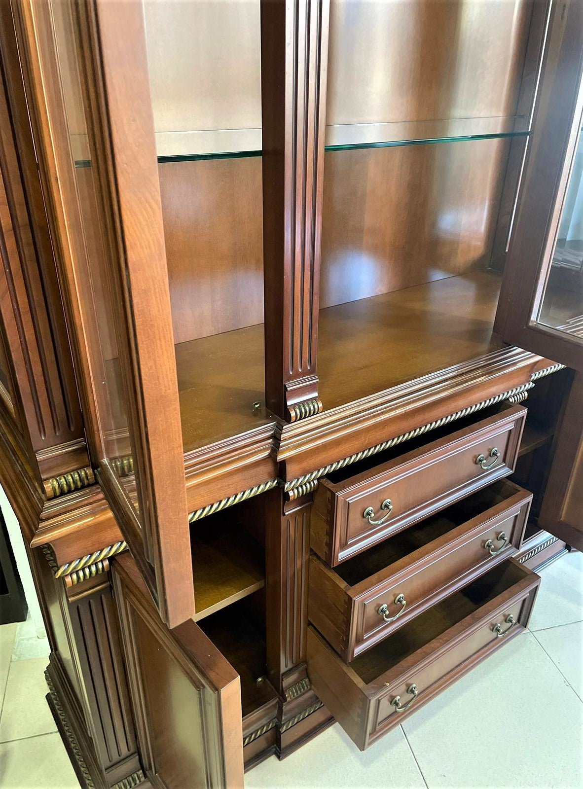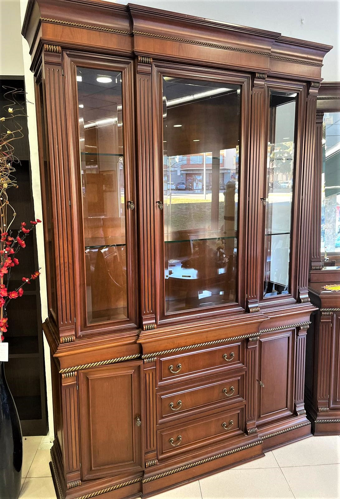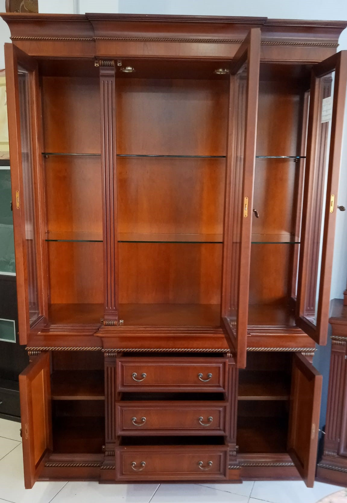 Descripción Bonita vitrina de estilo clásico, elegante y con todo el espacio que necesitas para exhibir y resguardar tus objetos más preciados. Vitrina de tres caras acristaladas de puertas abatibles en la parte frontal, cada una cuenta con su llave. 2 baldas de cristal y encimera ancha, el interior dispone de focos para que el cliente pueda ponerle luz. Sección inferior con 2 pequeños armarios laterales y 3 cajones anchos.