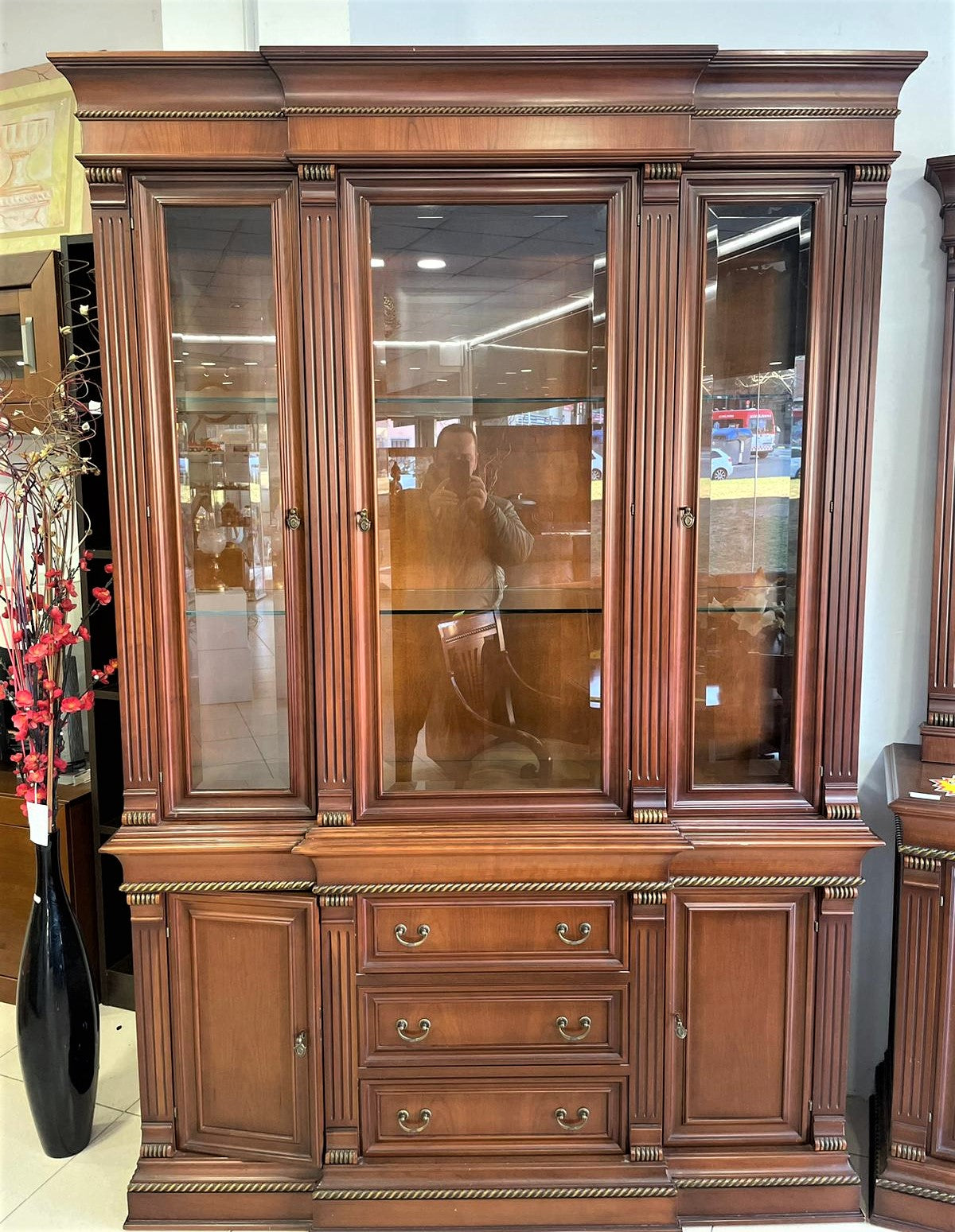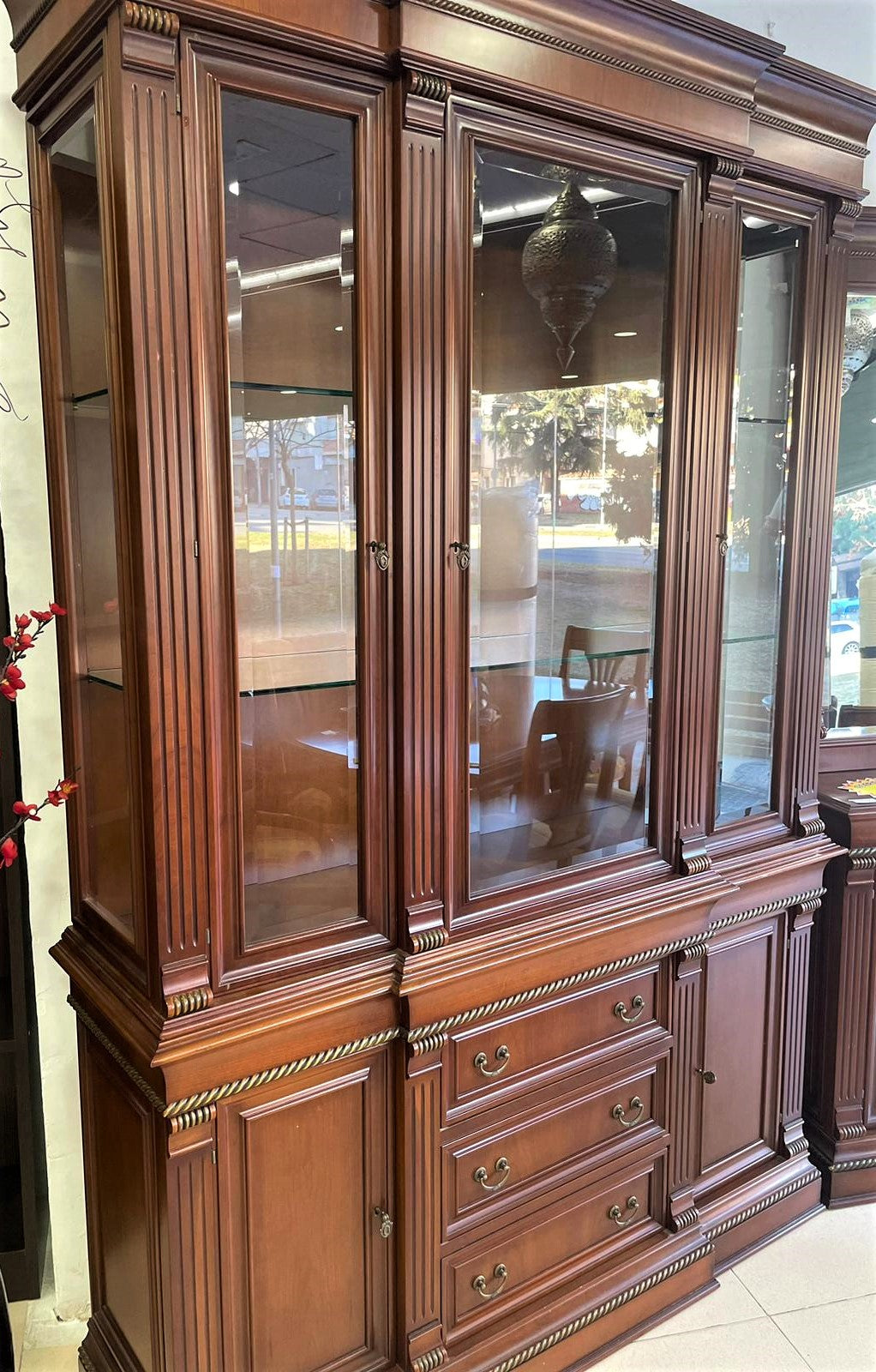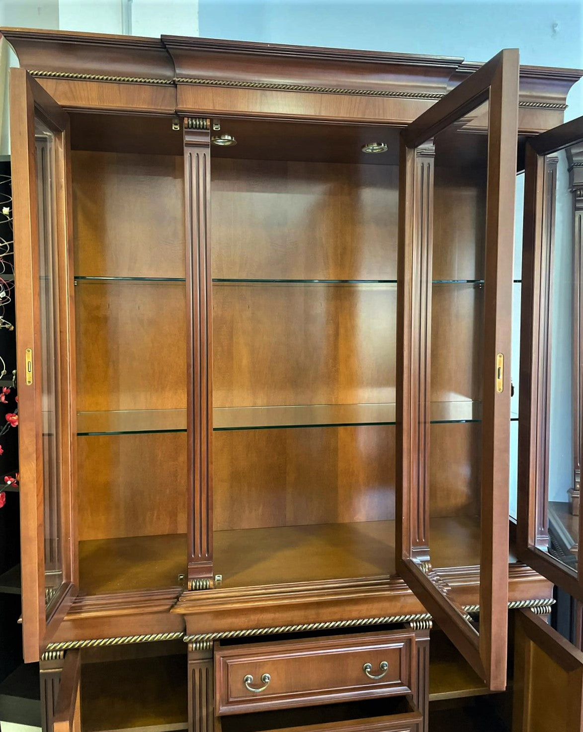 Descripción Bonita vitrina de estilo clásico, elegante y con todo el espacio que necesitas para exhibir y resguardar tus objetos más preciados. Vitrina de tres caras acristaladas de puertas abatibles en la parte frontal, cada una cuenta con su llave. 2 baldas de cristal y encimera ancha, el interior dispone de focos para que el cliente pueda ponerle luz. Sección inferior con 2 pequeños armarios laterales y 3 cajones anchos.