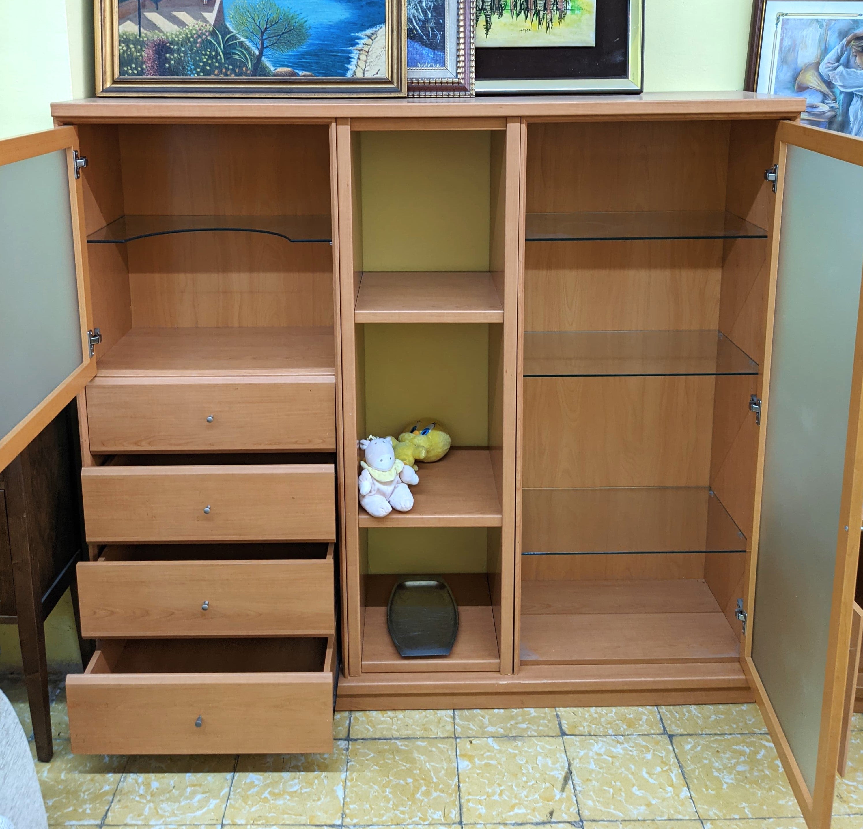 - Mueble de bar con vitrina de puerta acristalada abatible y tres estantes de cristal, 3 estantes centrales 5 4 cajones auxiliares.