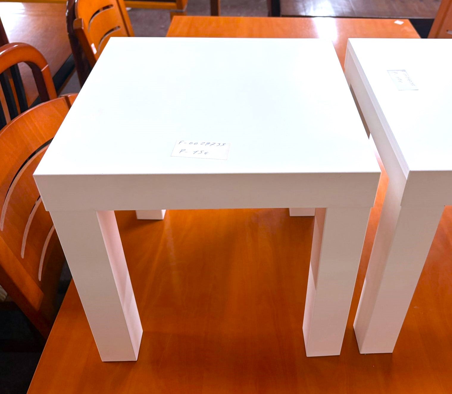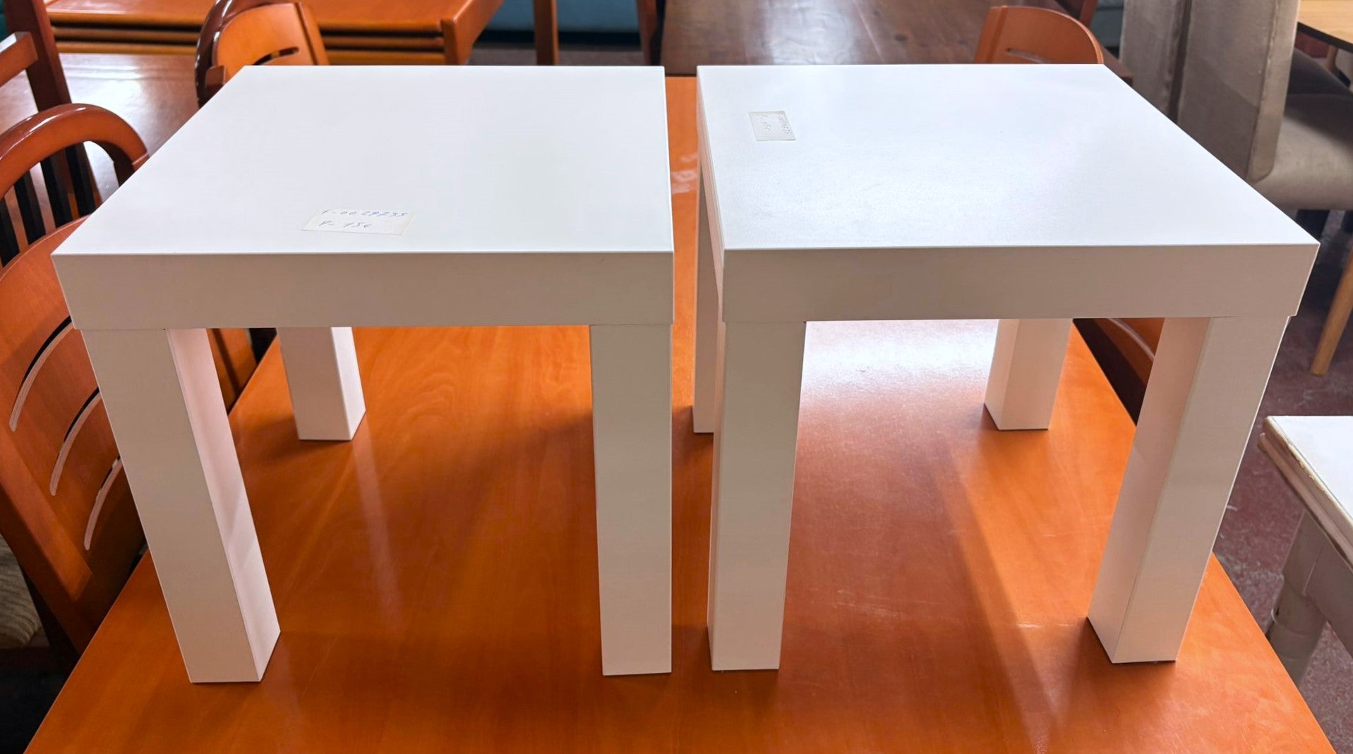 Descripción Mesitas auxiliares ligeras. Hechas de tablero de partículas. Encimera cuadrada. se pueden comprar por separado, cada una, 15€