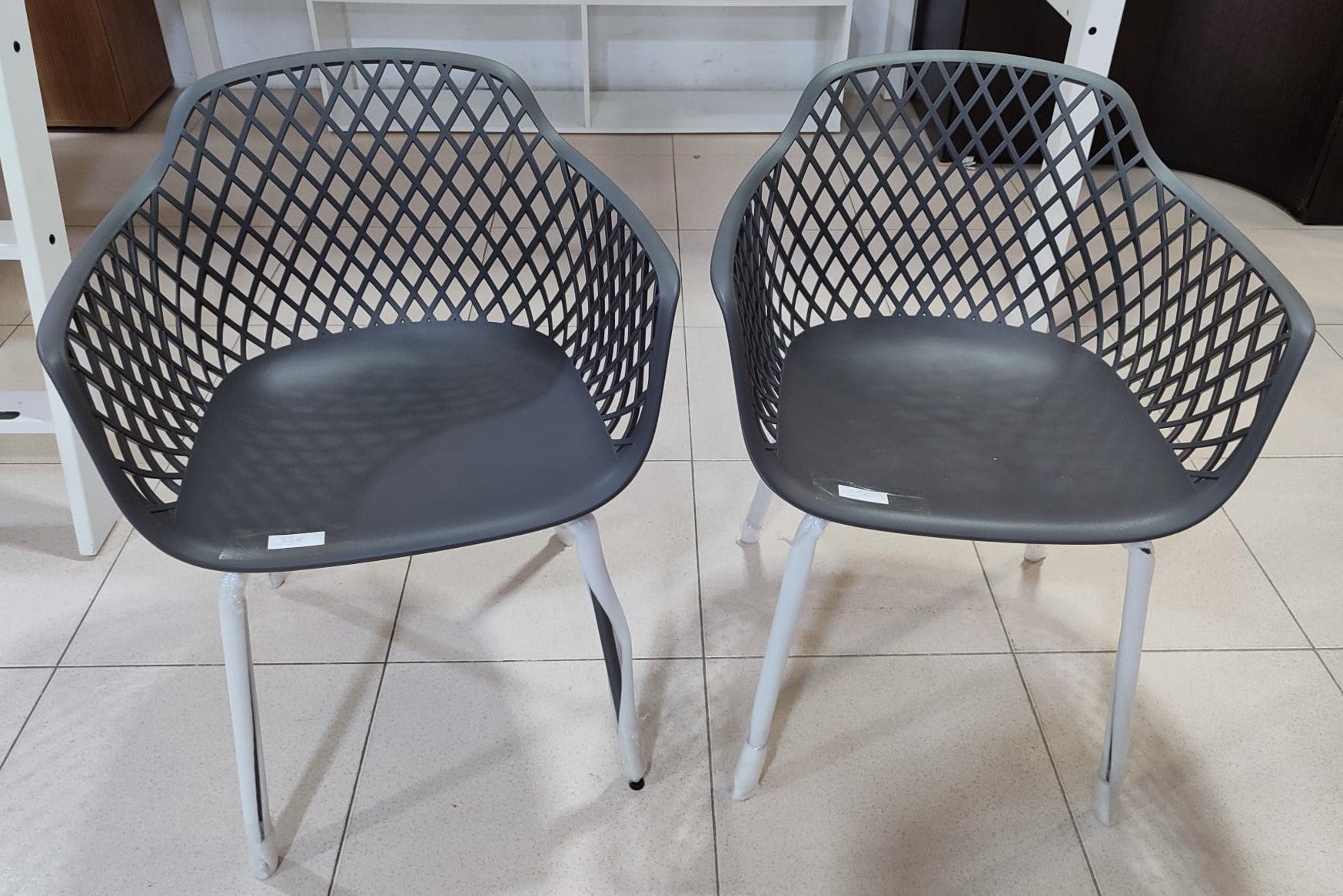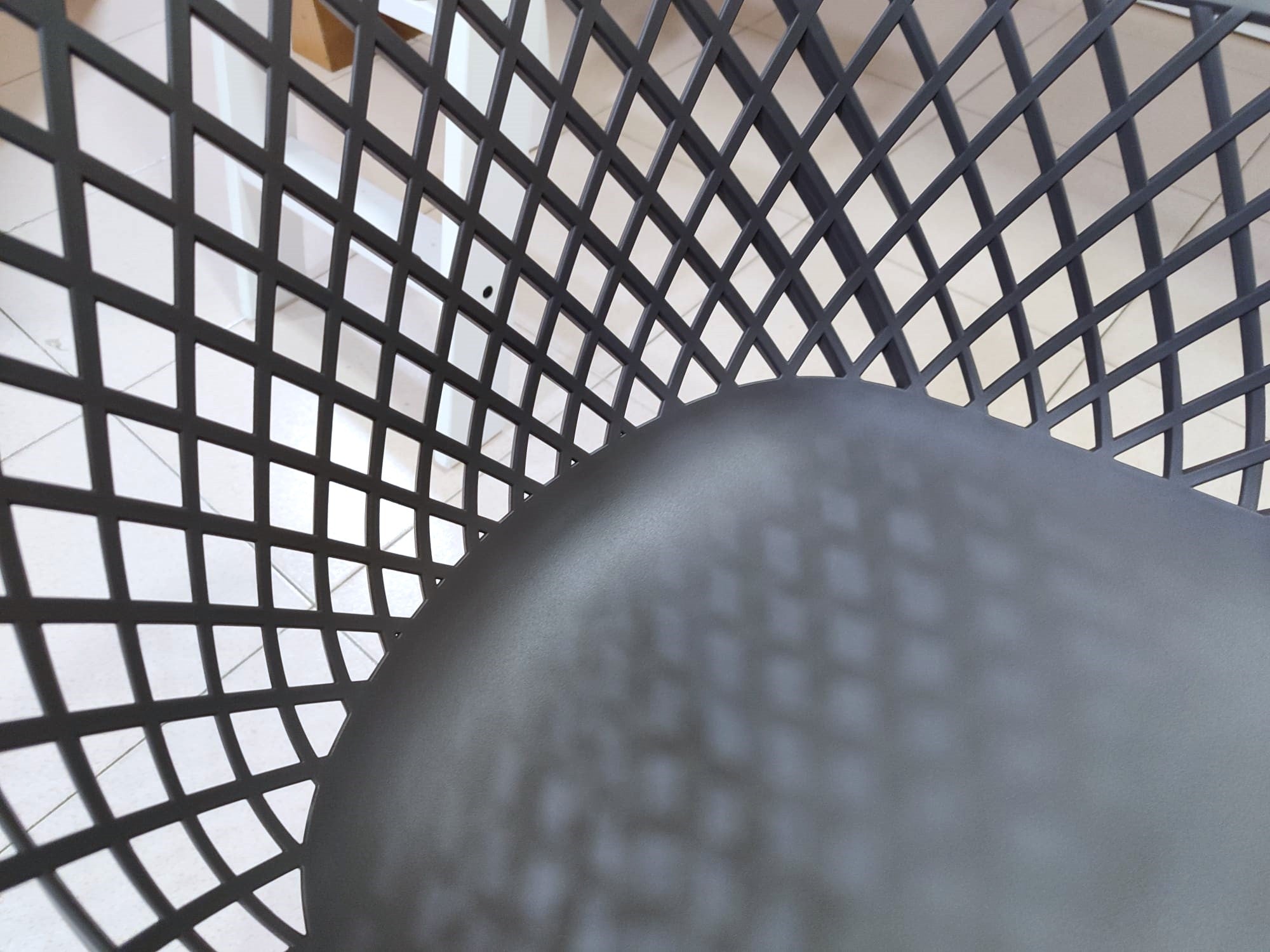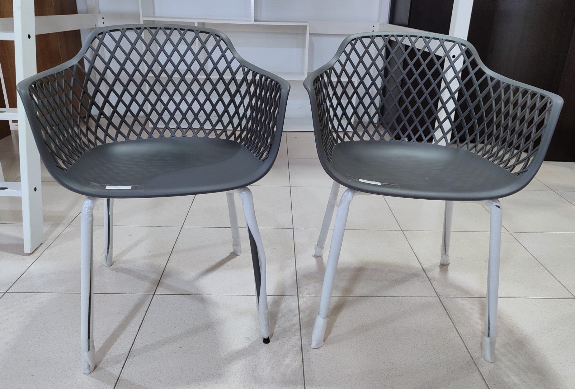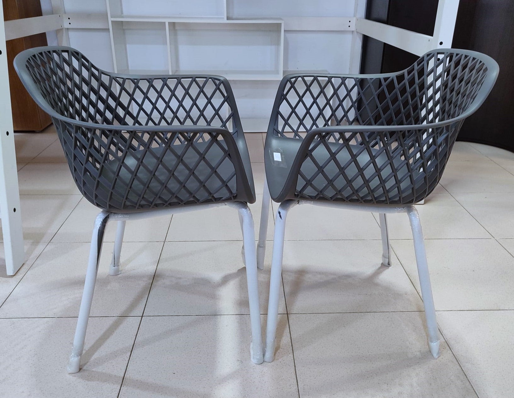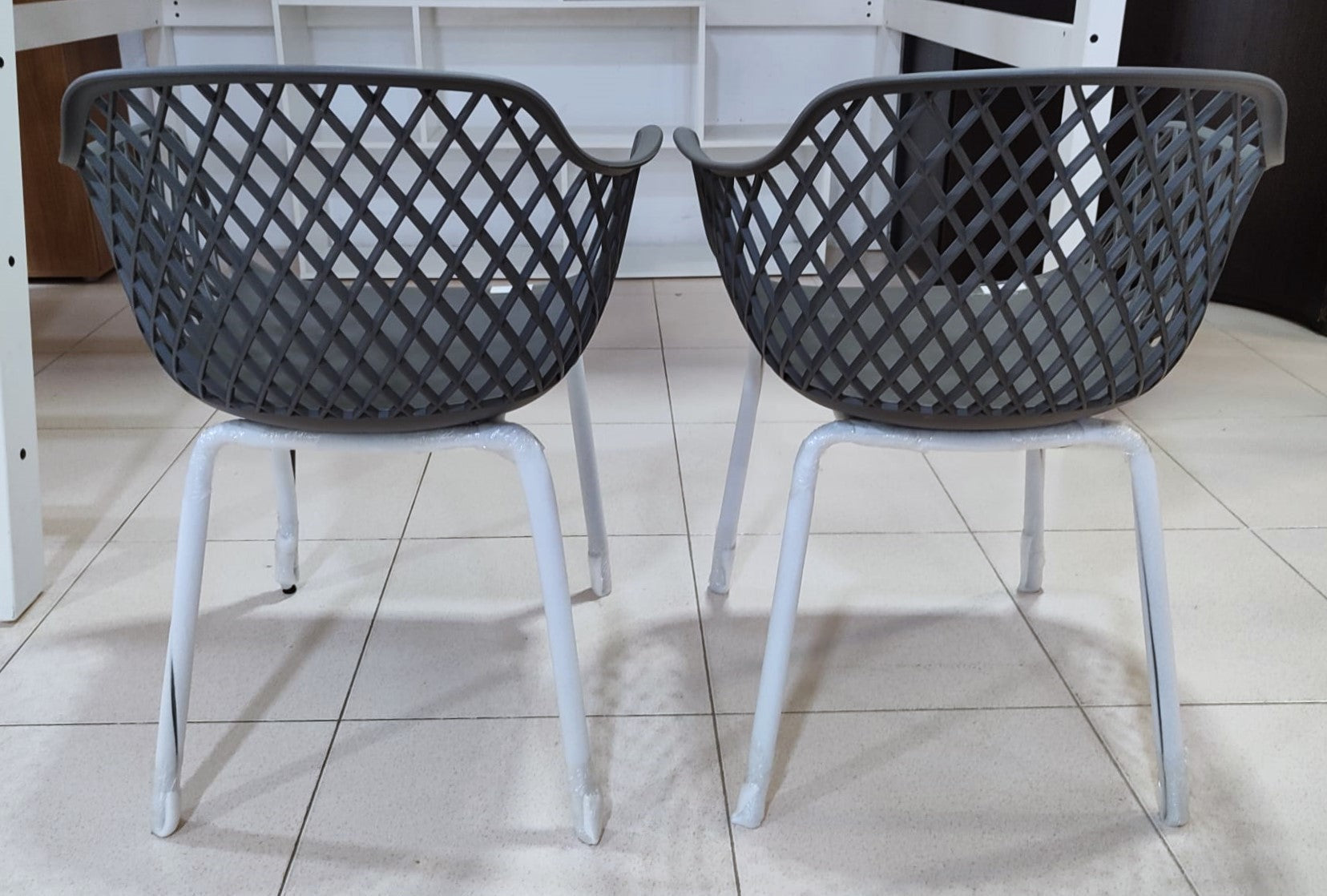 - Par de sillas para interior y exterior, estilo moderno con acabado reticular que facilita la ventilación.