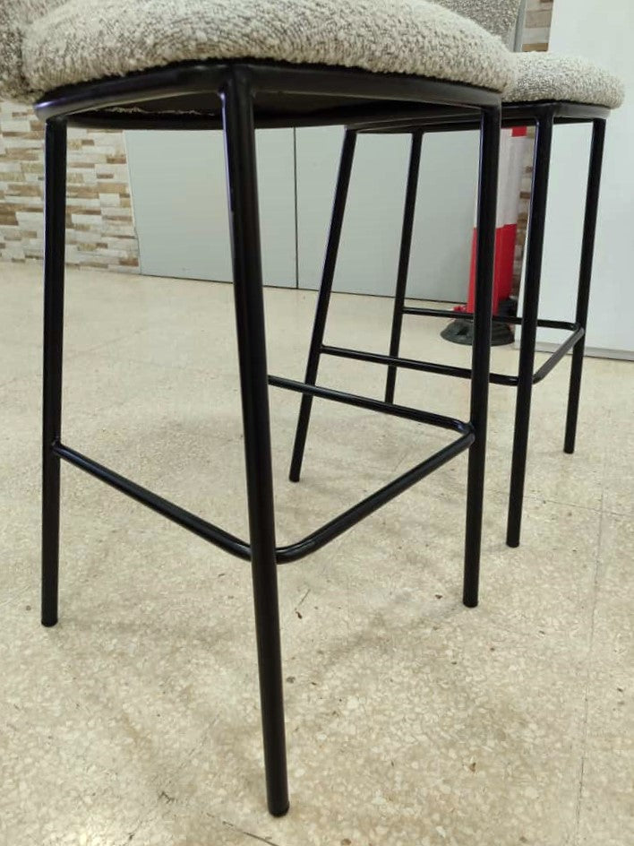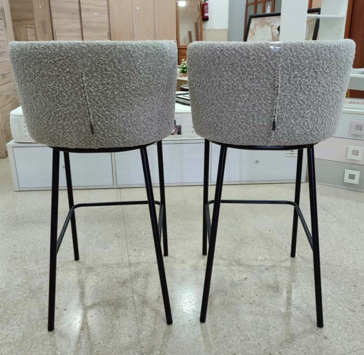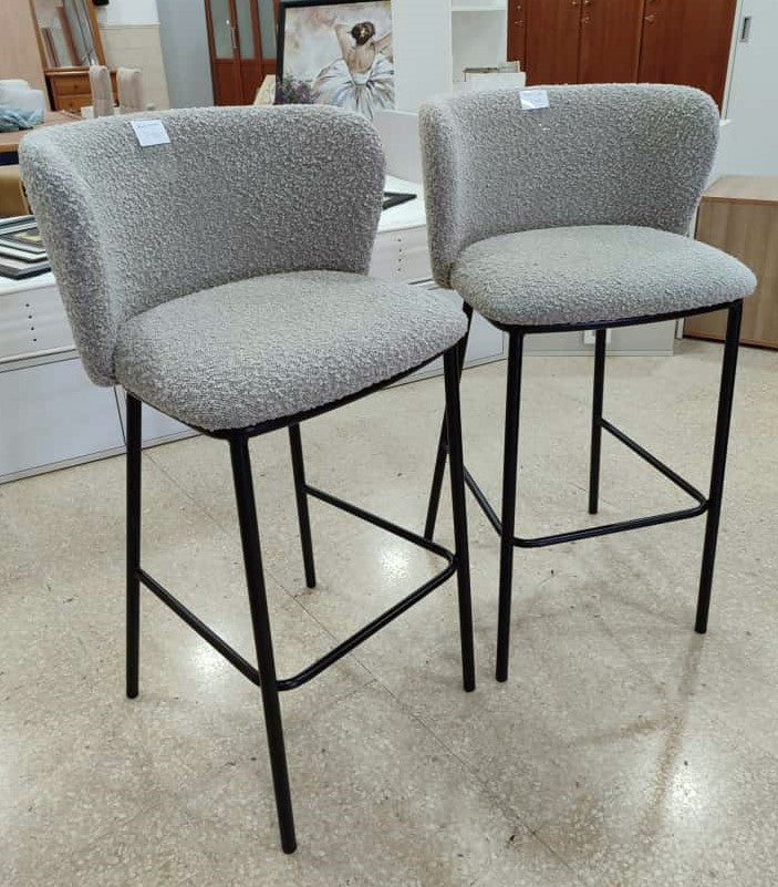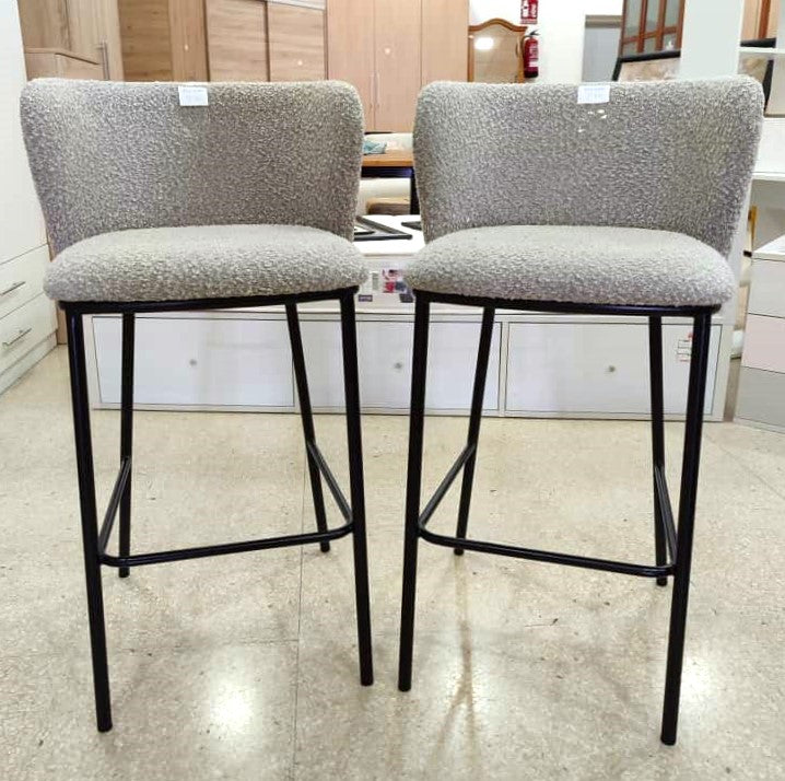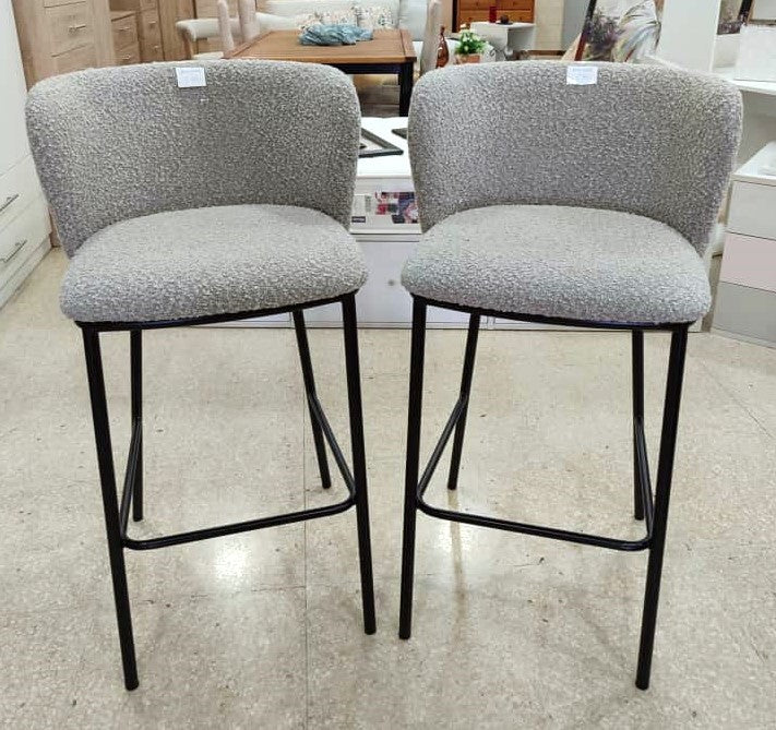 Descripción Par de taburetes altos. Estructura de metal con reposapiés, acabado pintado negro mate. Respaldo lumbar acolchado, envolvente con orejas para apoyar los codos. Asiento acolchado con espuma de poliuretano. Tapizado en chenilla color gris. Se pueden comprar por serado, cada uno por 90€.