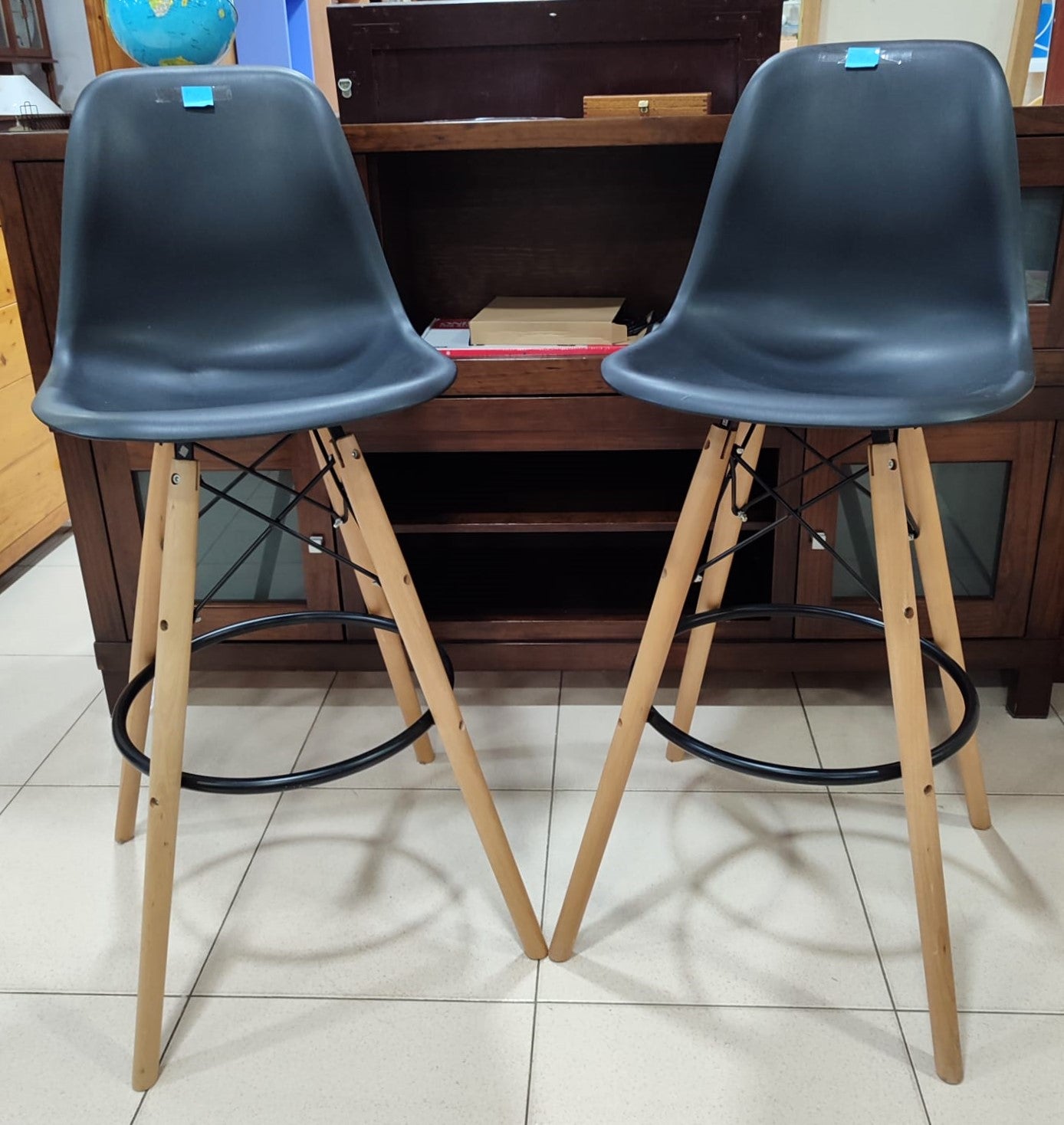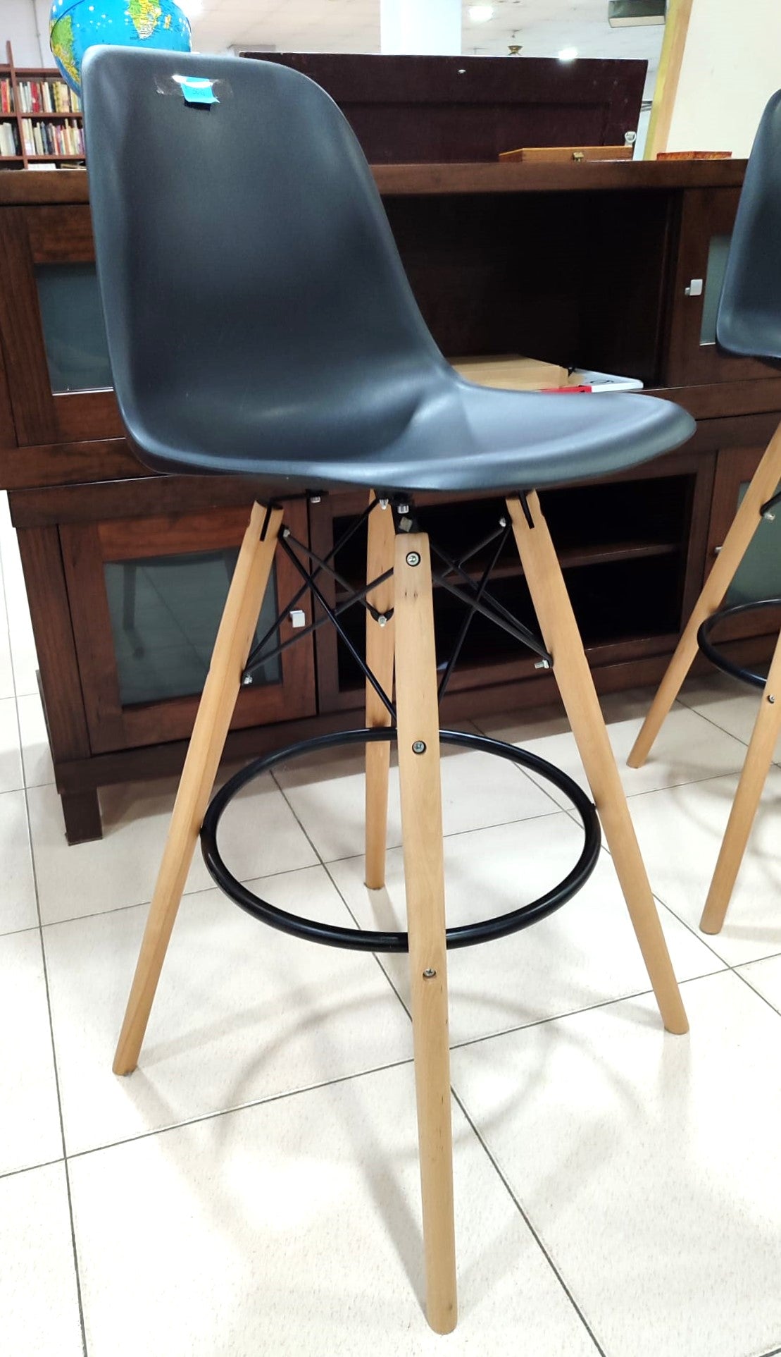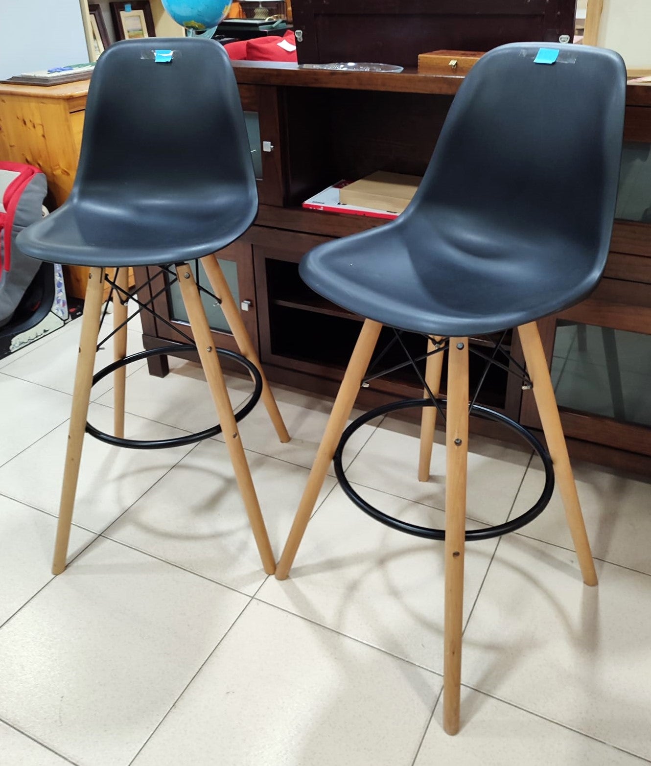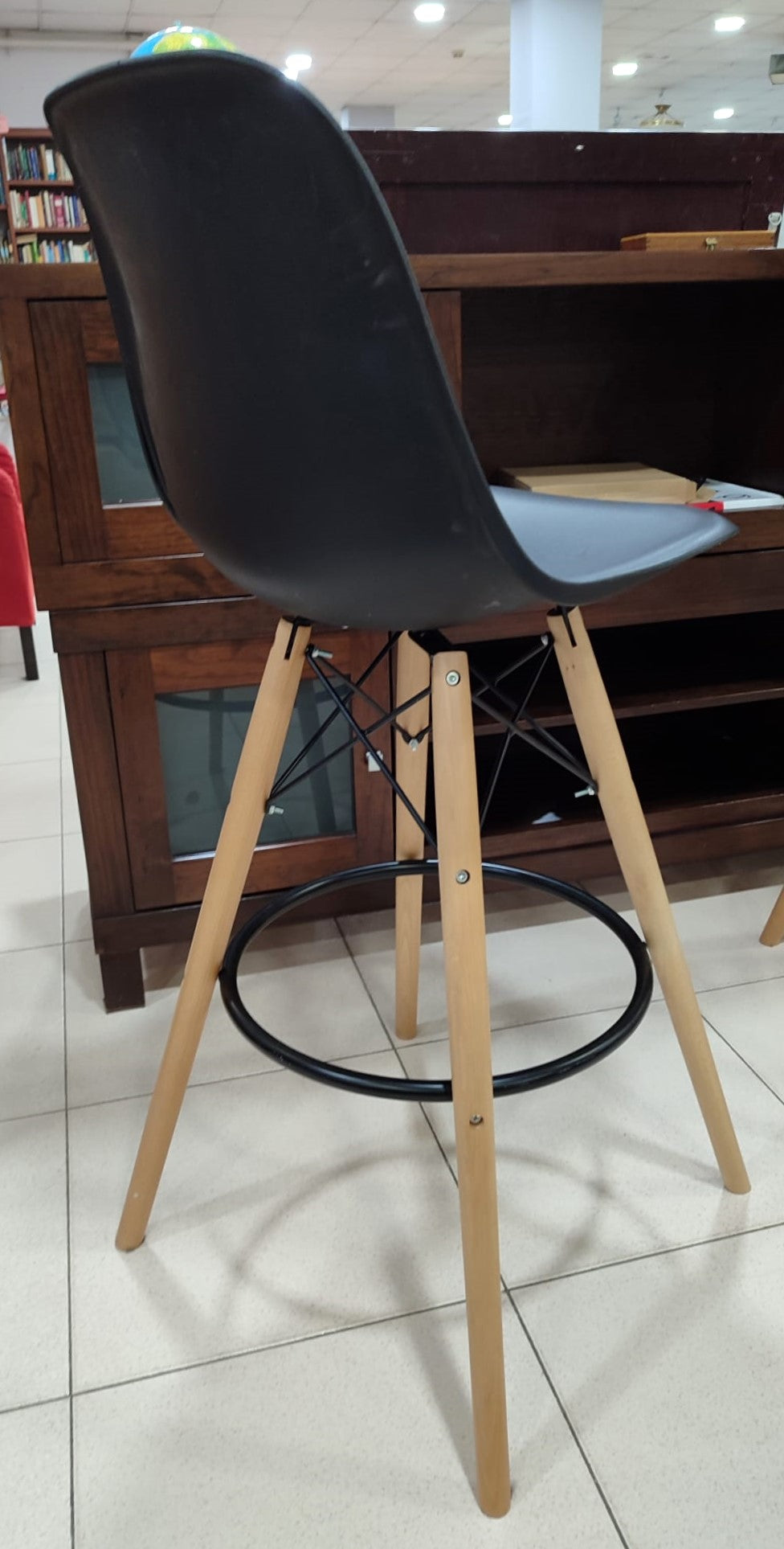 Descripción Taburetes de bar estilo nórdico. Asientos con respaldo integrado, hechos de polipropileno. Estructura y reposapiés de acero lacado en negro. Patas de madera de haya. Recomendación de peso máximo: 150 kg.
